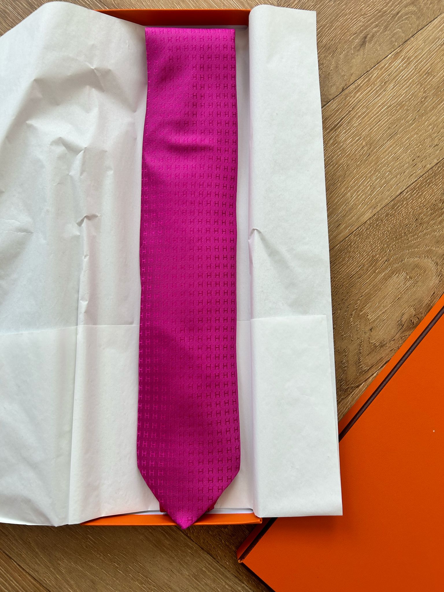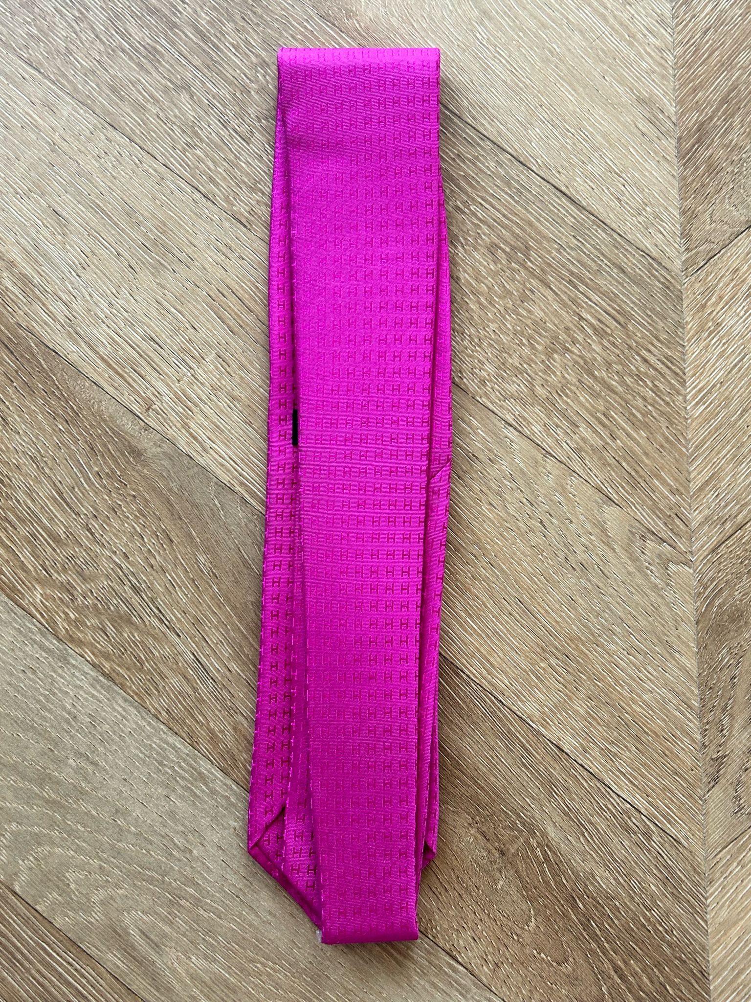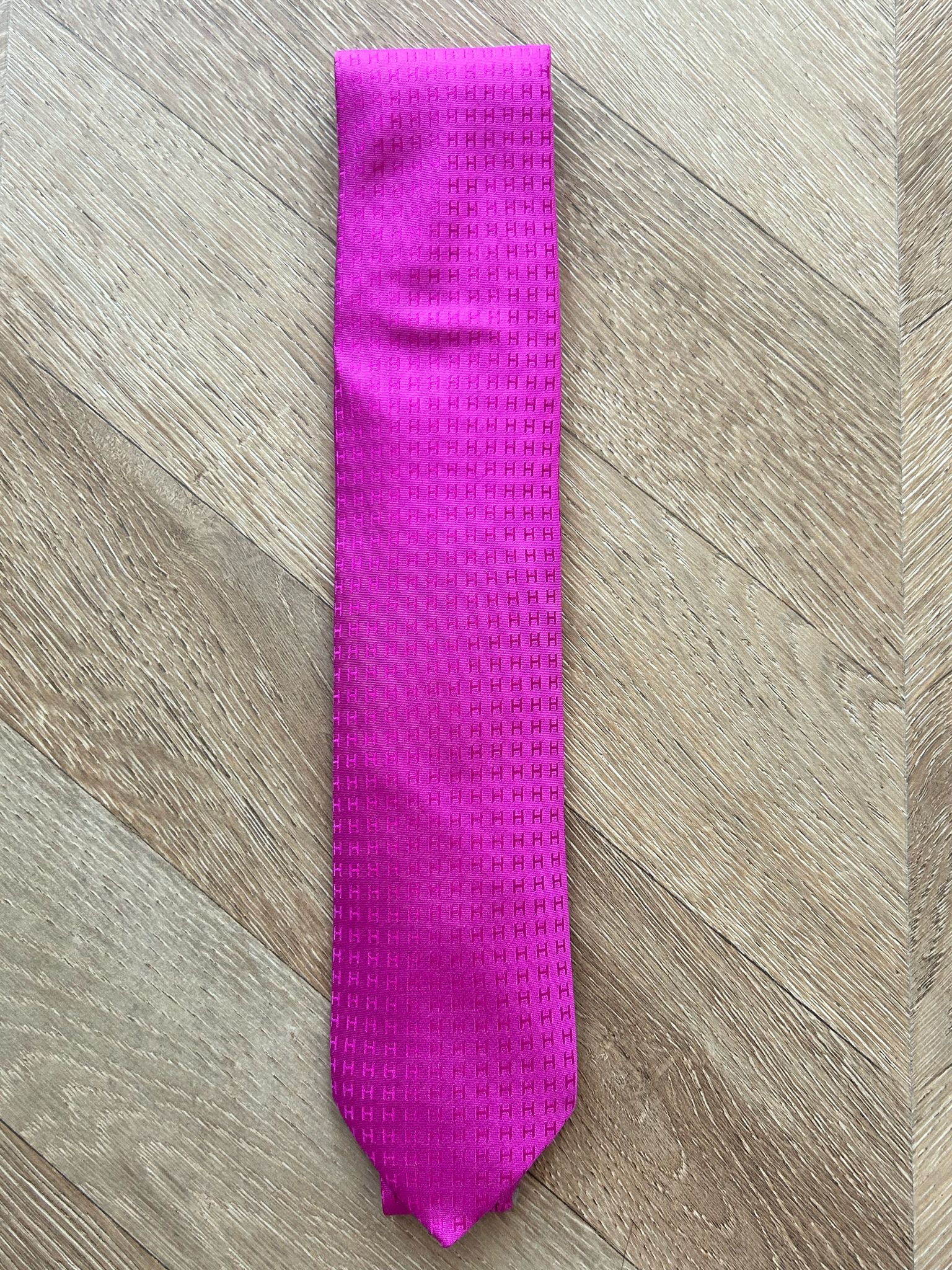 Hermès pink silk tie. Monogram h. Never worn. Measures approximately 7.5cm wide at the widest point. Sold with box and tissue paper. Shop value €245