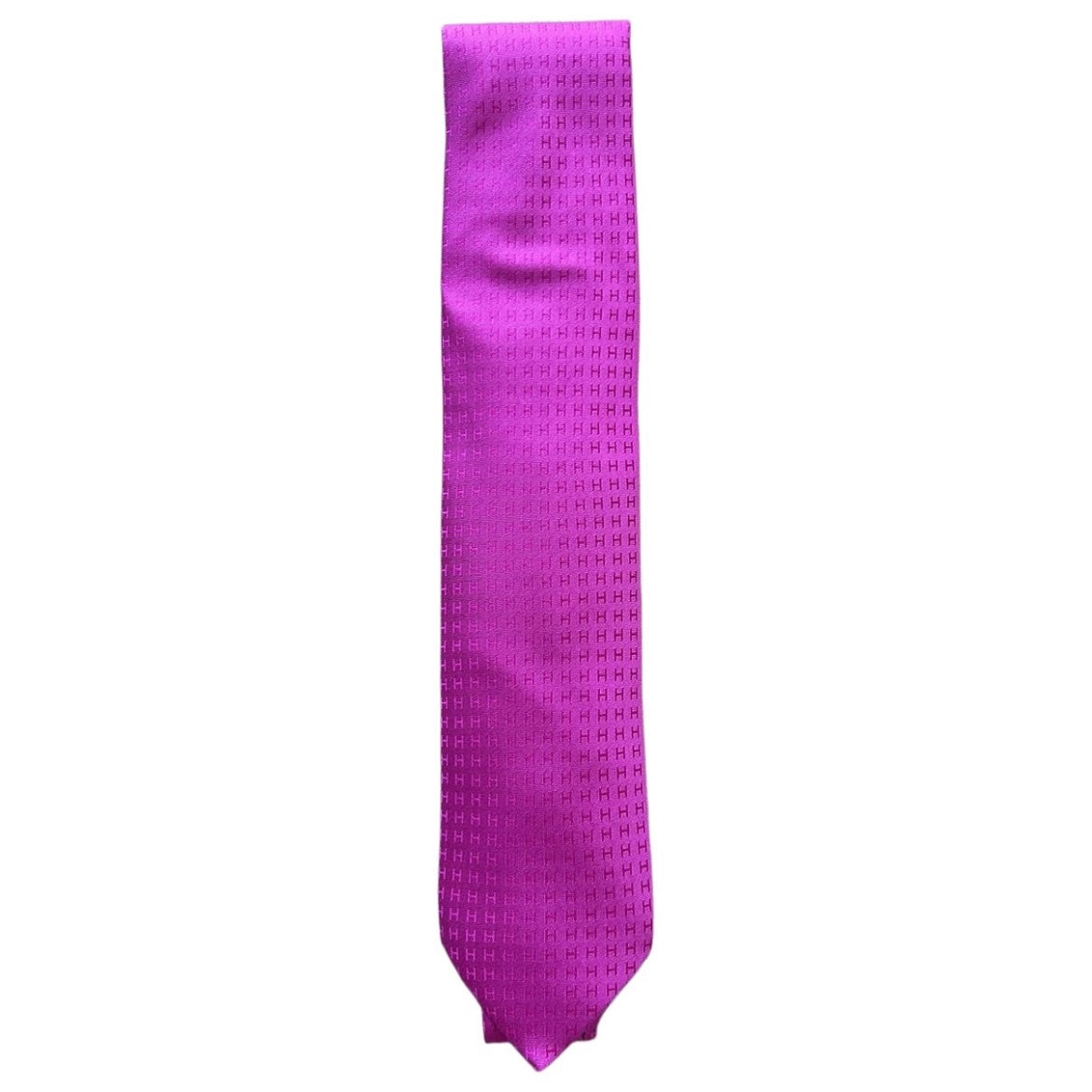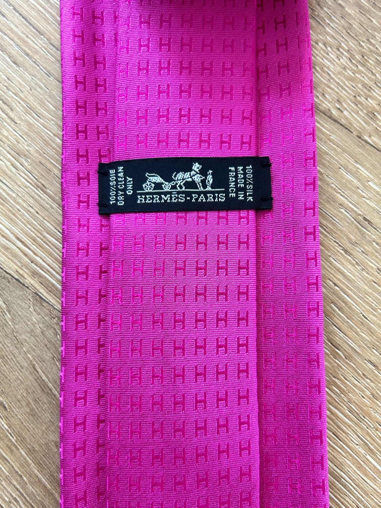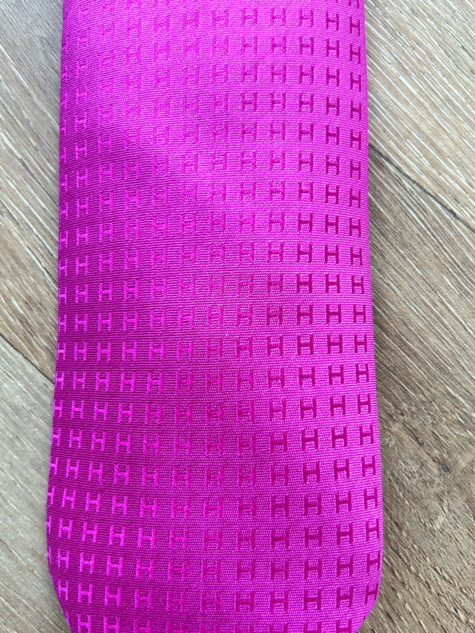 Hermès pink silk tie. Monogram h. Never worn. Measures approximately 7.5cm wide at the widest point. Sold with box and tissue paper. Shop value €245