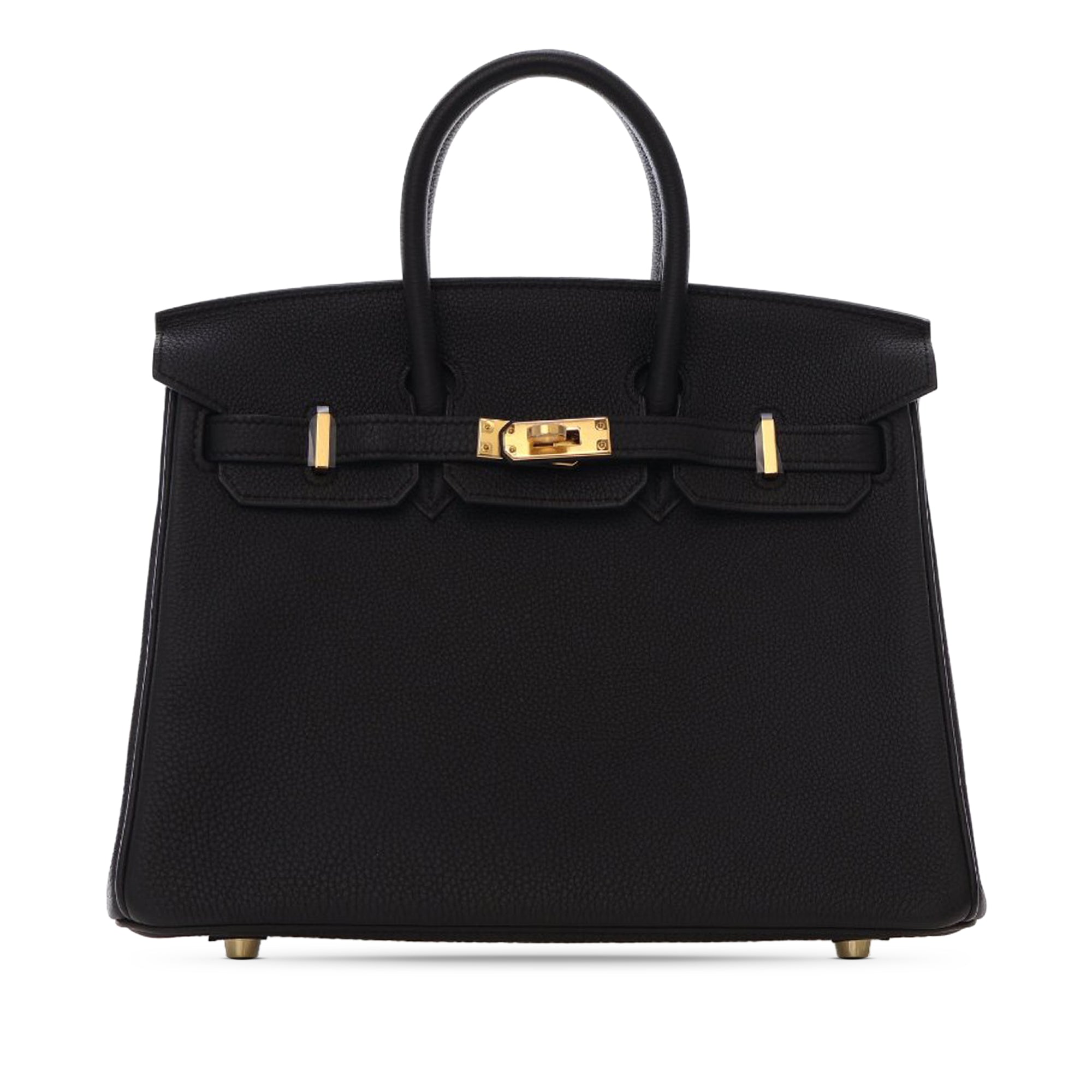 This Birkin 25 features a Togo leather body in Noir color, rolled leather handles, a front flap with turn-lock closure, and interior slip and zip pockets. Inclusion: Dust bag, box. Retail Price: 32500.00