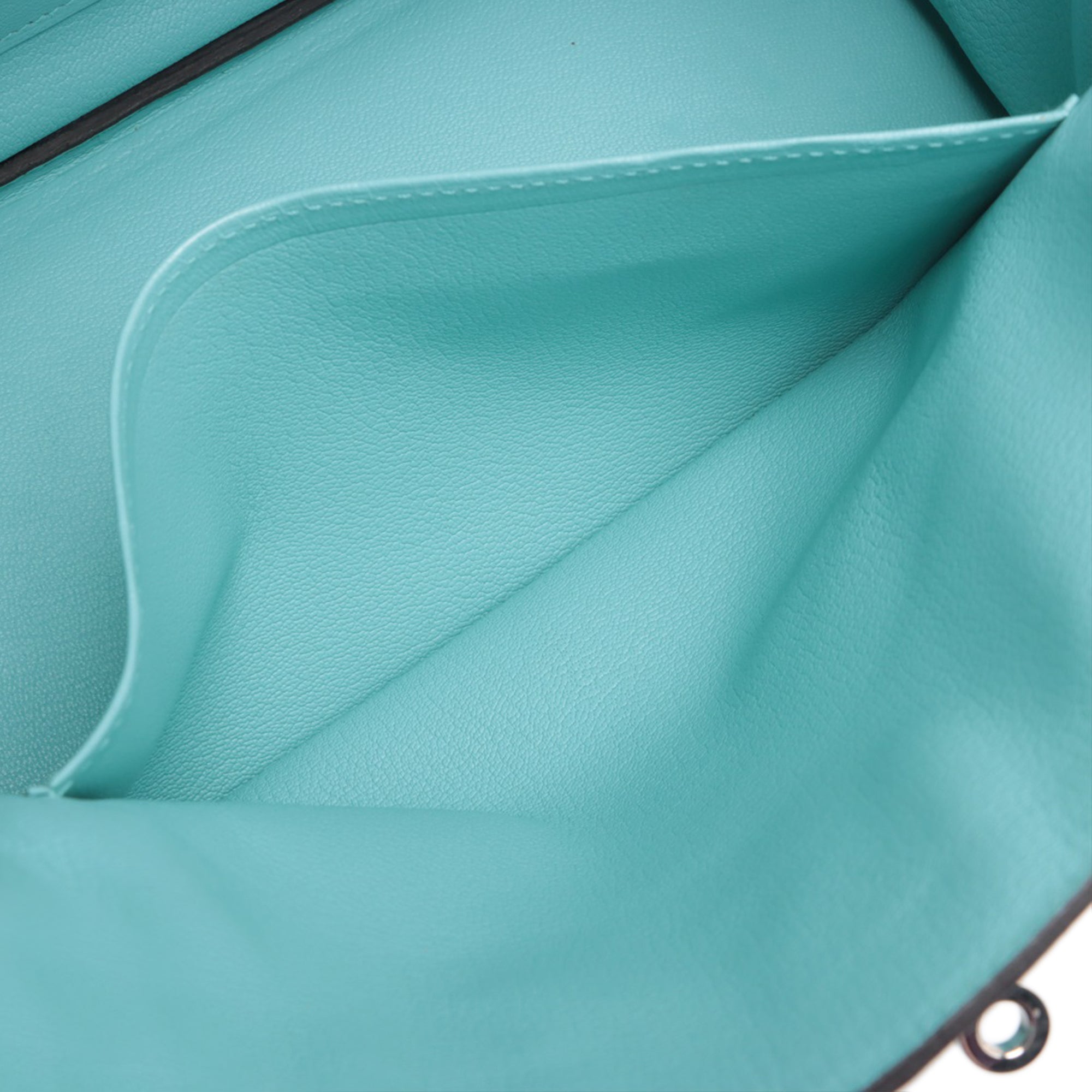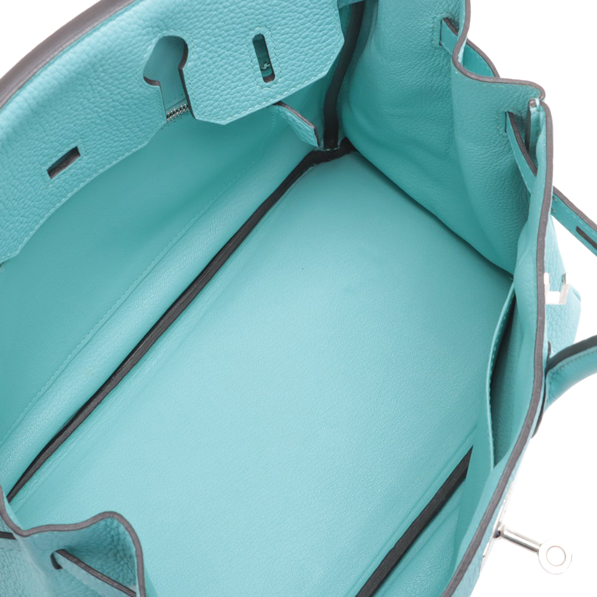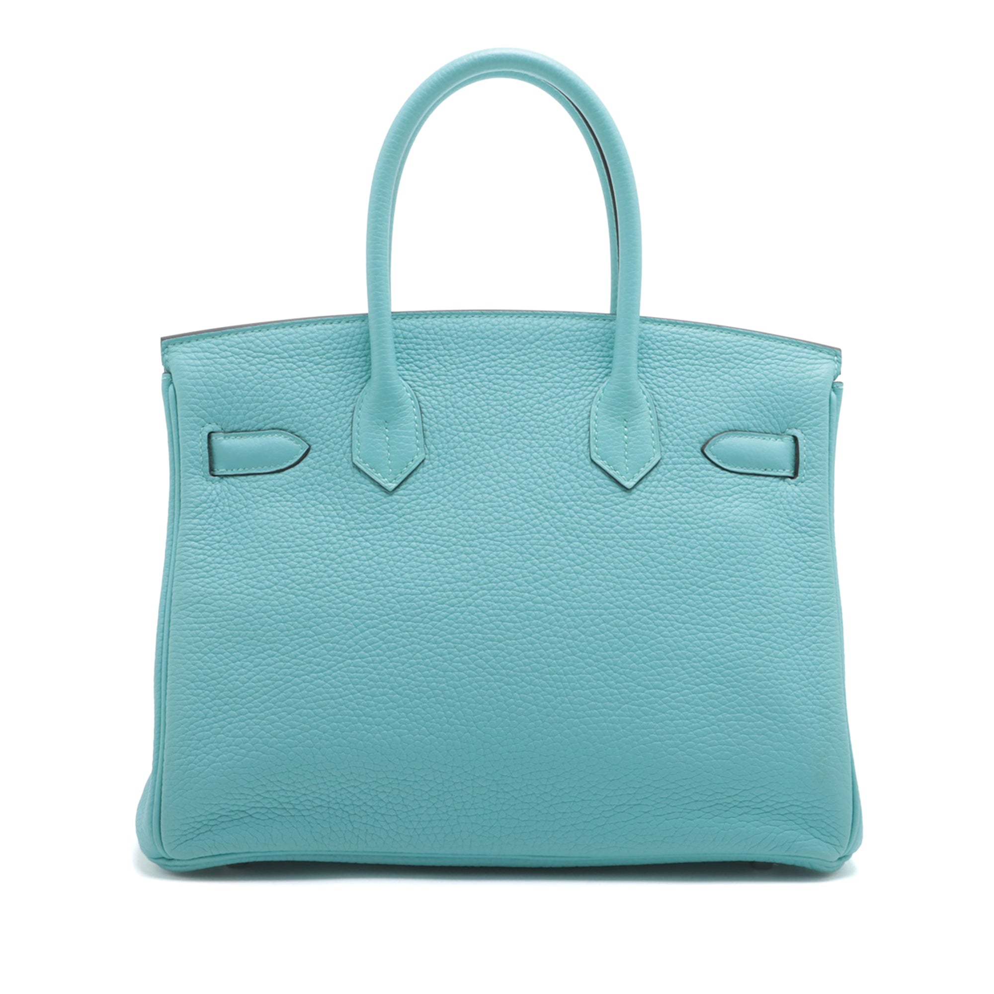 The Birkin 30 features a togo leather body in Blue Atoll color, rolled leather handles, a front flap with a twist lock closure, and interior zip and slip pockets. Retail Price: 29000.00