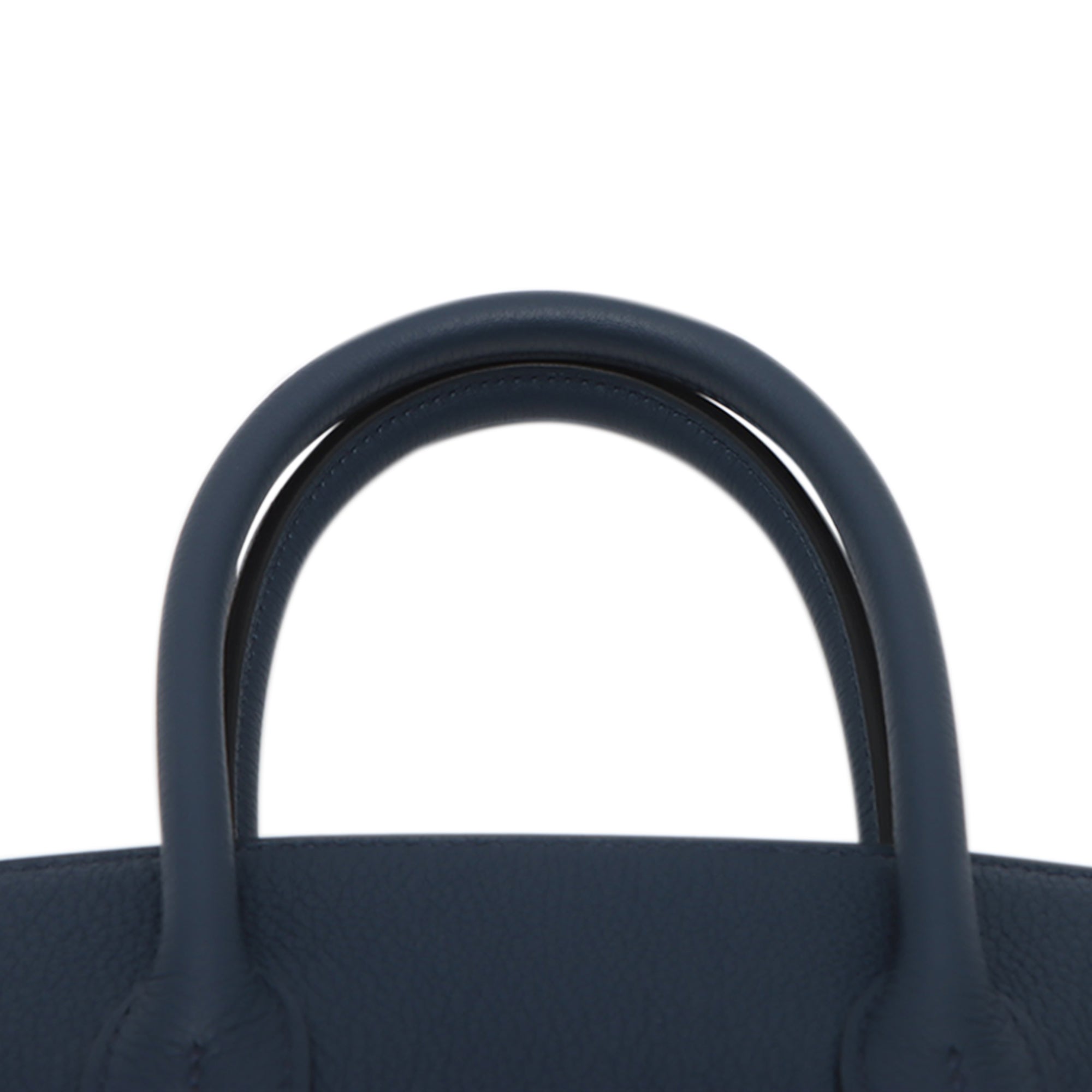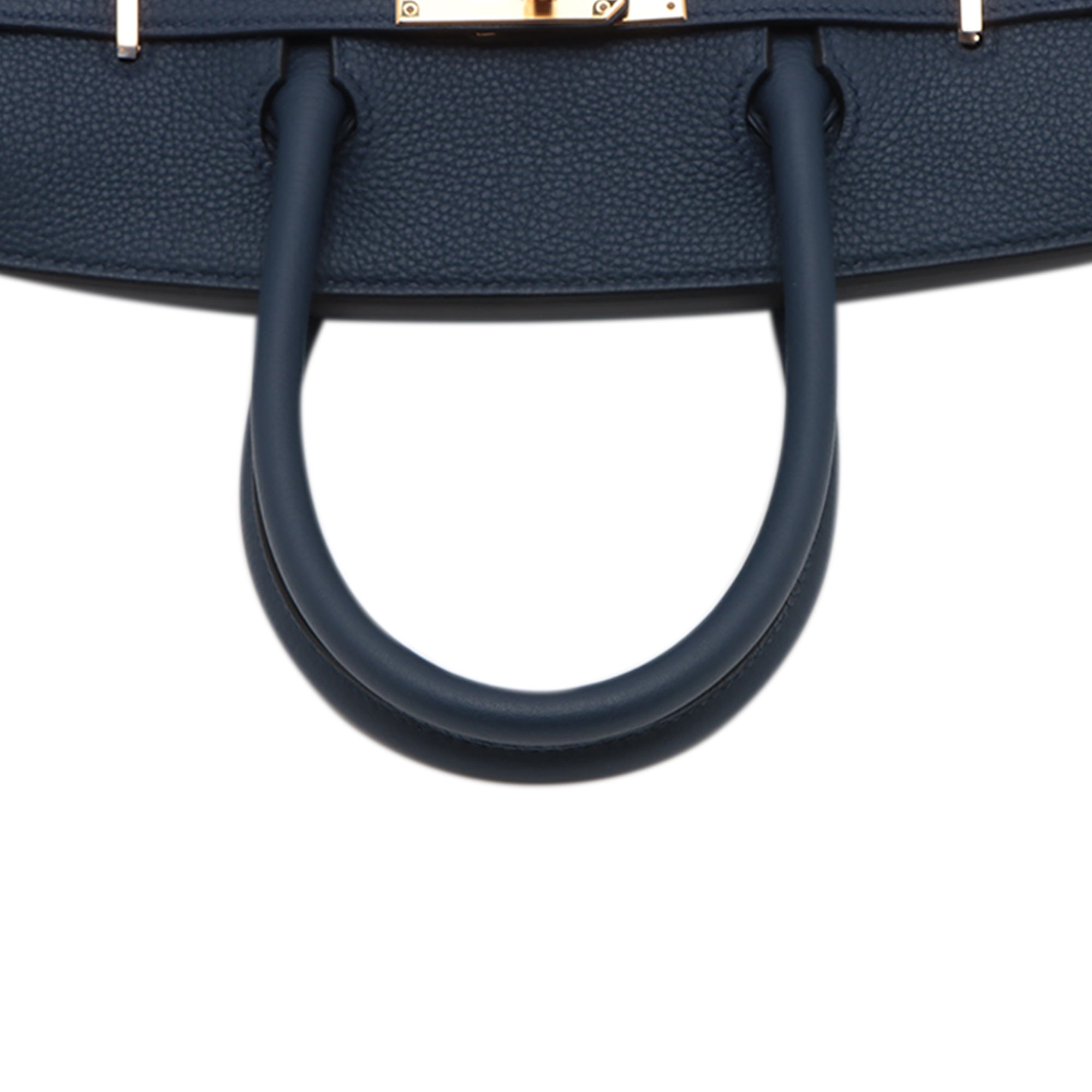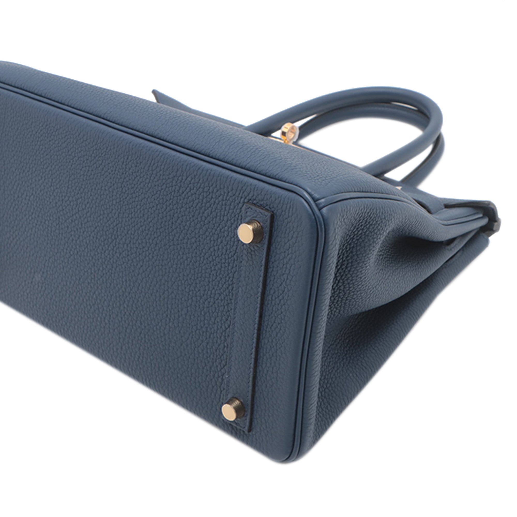 The Birkin 30 features a leather body, rolled leather top handles, a front flap with a metal lock closure, and interior zip and slip pockets. Retail Price: 29000.00