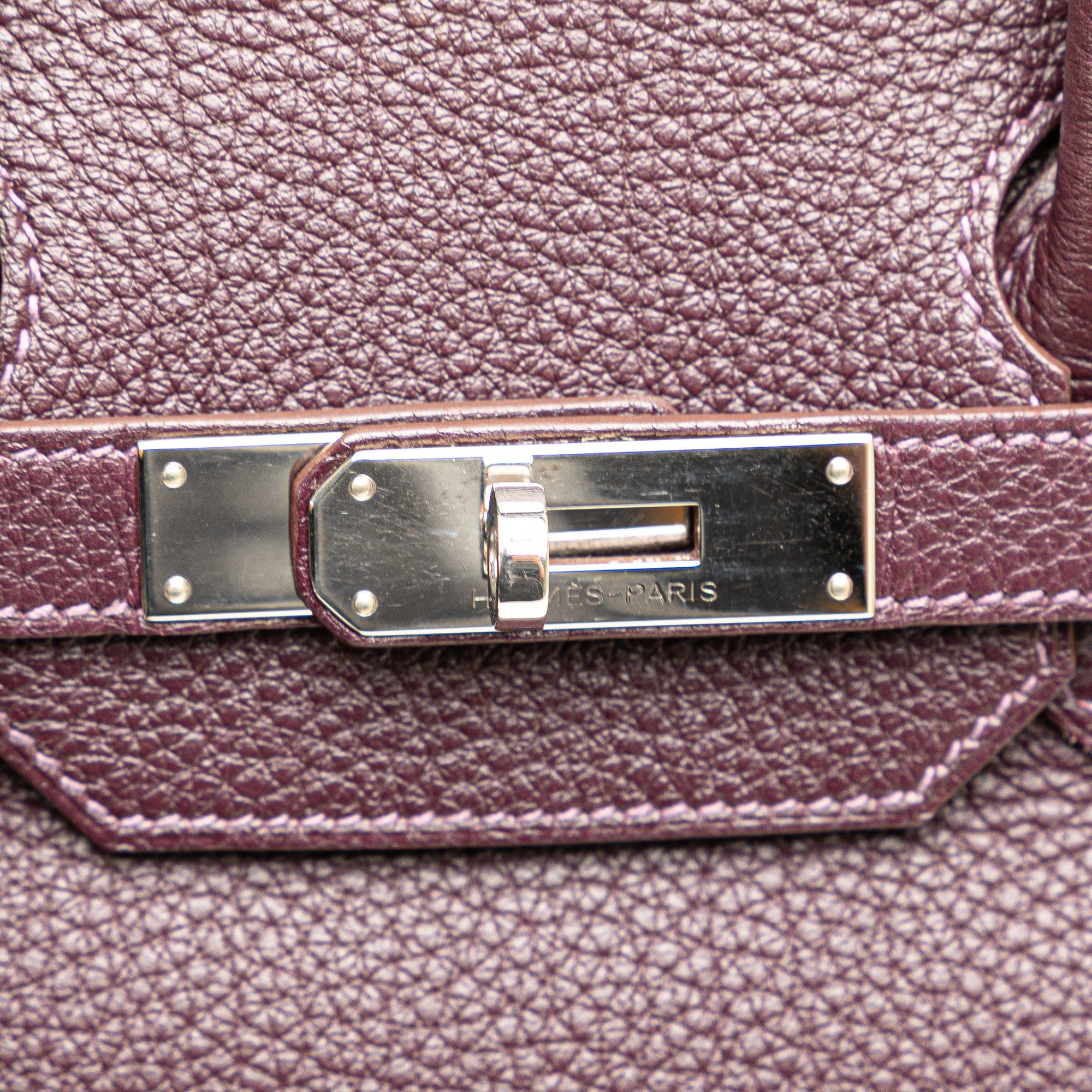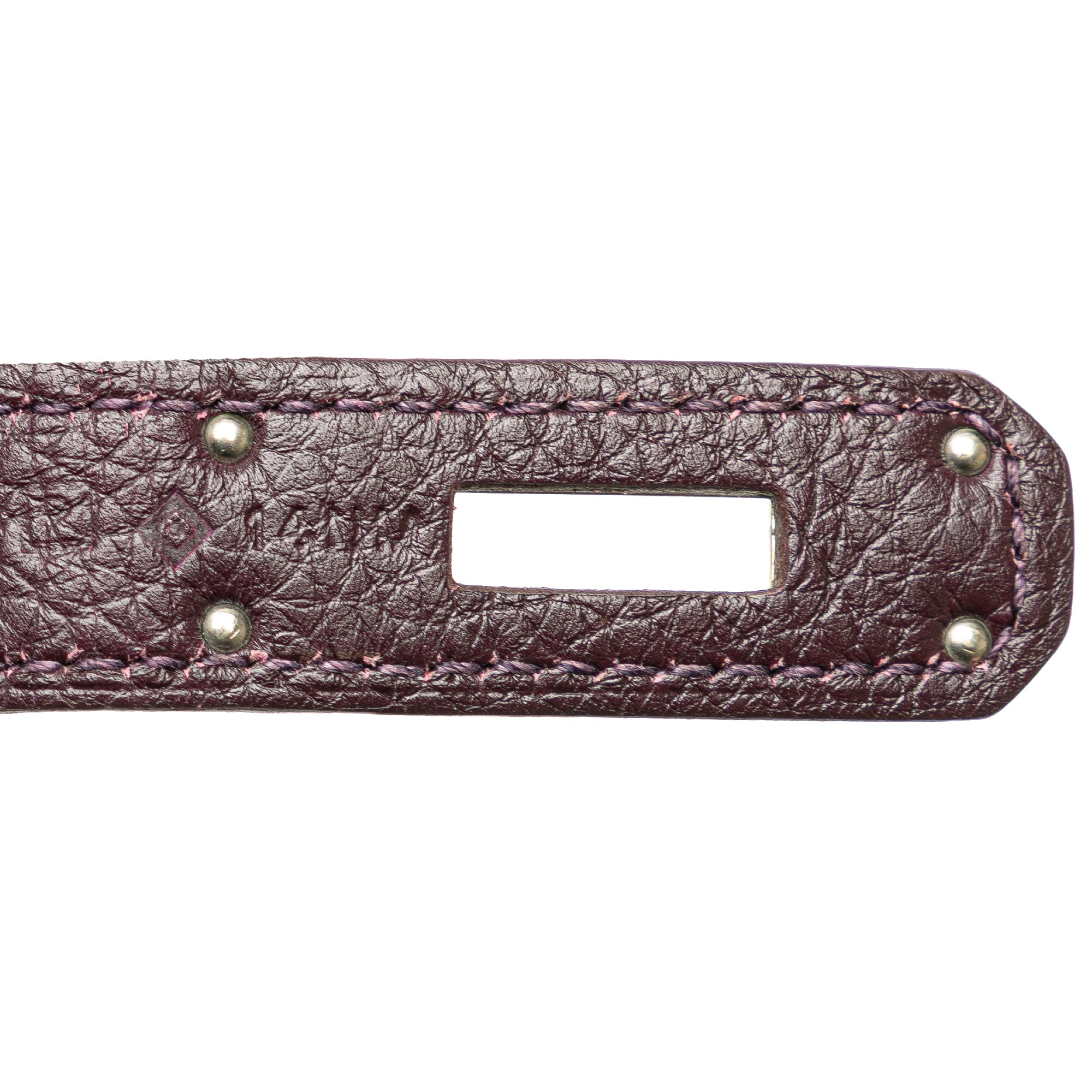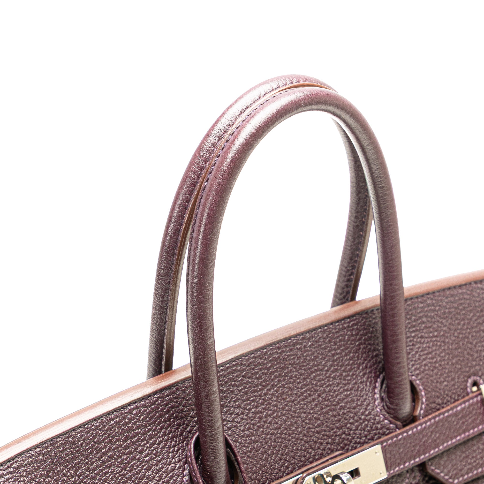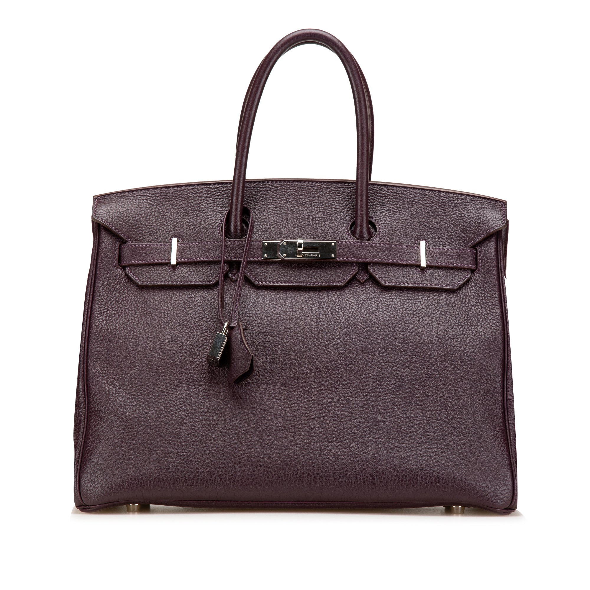 This Birkin 35 features a Togo leather body in Raisin color, rolled leather handles, a front flap with a strap and turn lock closure, and interior zip and slip pockets. Retail Price: 12700.00