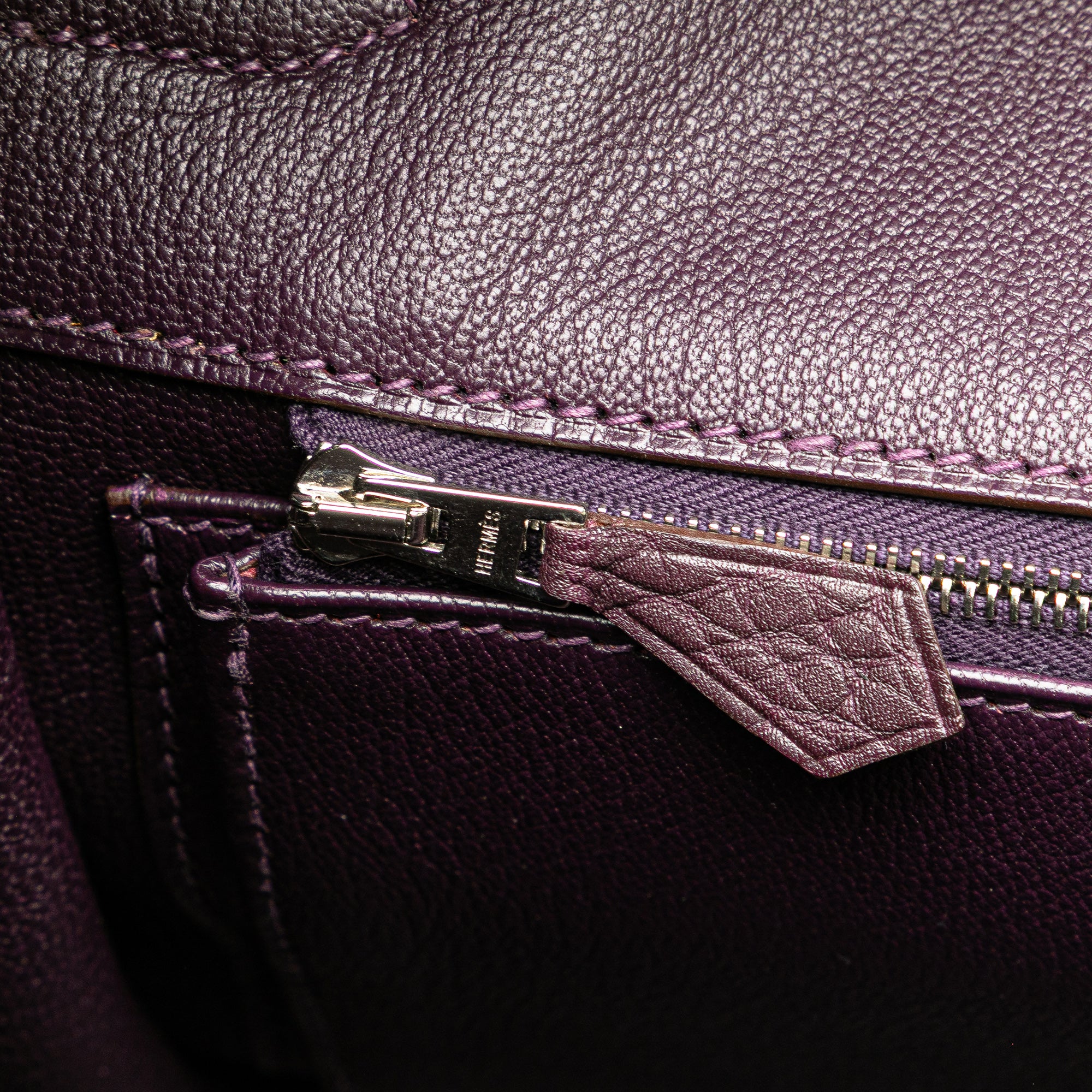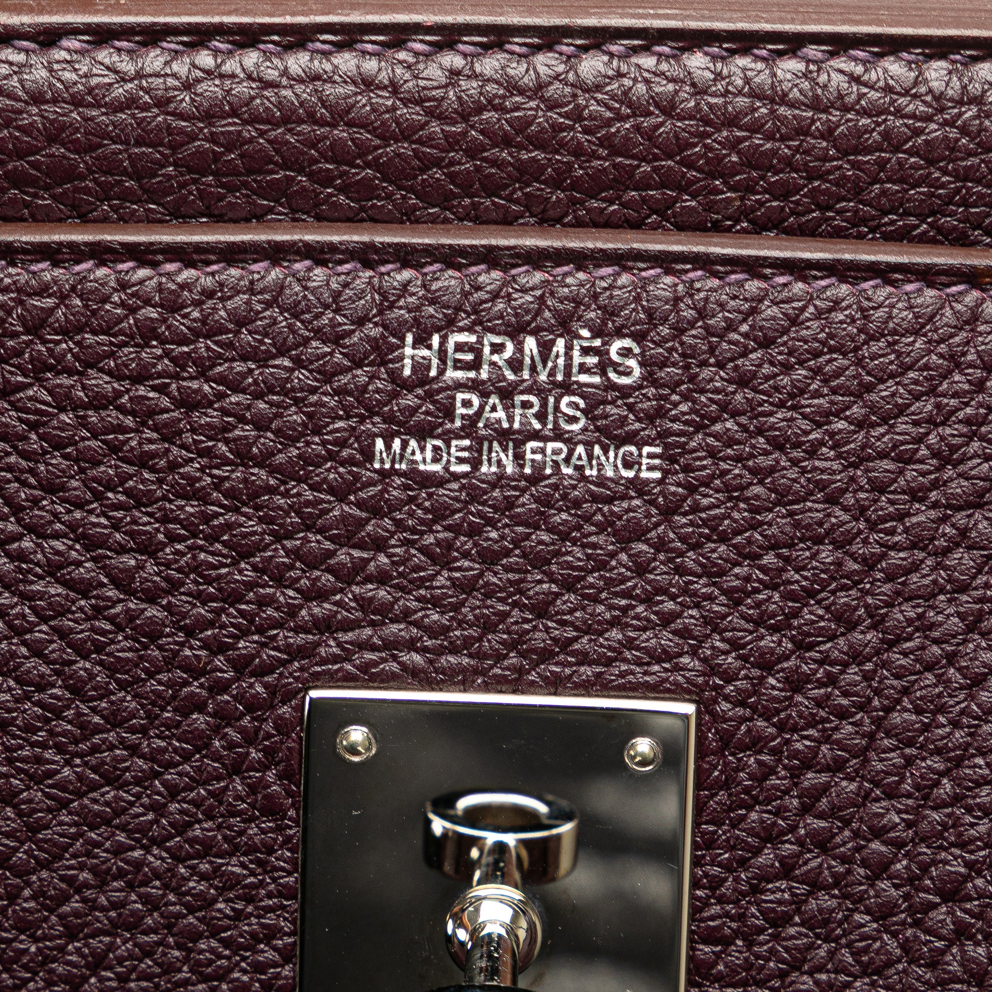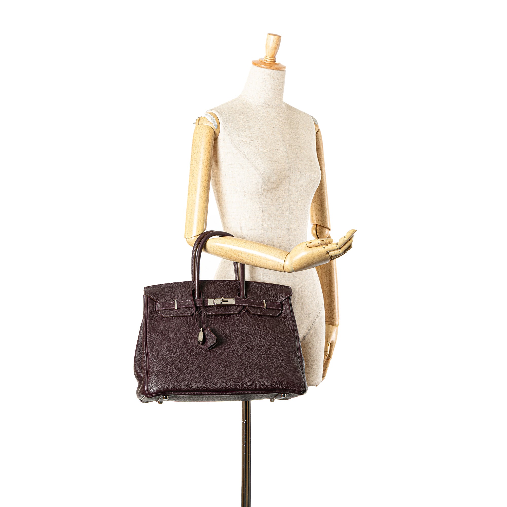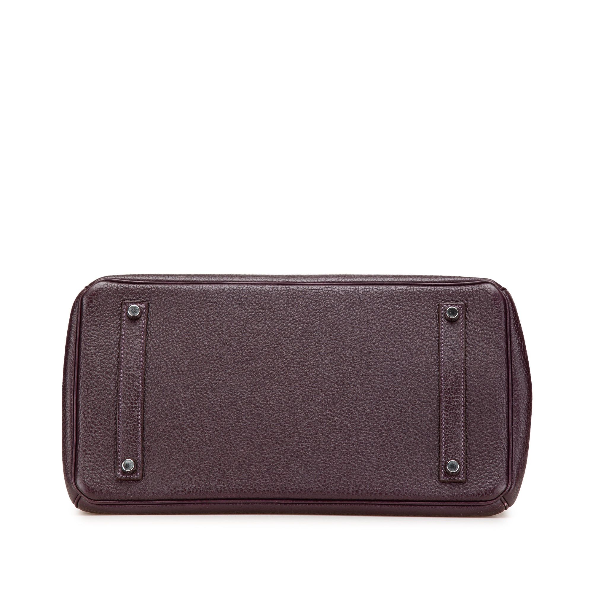 This Birkin 35 features a Togo leather body in Raisin color, rolled leather handles, a front flap with a strap and turn lock closure, and interior zip and slip pockets. Retail Price: 12700.00