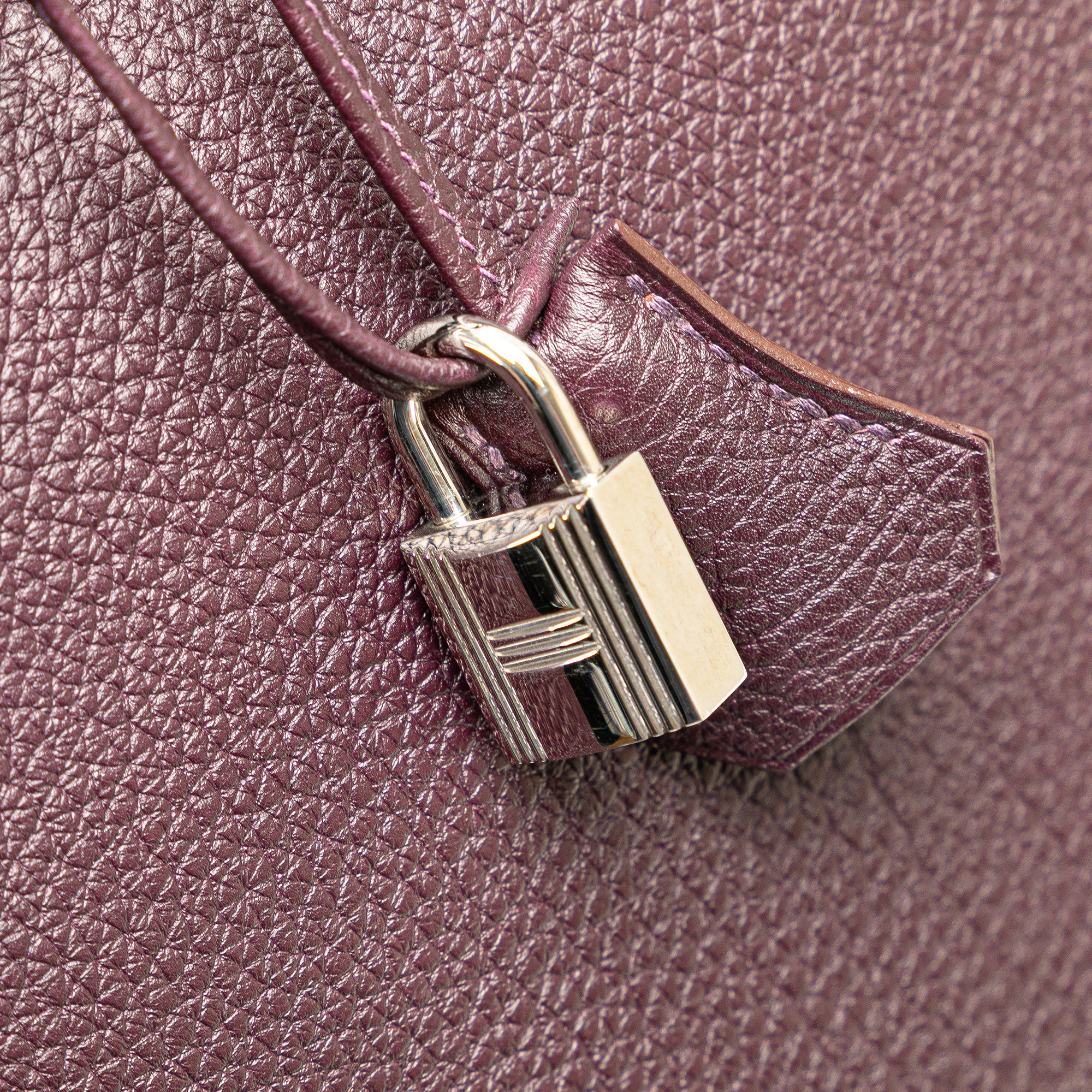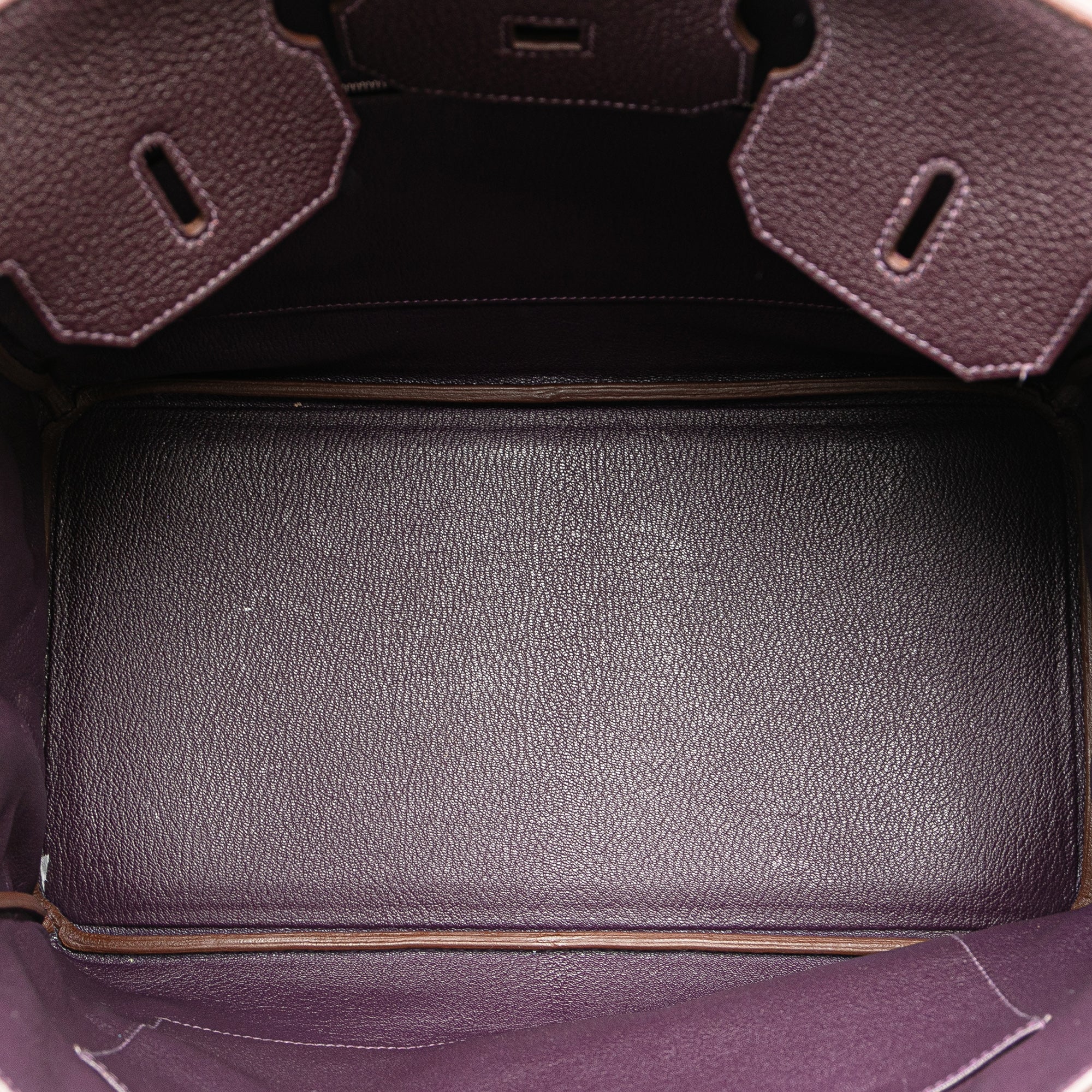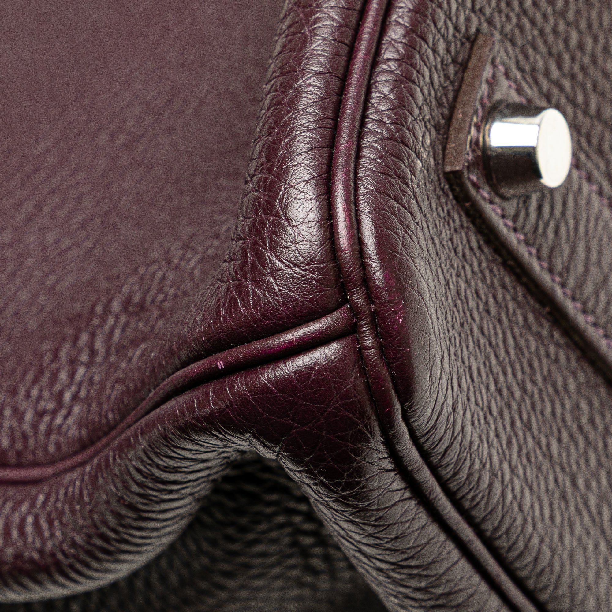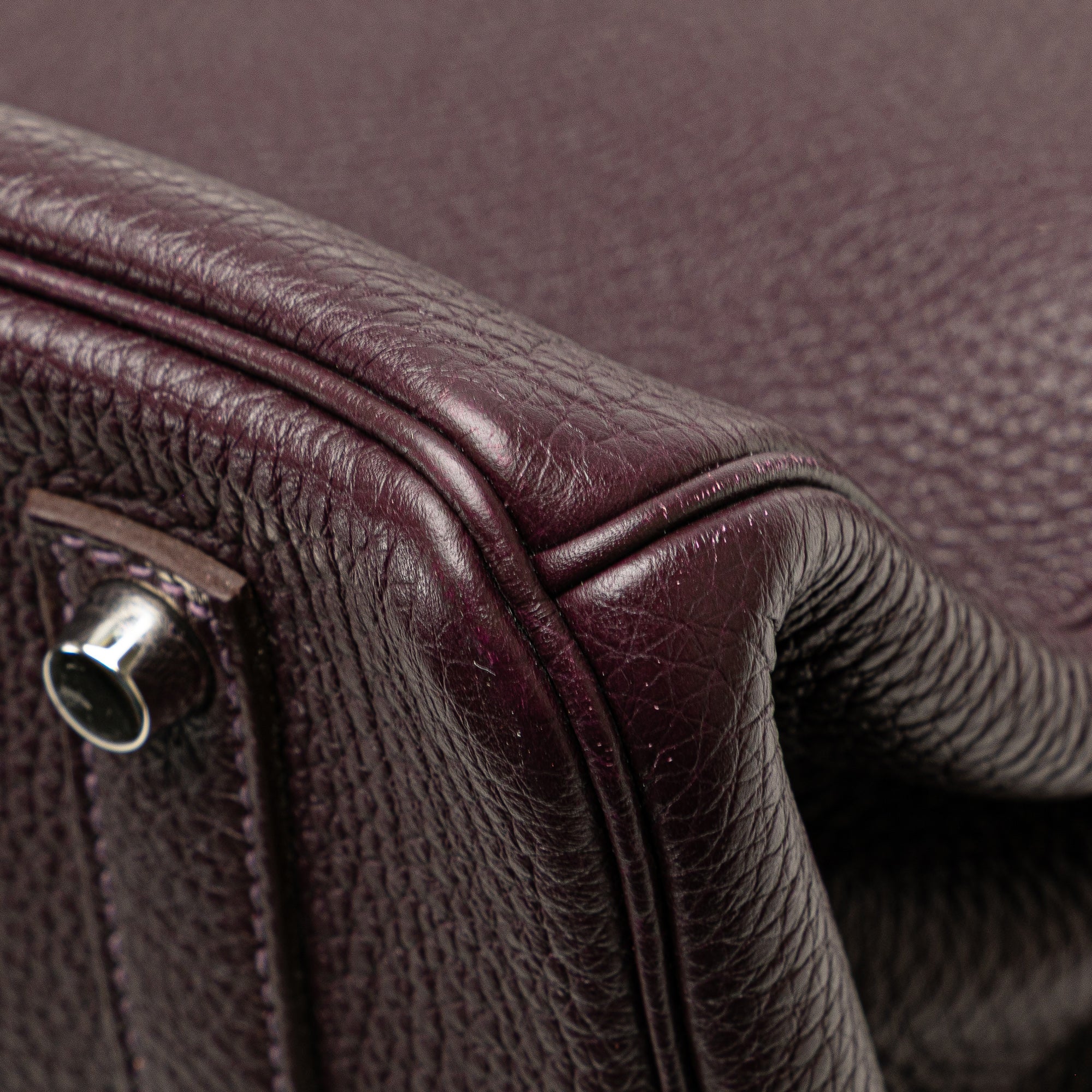 This Birkin 35 features a Togo leather body in Raisin color, rolled leather handles, a front flap with a strap and turn lock closure, and interior zip and slip pockets. Retail Price: 12700.00