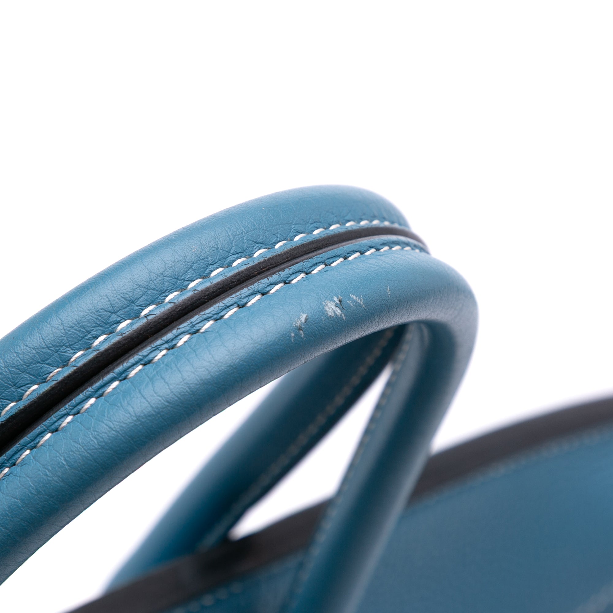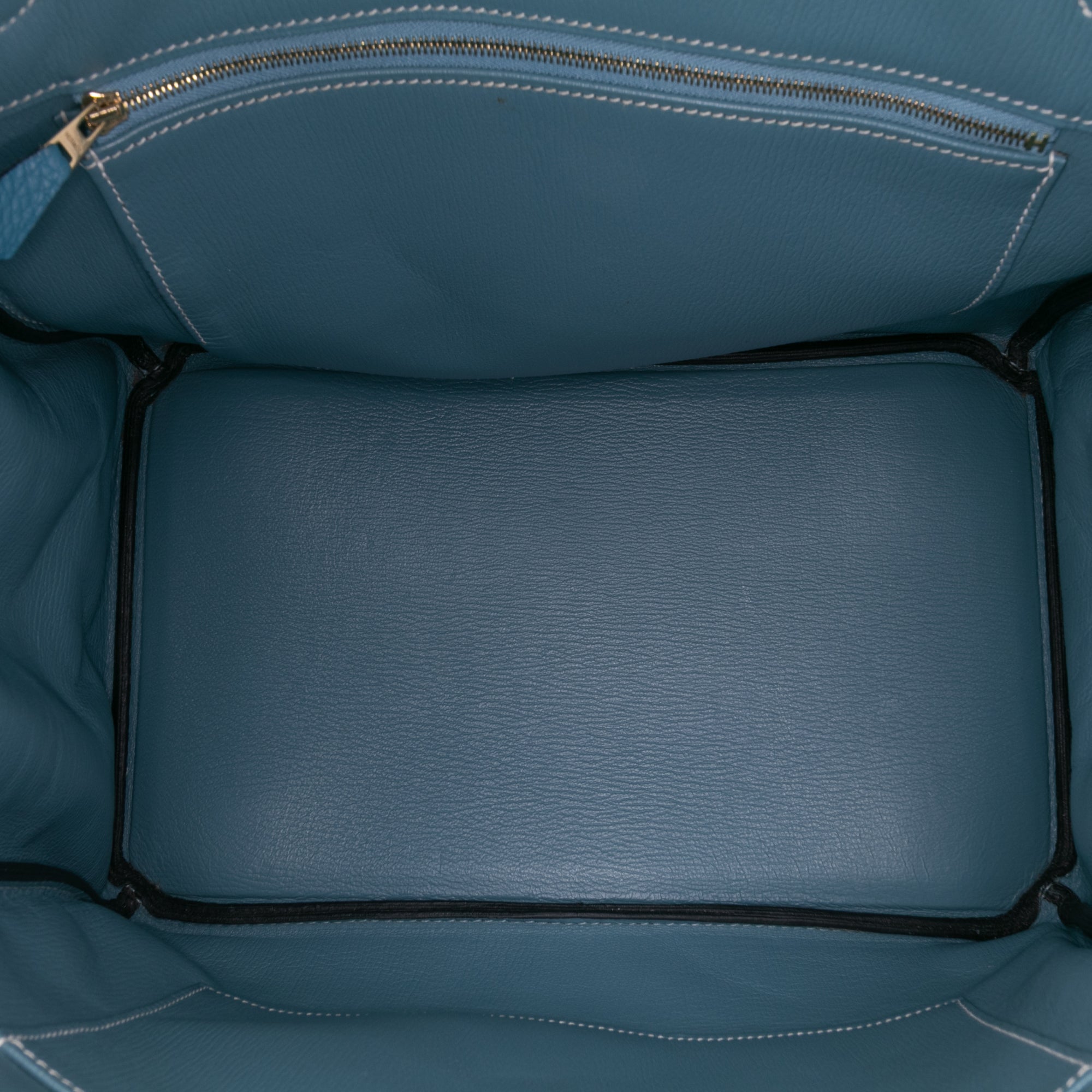 This Birkin 35 features a Togo leather body in Cobalt color, rolled leather handles, a front flap with turn-lock closure, gold hardware, and interior open and zip pockets. Inclusion: Dust bag. Retail Price: 11300.00