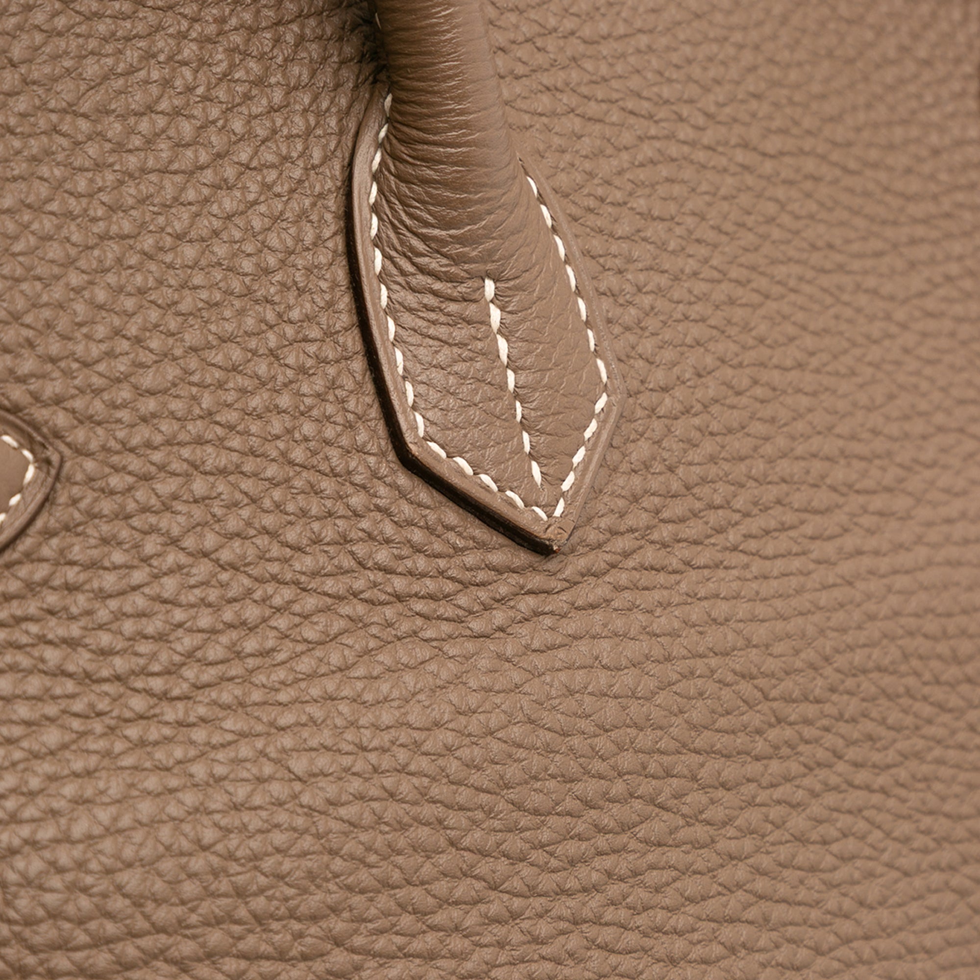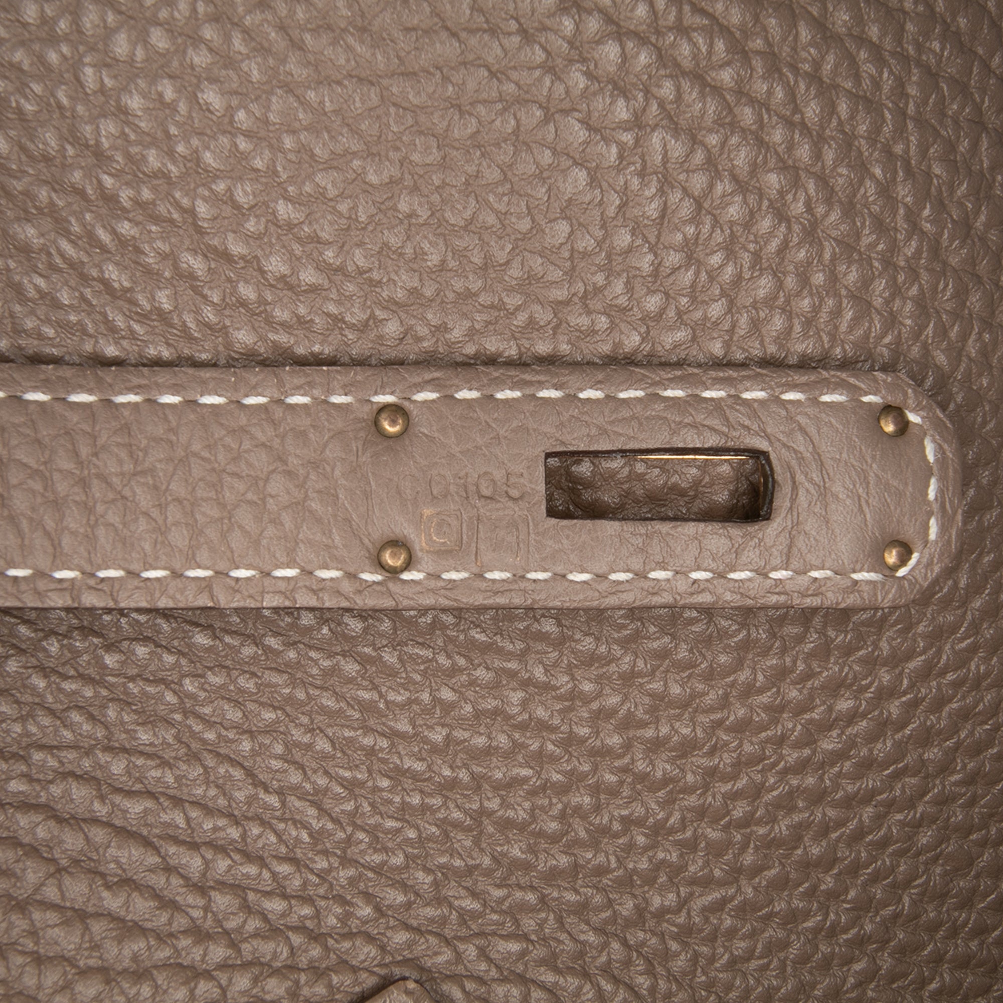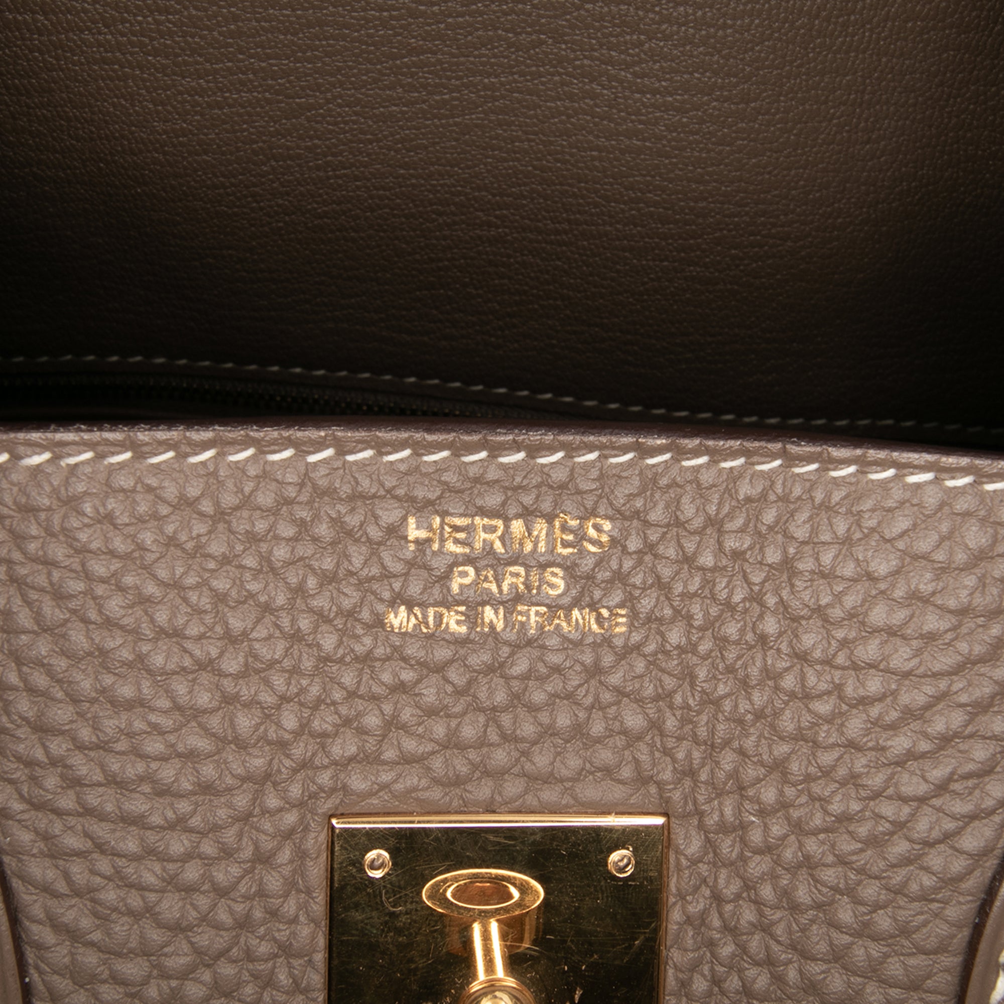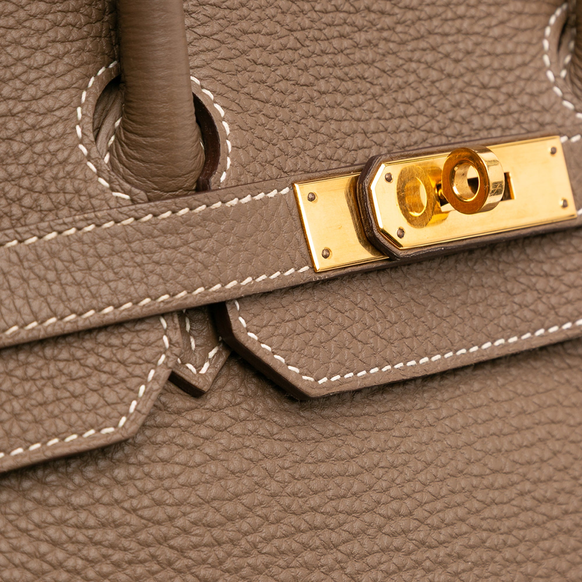 The Birkin features a Togo leather body in Etoupe color, rolled leather handles, a front flap with turn-lock closure, and interior slip and zip pockets. Retail Price: 19700.00