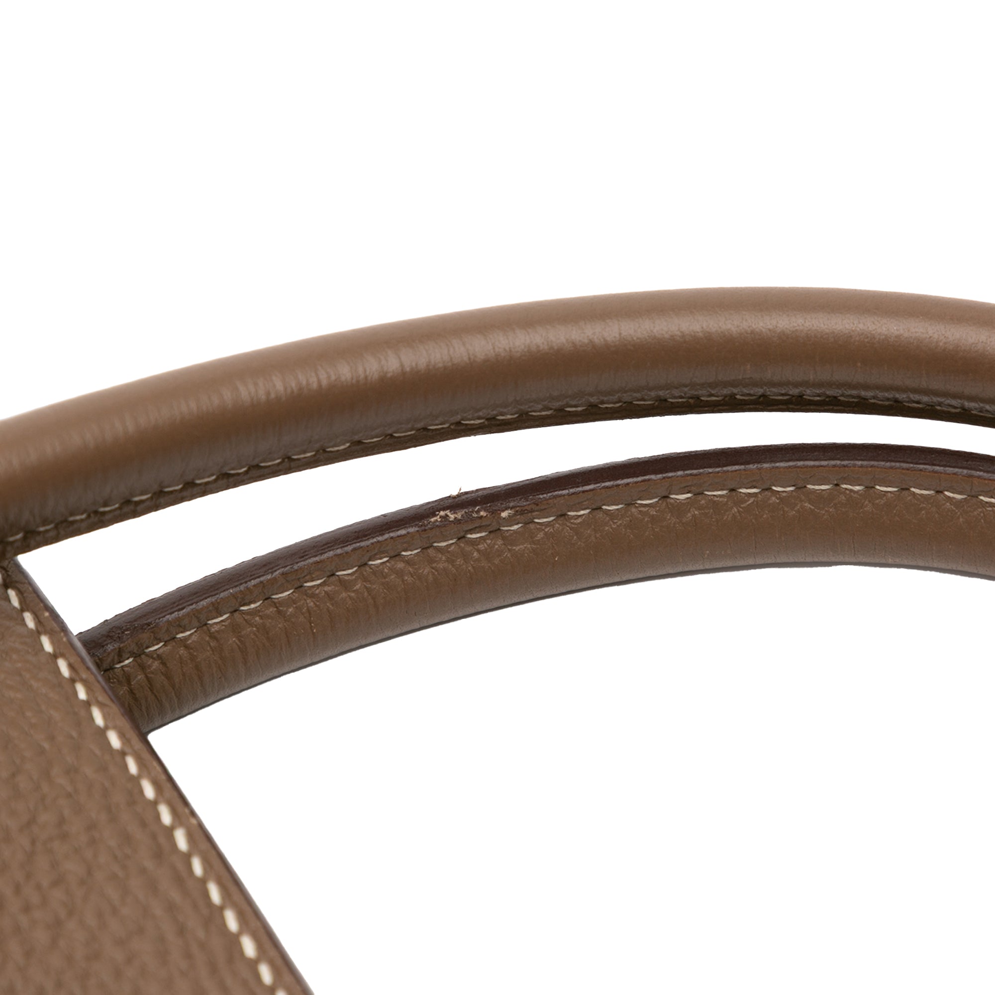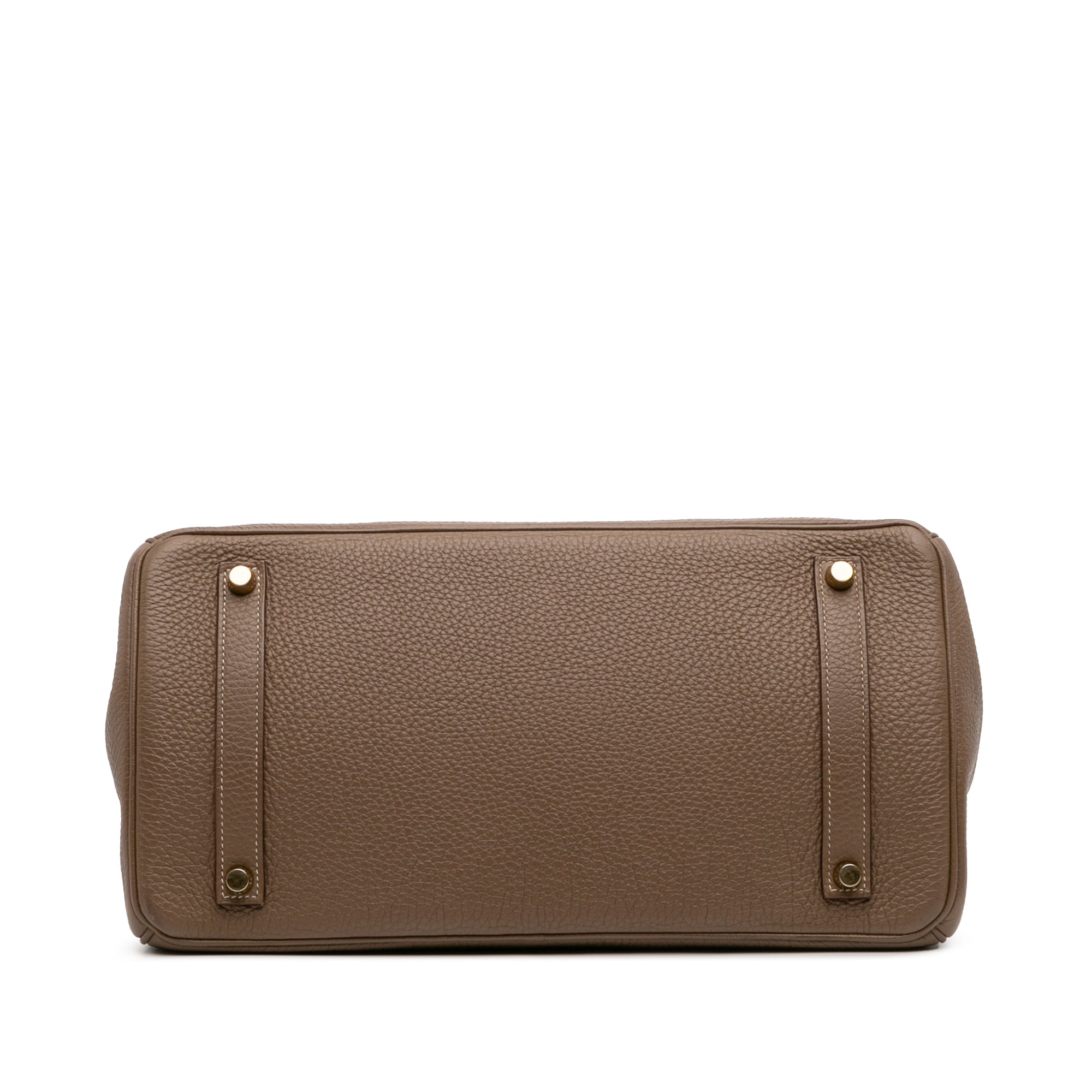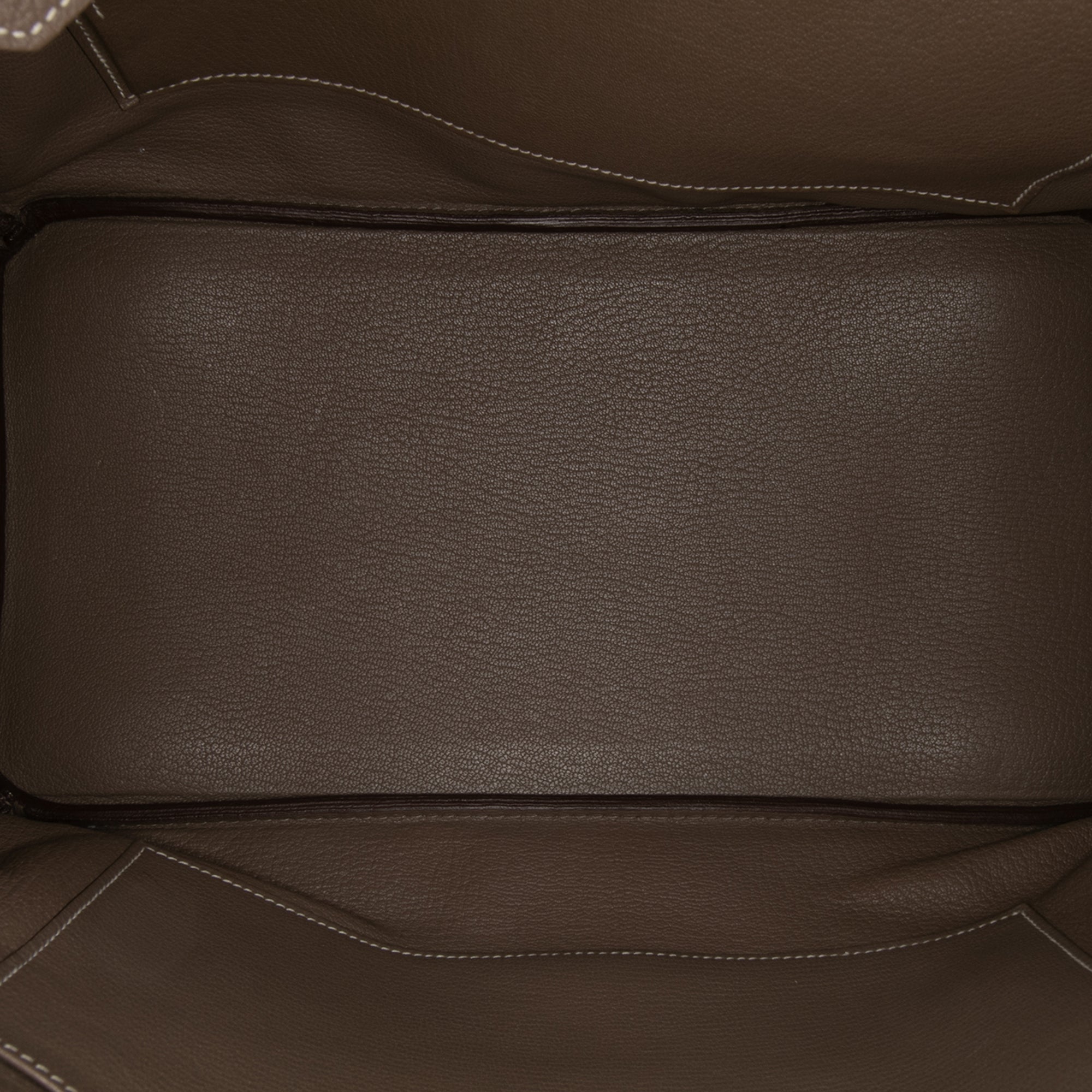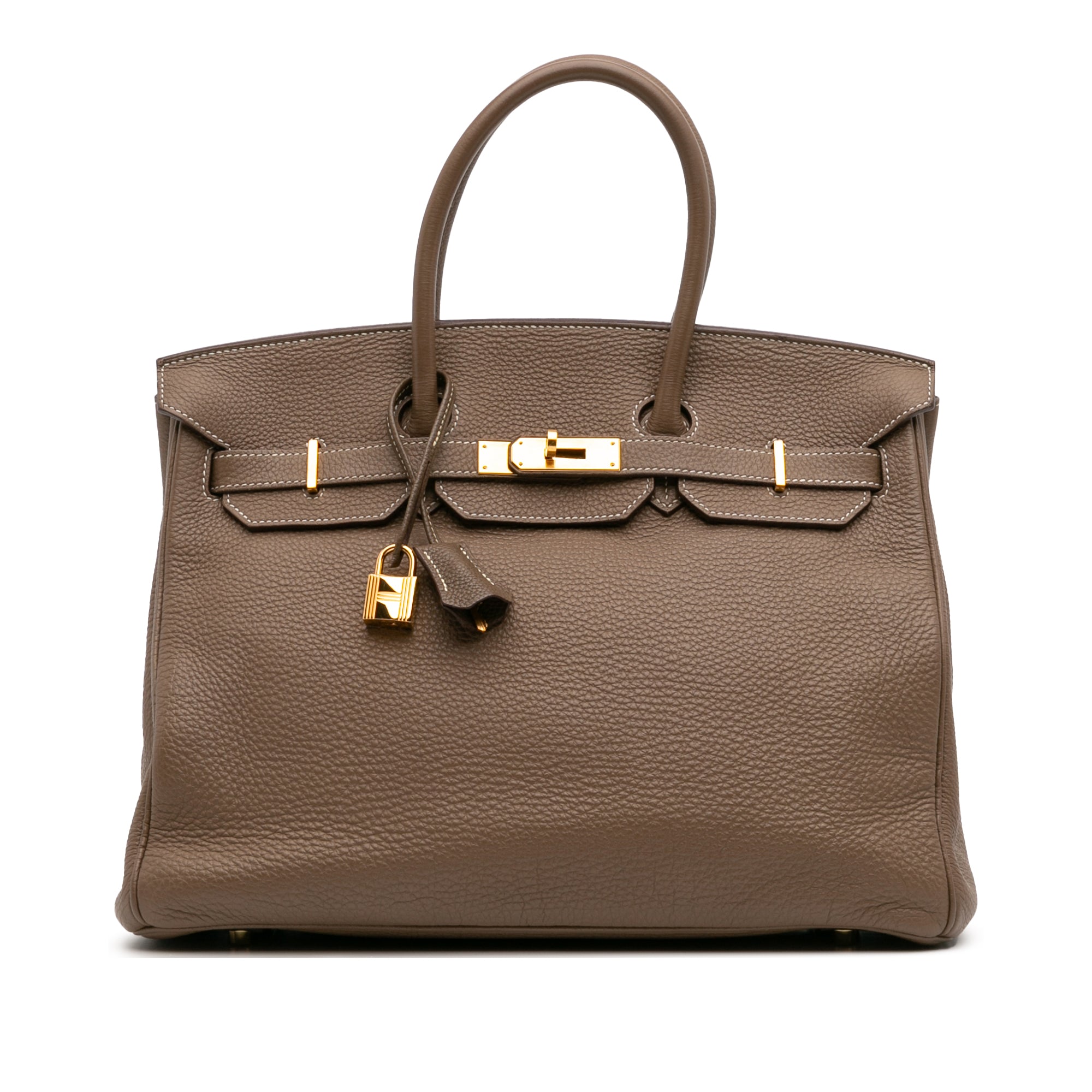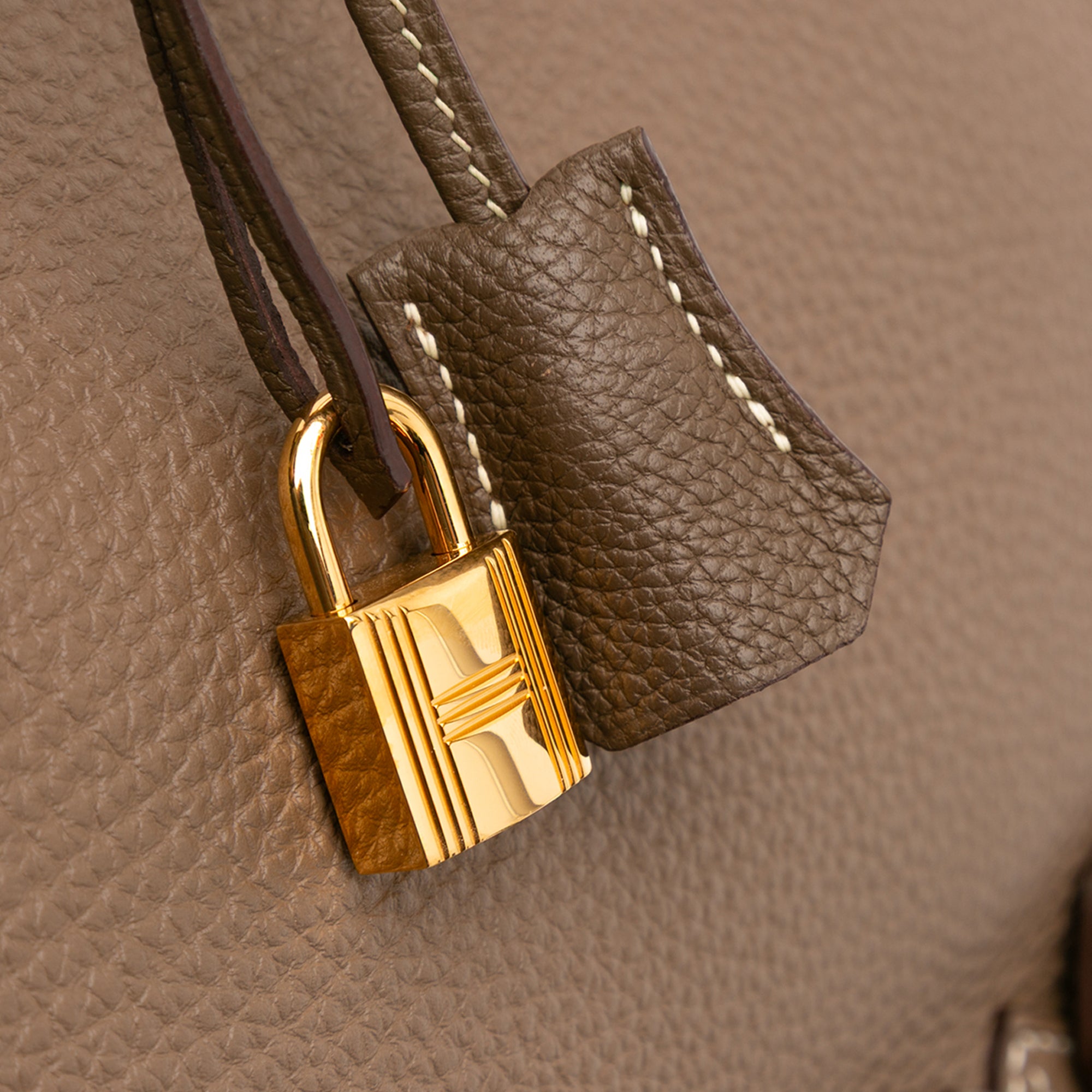 The Birkin features a Togo leather body in Etoupe color, rolled leather handles, a front flap with turn-lock closure, and interior slip and zip pockets. Retail Price: 19700.00