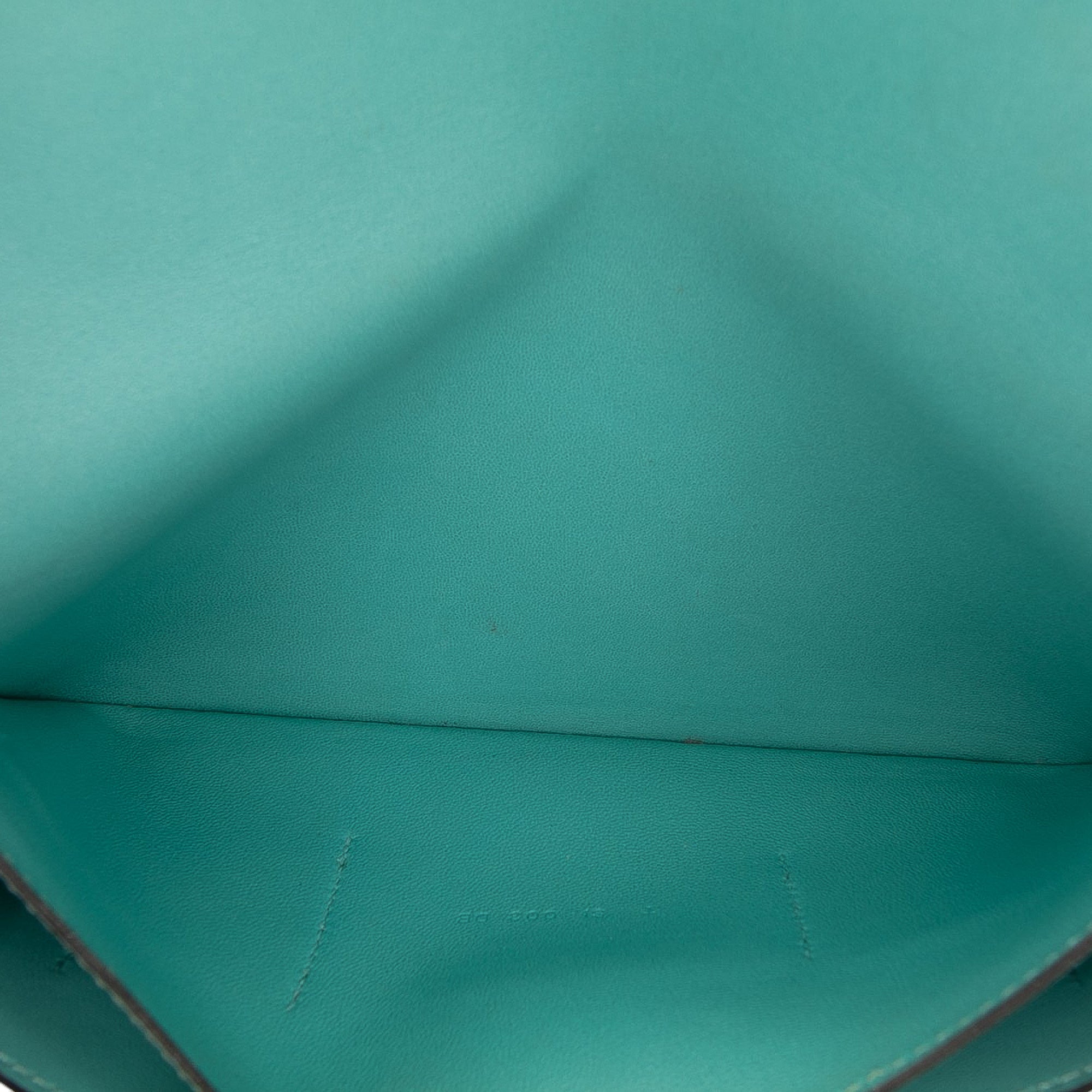 This Dogon Duo wallet features a Togo leather body in Blue Atoll color, a strap with clou de selle closure, interior slip pockets, and a removable zip pouch. Retail Price: 1900.00