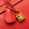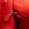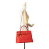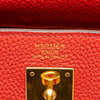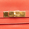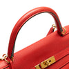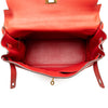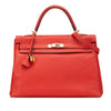 This Kelly II features a togo leather body in Geranium color, a flat leather top handle, a detachable flat leather strap, a top flap with twist lock closure, gold-tone hardware, and interior zip and slip pockets. Retail Price: 19500.00