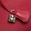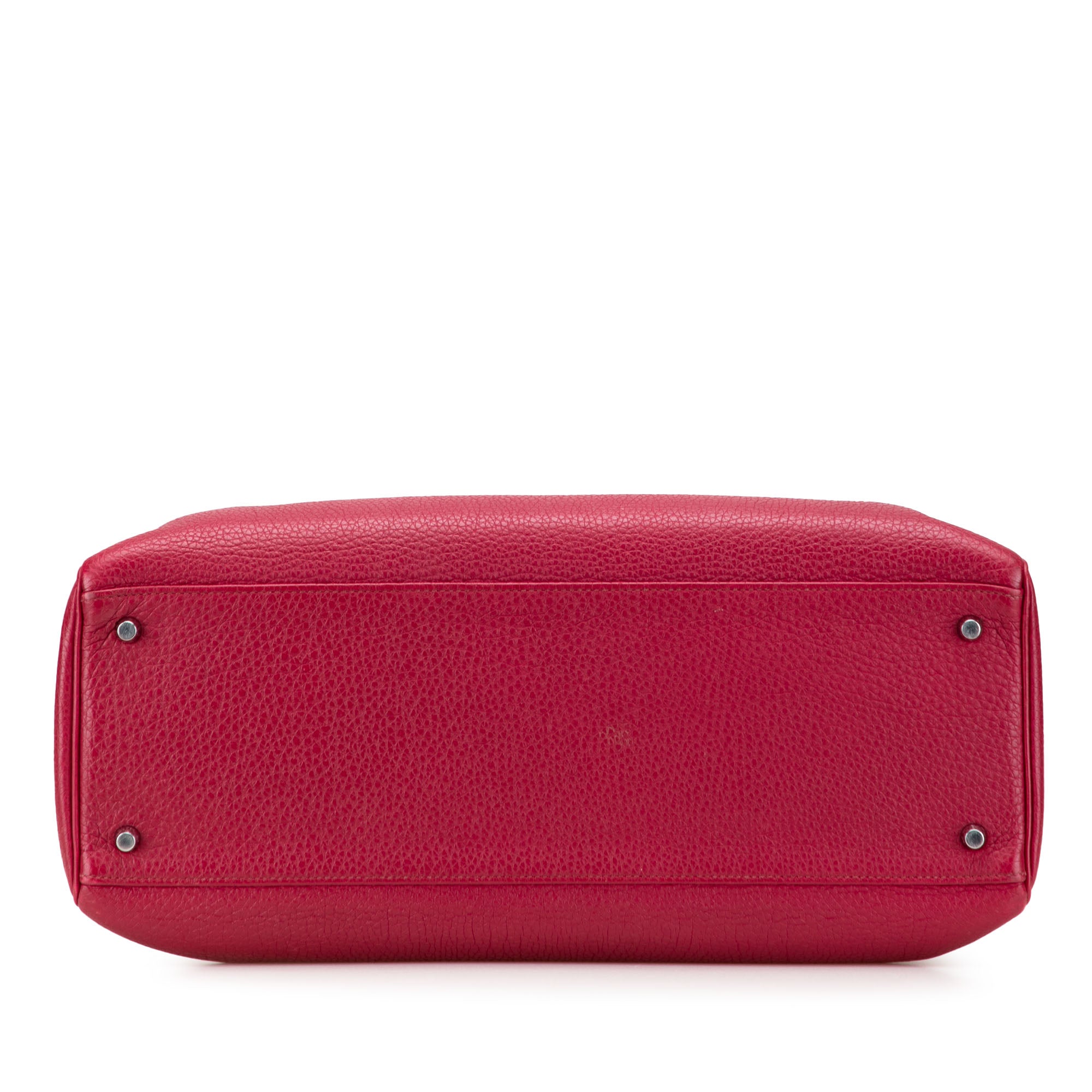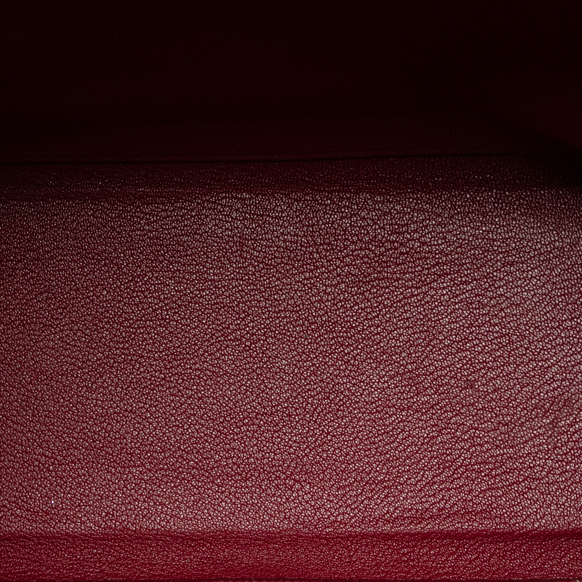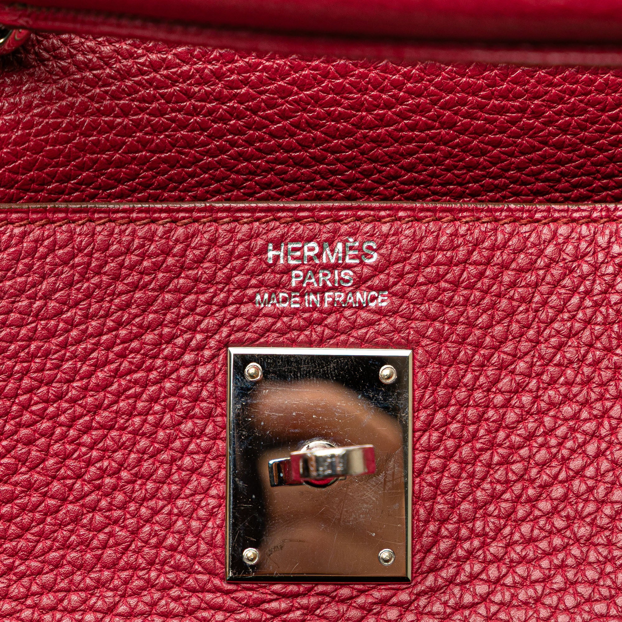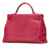 This Kelly 40 features a Togo leather body in Rubis color, a rolled leather top handle, a detachable flat leather strap, a front flap with turn lock closure, and interior zip and slip pockets. Retail Price: 10100.00