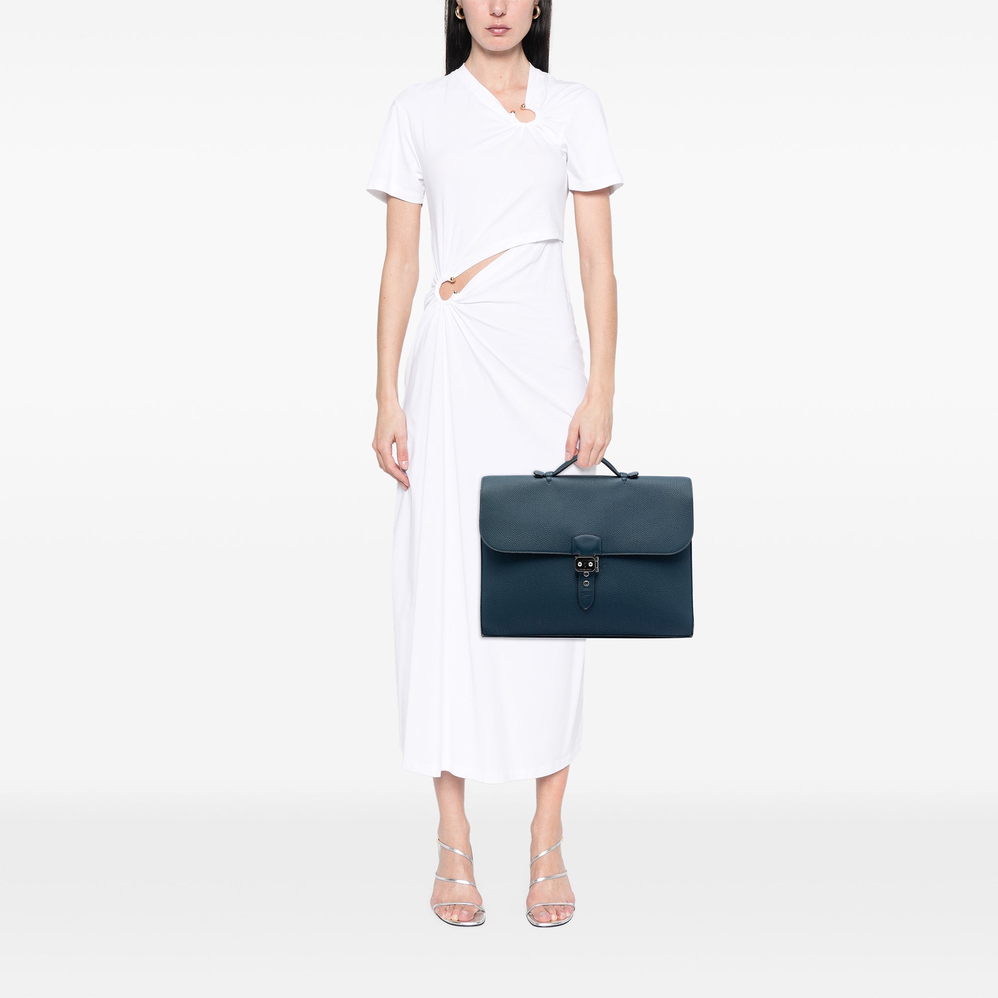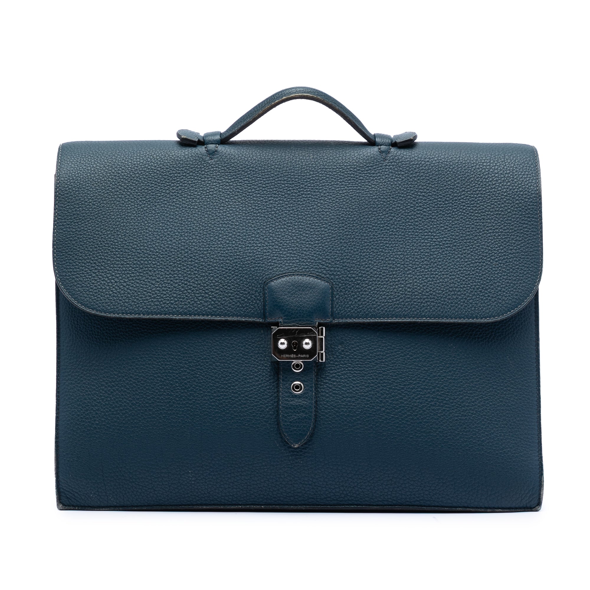 This Sac a Depeches 38 features a Togo leather body in Colvert color, a flat leather top handle, a front flap with flip-lock closure, an exterior back slip pocket, interior open compartments, and interior slip pockets. Retail Price: 8000.00