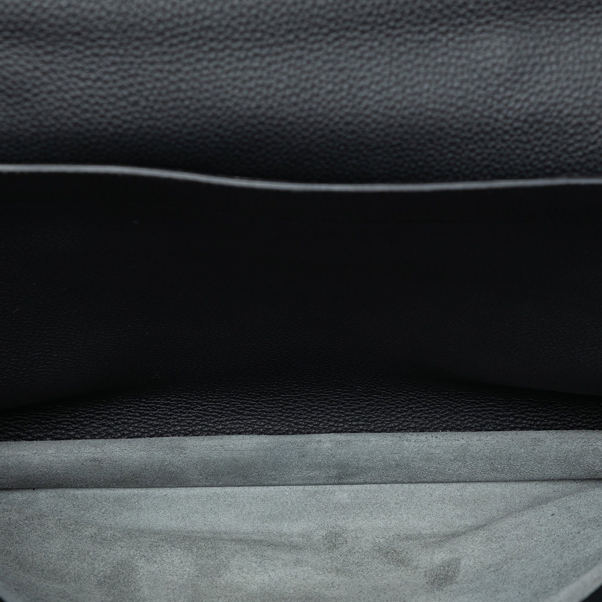 The Sac a Depeches 38 features a Togo leather body in Noir color, a flat leather top handle, a front flap with flip-lock closure, an exterior back slip pocket, interior open compartments and slip pockets. Retail Price: 8400.00