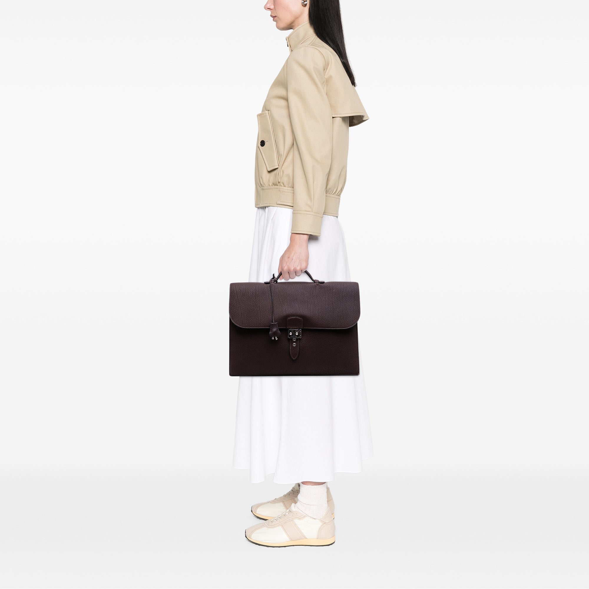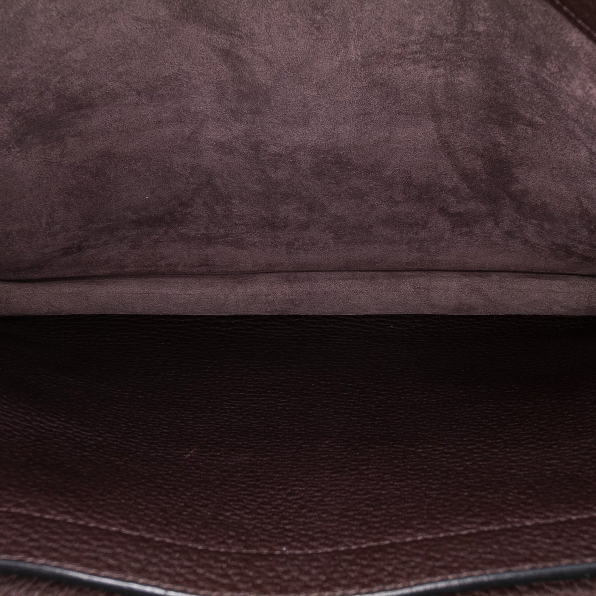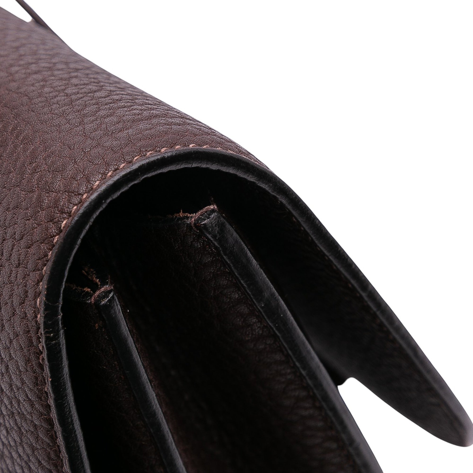 This Sac A Depeches features a Togo leather body in Ebene color, a flat top handle, a top flap with push lock closure, and interior slip pockets. Retail Price: 5000.00