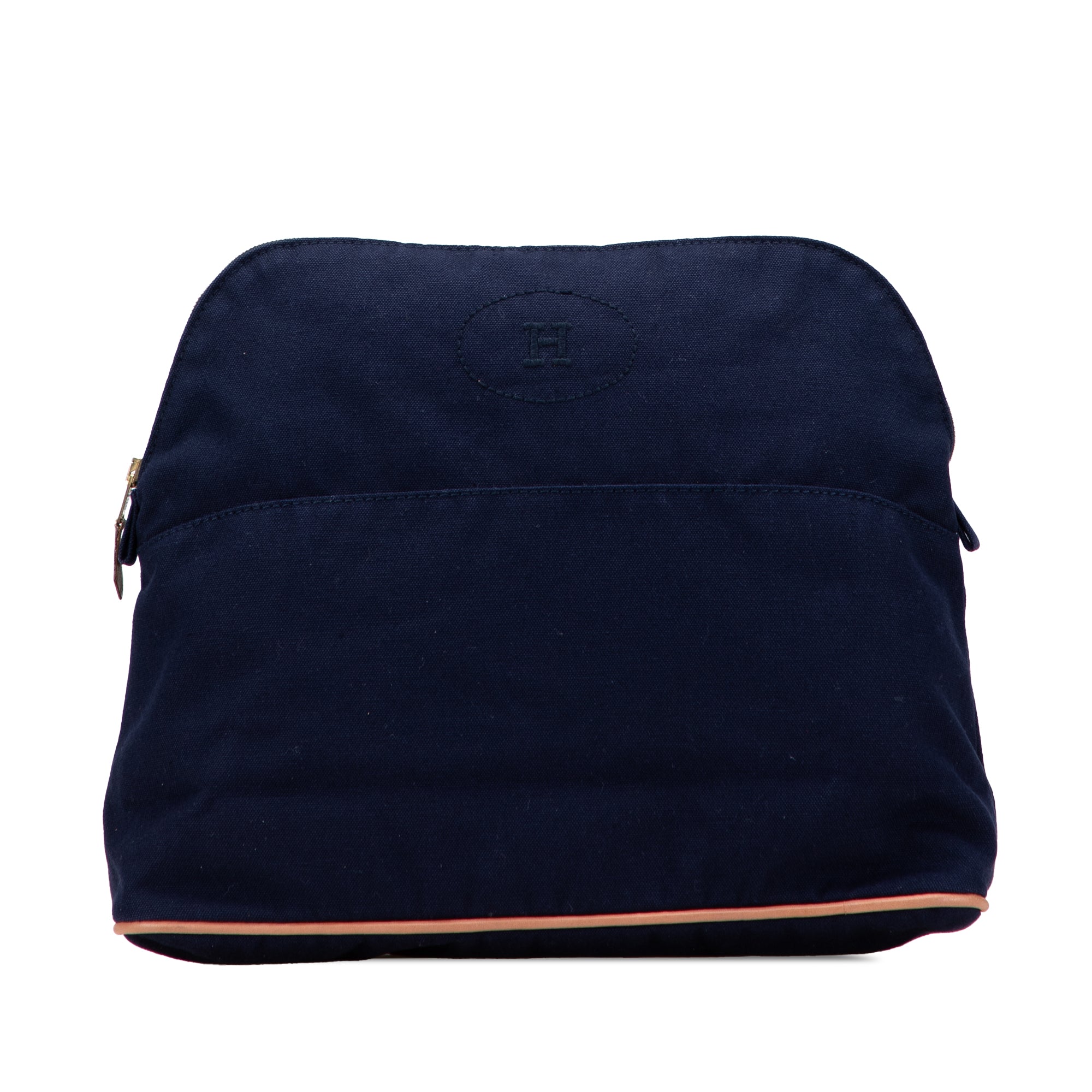 The Bolide pouch features a canvas body with leather trim, a top zip closure, and an interior slip pocket. Retail Price: 680.00