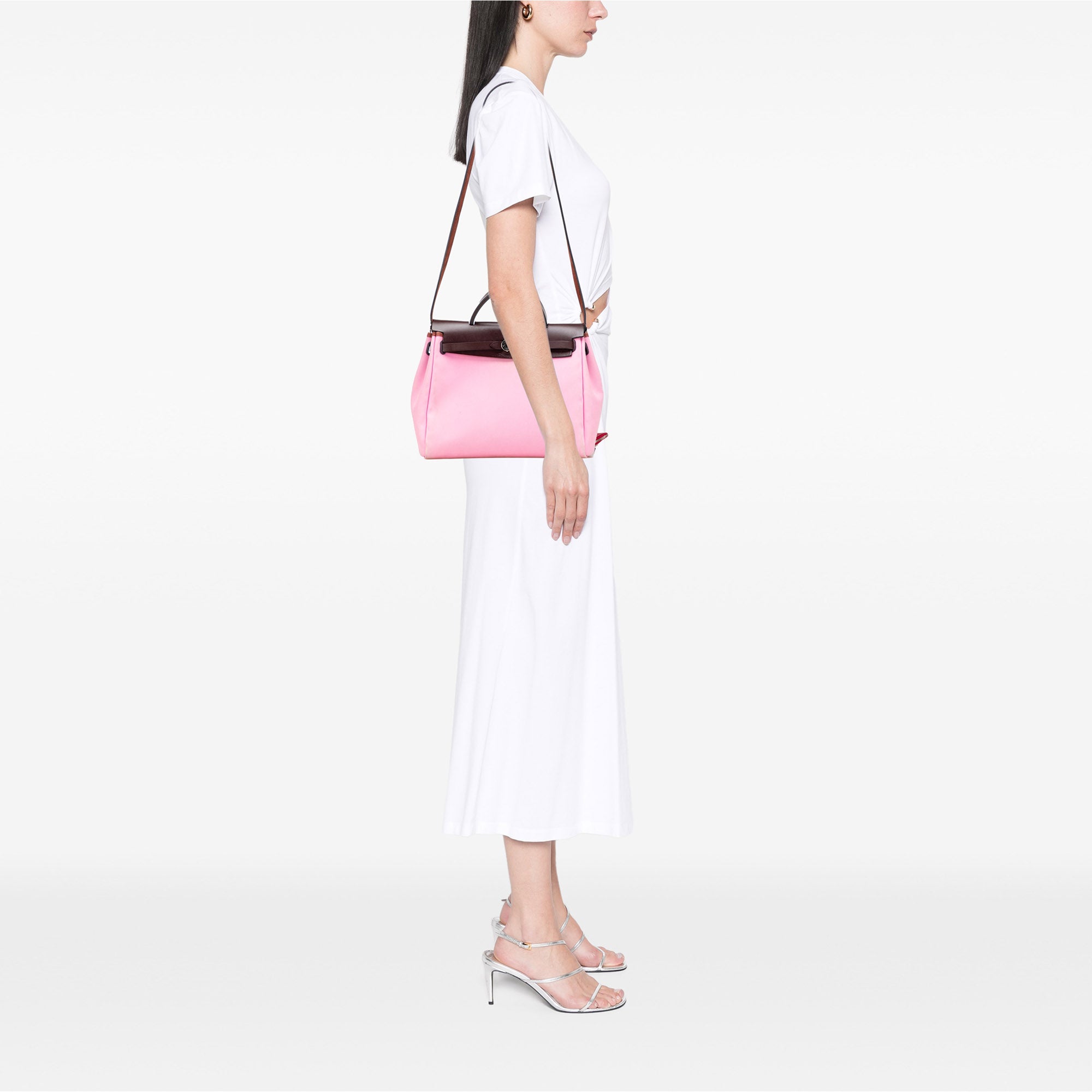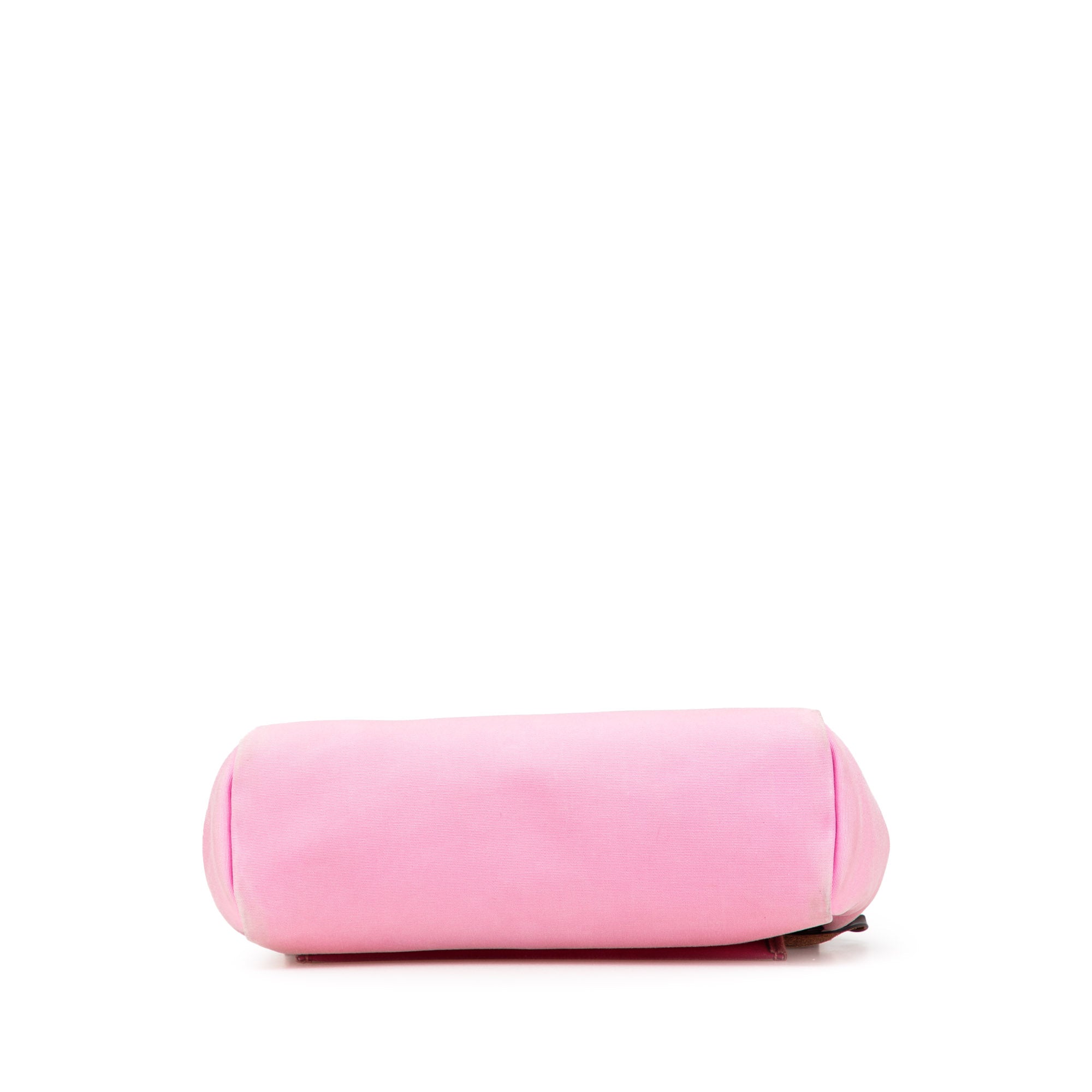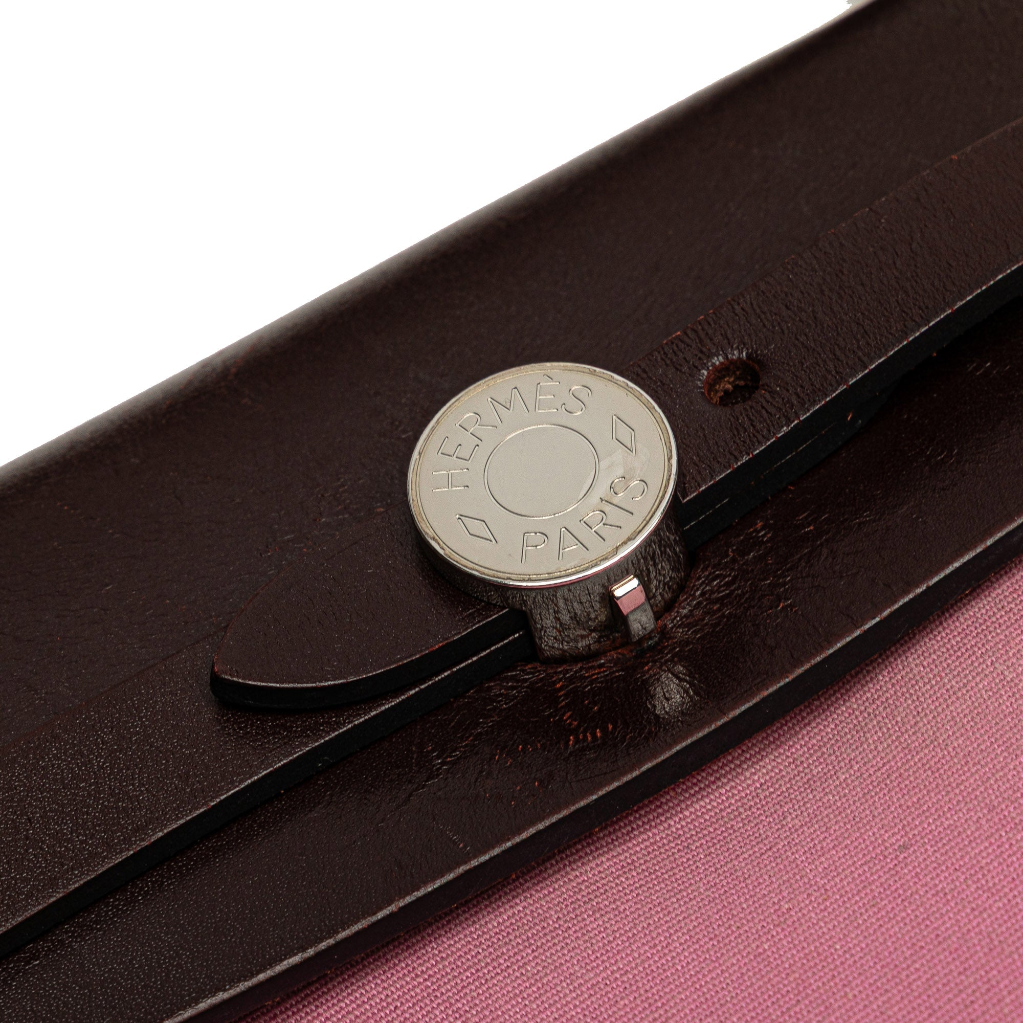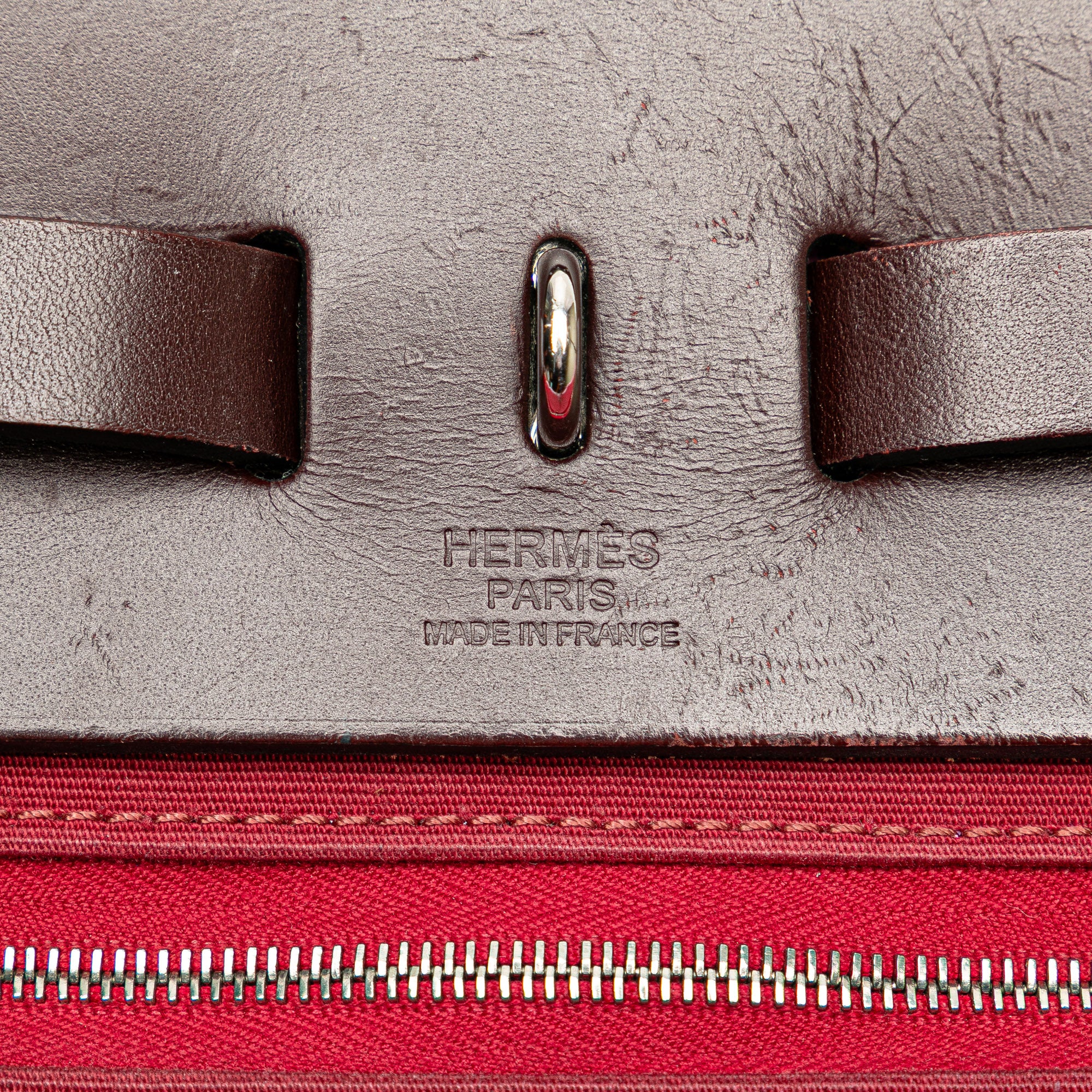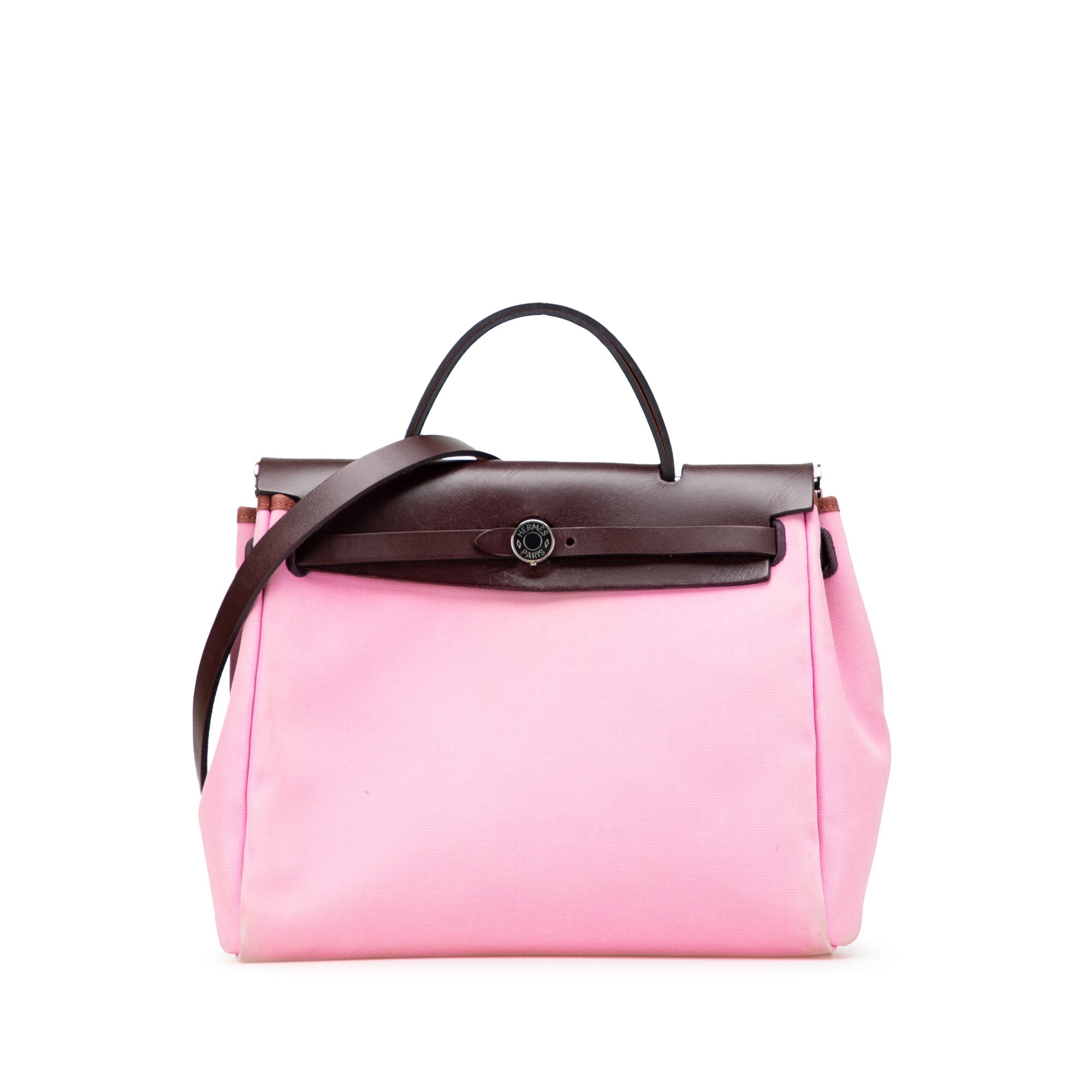 The Herbag Zip 31 features a canvas body, a flat leather top handle, a flat leather shoulder strap, a front leather flap with pull-through strap closure, an exterior back zip pocket, and a detachable interior zip pouch. Retail Price: 3050.00