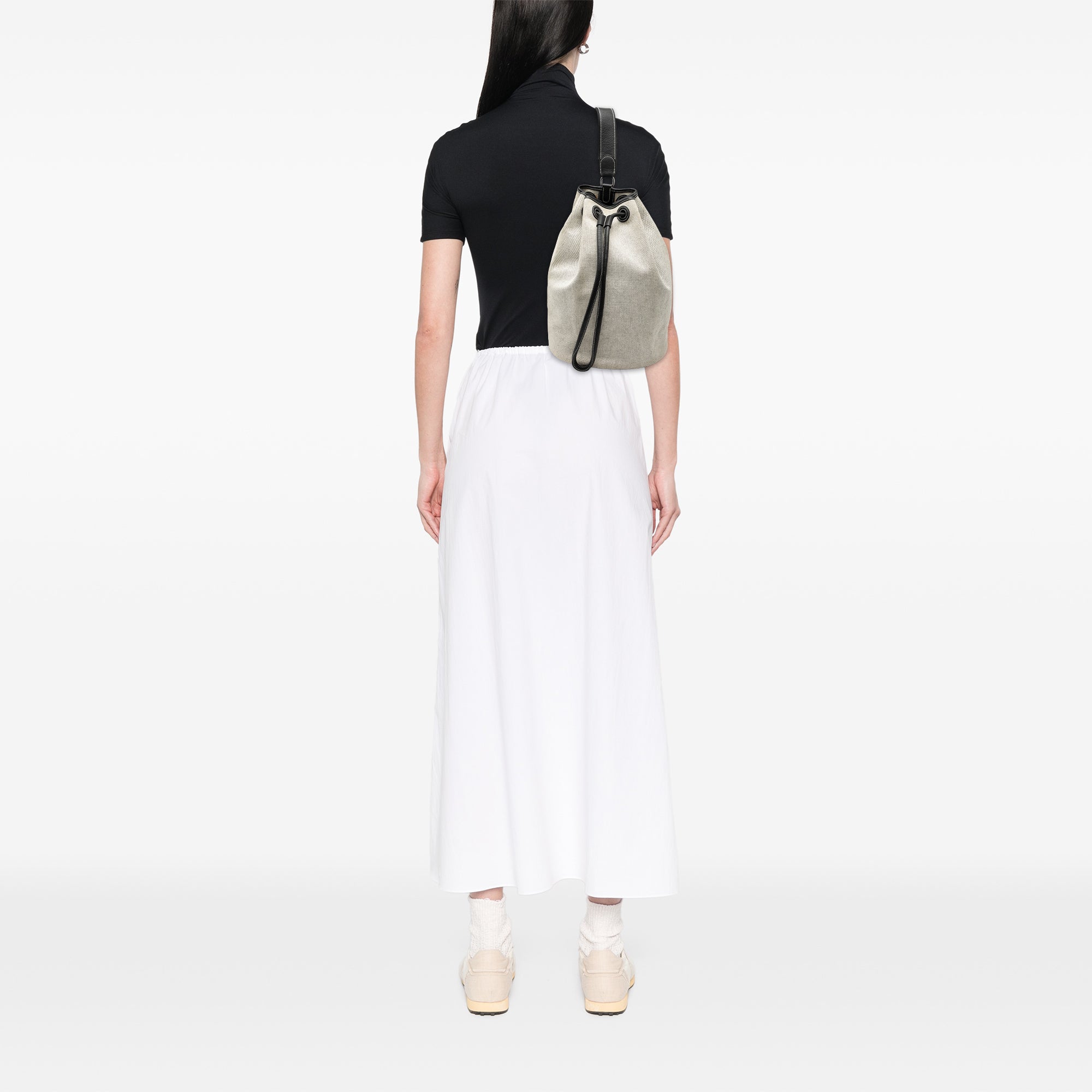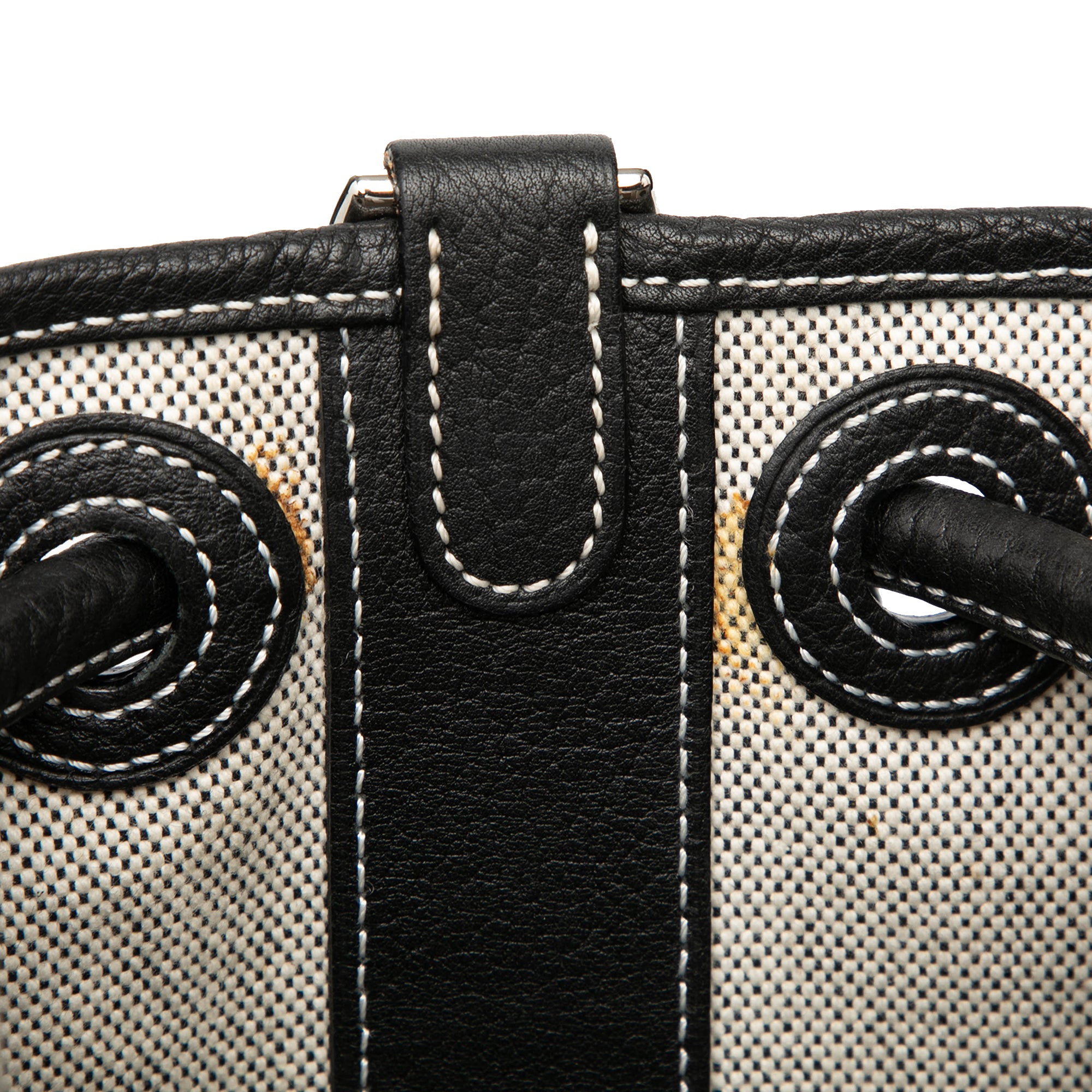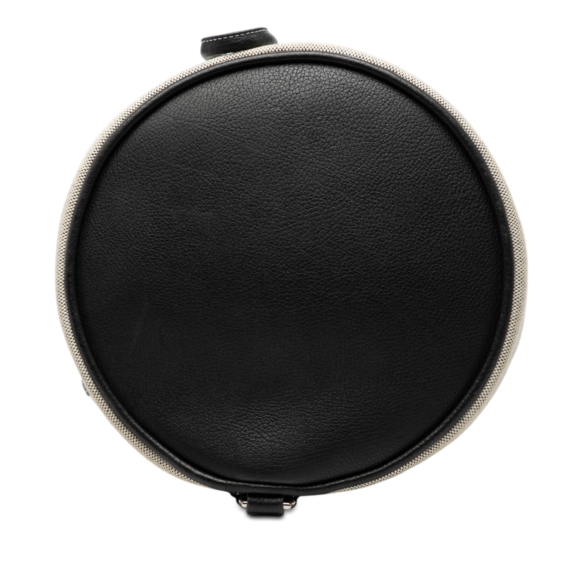 This backpack features a canvas body, a flat canvas and leather back strap, a drawstring closure, and an exterior zip pocket. Retail Price: 1030.00
