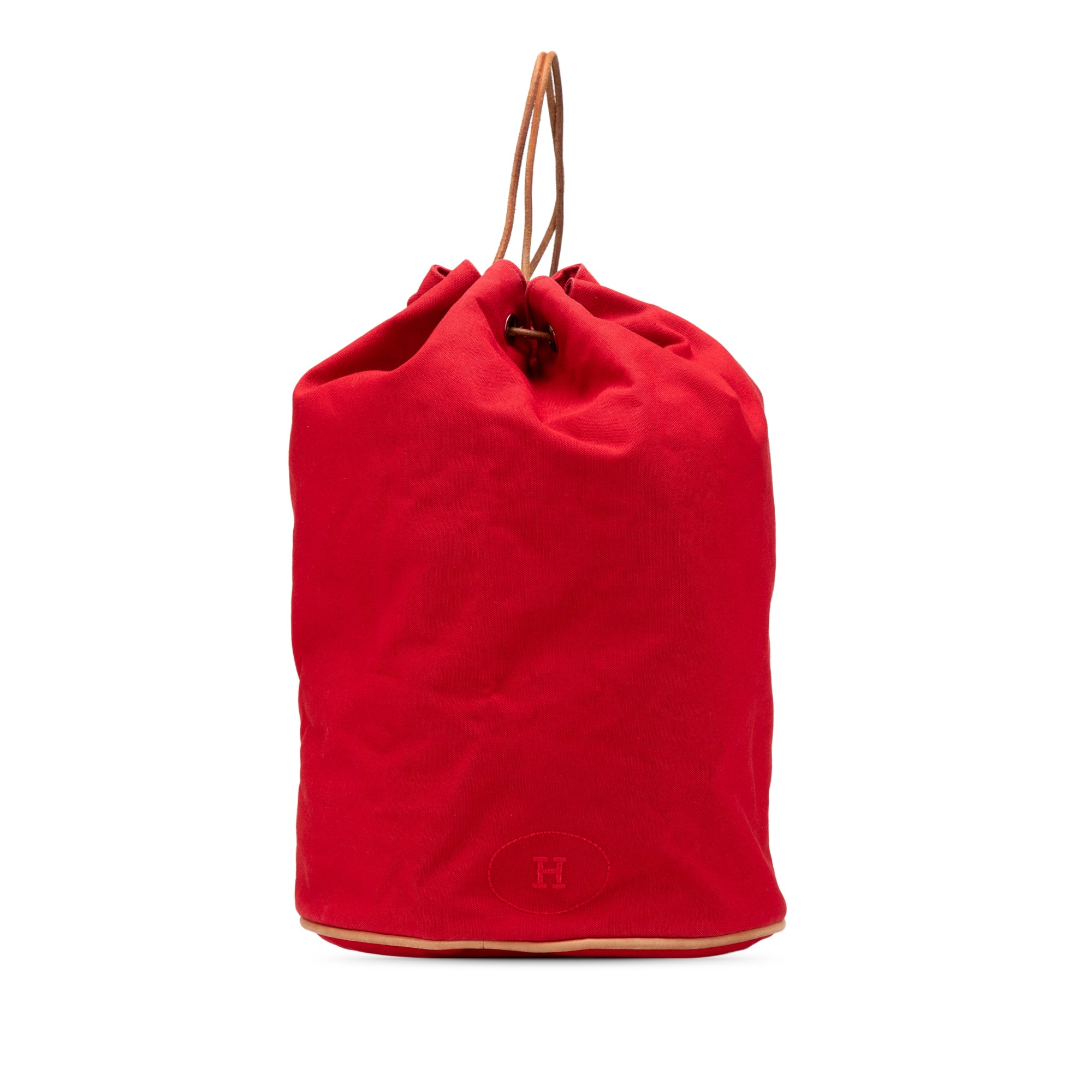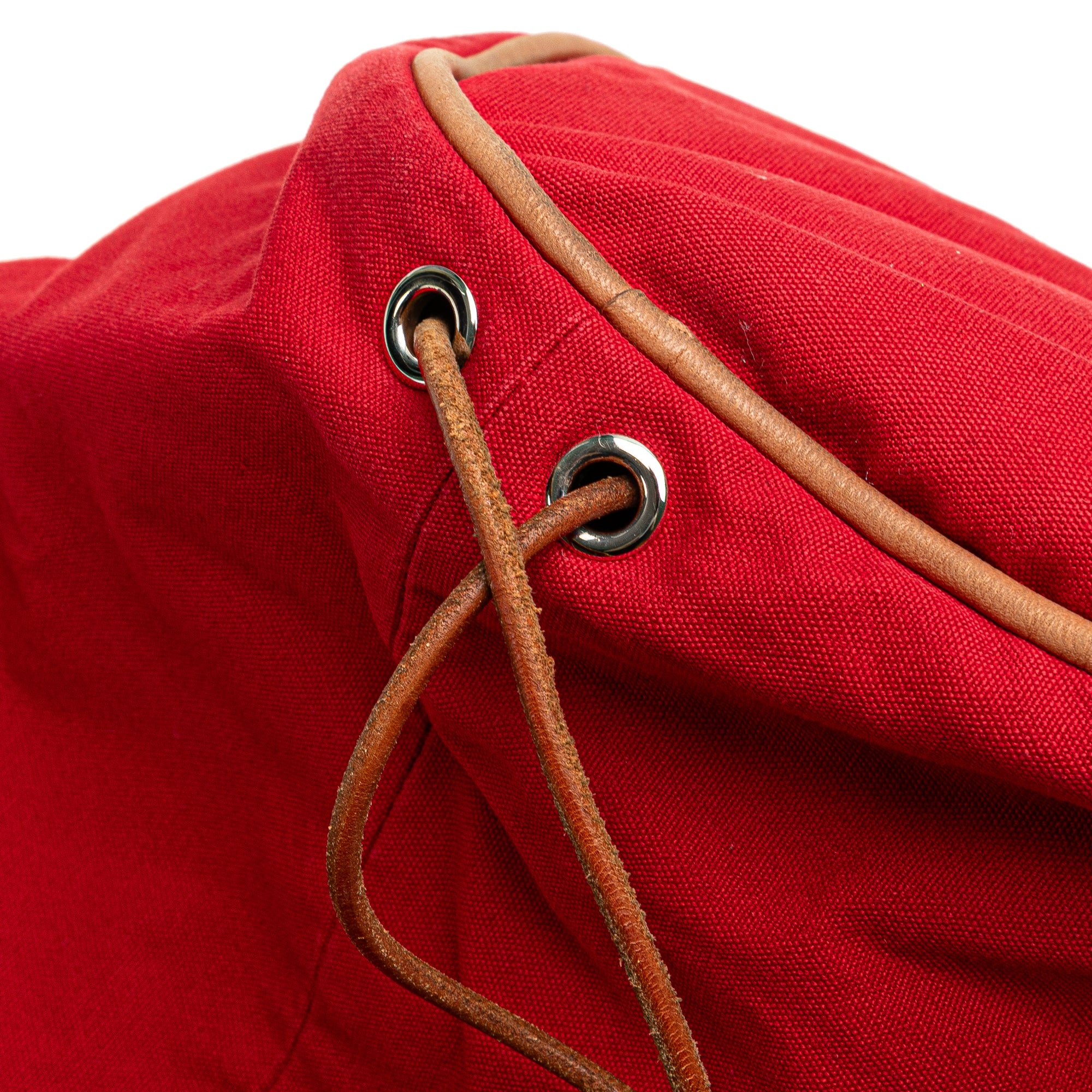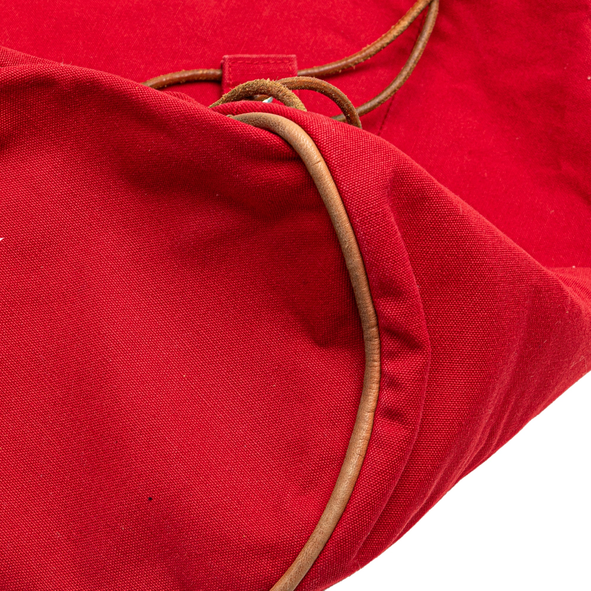 The Polochon Mimile features a canvas body, rolled leather back straps, and an open top with a drawstring closure. Retail Price: 880.00