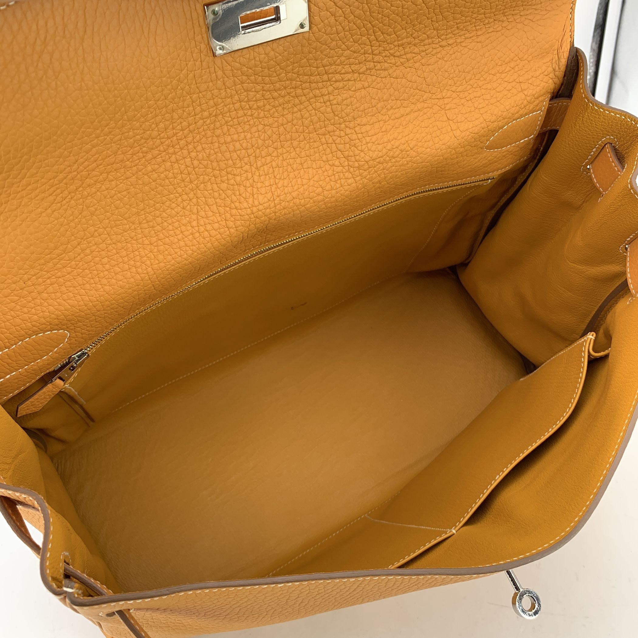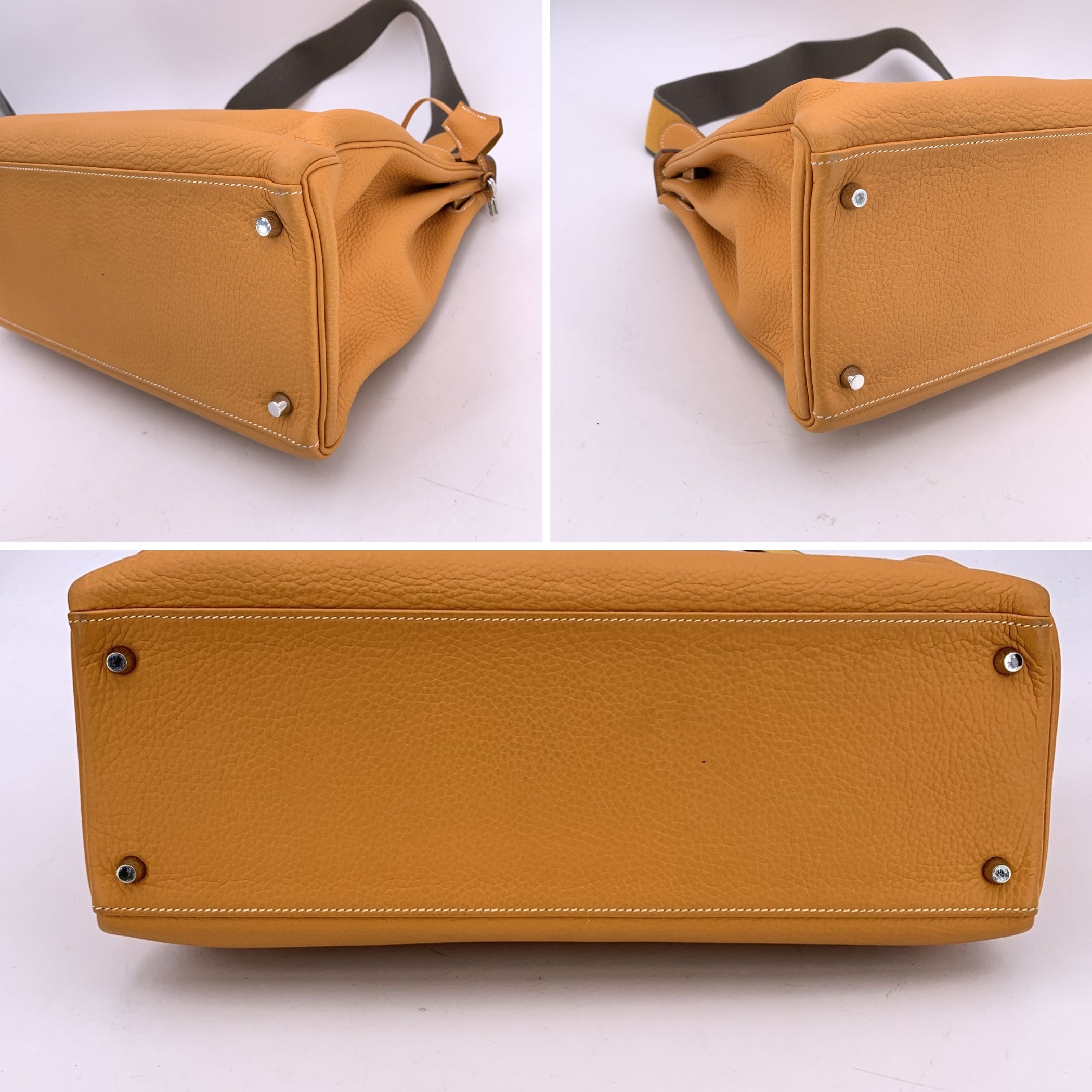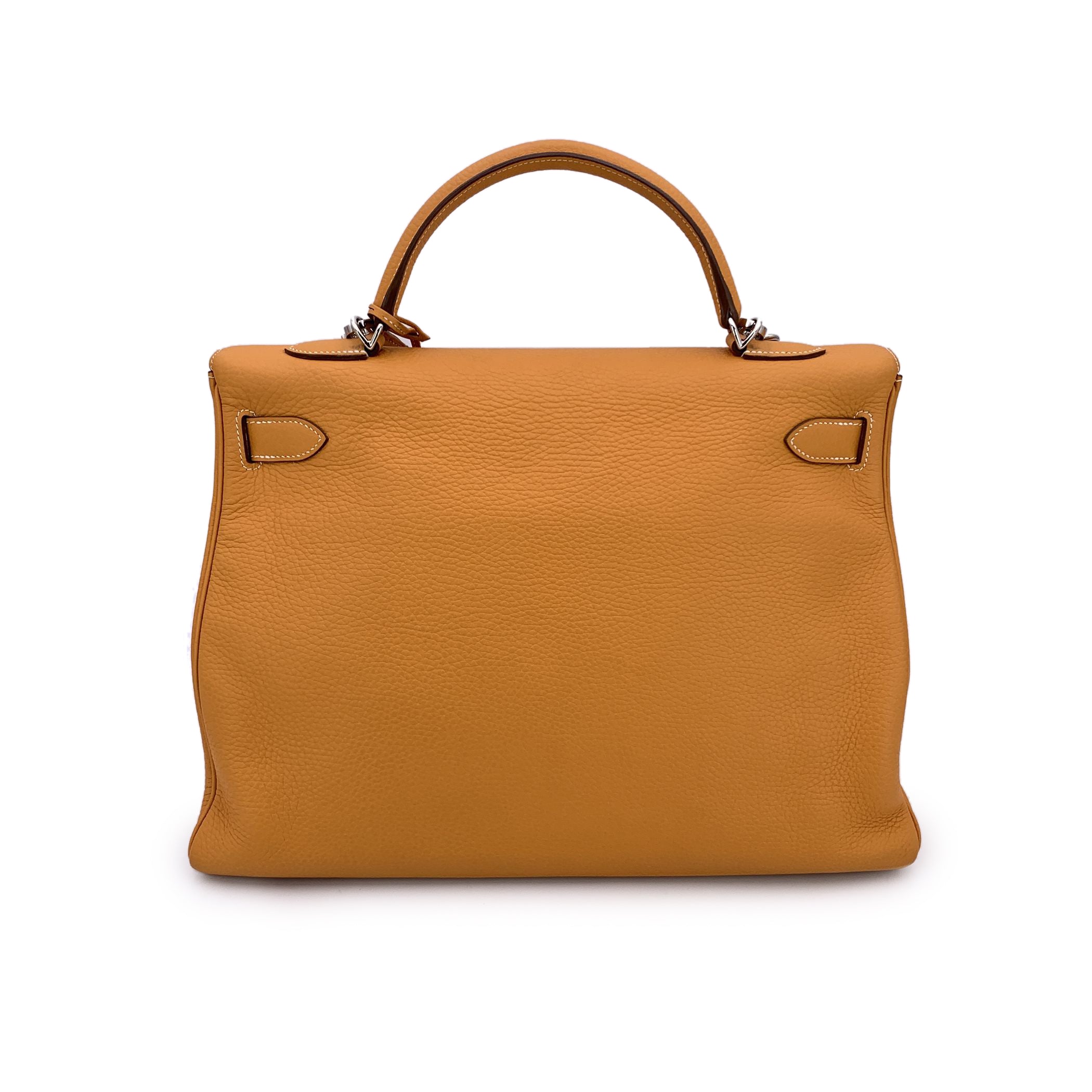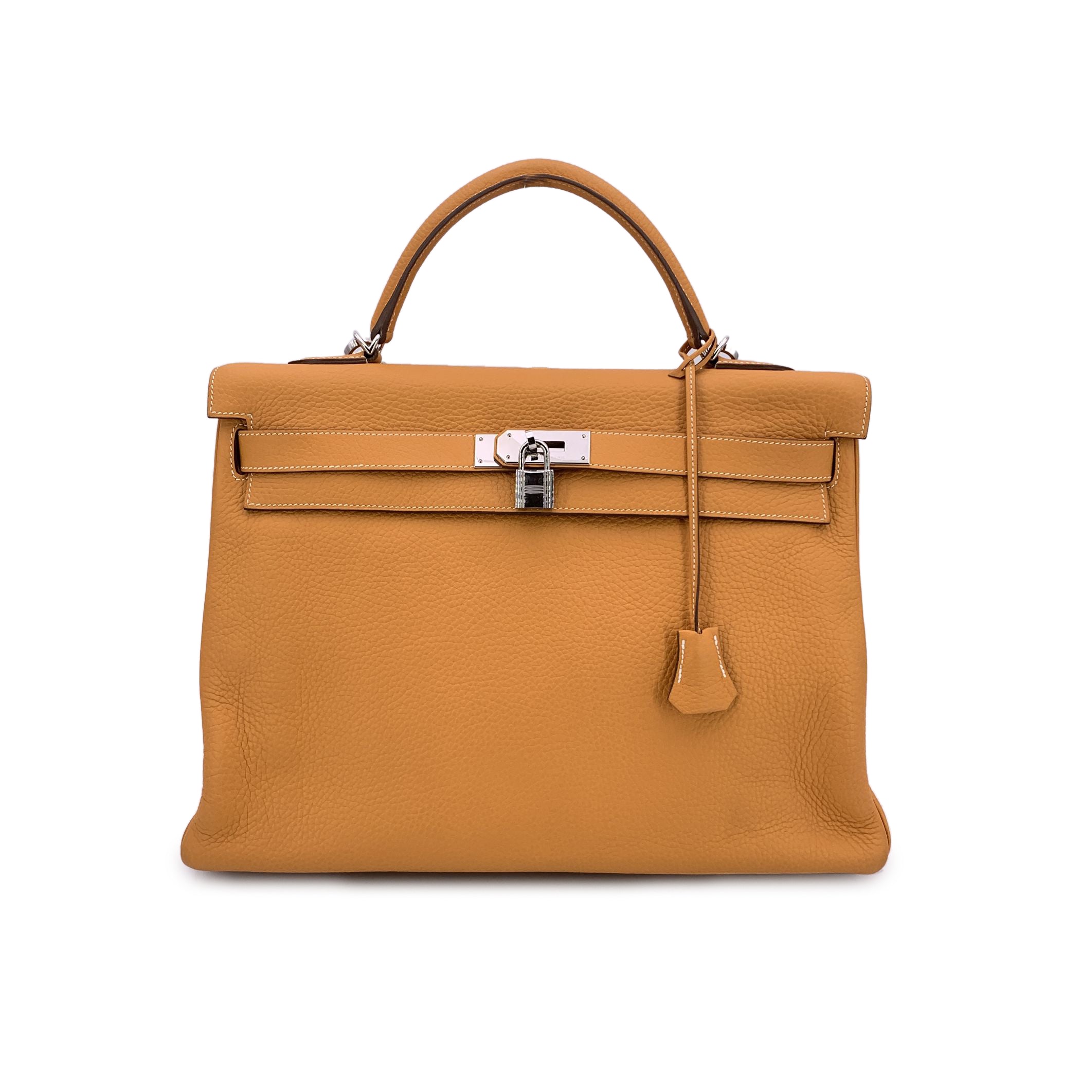 This Beautiful Bag Will Come With a Certificate Of Authenticity Provided By Entrupy. The Certificate Will Be Provided At No Further Cost. The Iconic Hermès Kelly 40 Retourne (2014) Step Into The Refined Legacy Of French Craftsmanship With This Magnificent Hermès Kelly Bag 40, a Classic Retourne Model, Born In 2014 (Blind Stamp R In a Square). This Particular Kelly Is Cloaked In a Rich, Radiant Saffron/toffee Leather-a Golden Hue That Exudes Both Warmth And Quiet Power, Aging With Grace And Gathering Stories Along The Way. A Masterclass In Structure And Softness, The Retourne Construction Gives This Piece Its Gently Rounded Corners And a Slightly More Relaxed Silhouette, Perfectly Balanced By The Precision Of Silver-tone Hardware. The Single Leather Handle And Removable Canvas Shoulder Strap Allow For Multiple Carries-whether Draped Casually Over The Shoulder Or Held With Poise In Hand. The Flap Top Closure, Elegantly Secured By The Signature Leather Straps And Round Clasp, Whispers Luxury Without Shouting. The Lock Latches With a Satisfying Click, And Comes With Its Matching Hermès Padlock, Clochette, And Keys, All Meticulously Crafted. The Bottom Is Protected By Four Silver Feet, Keeping Its Elegance Unblemished Wherever It Rests. Inside, You'll Find a Beautifully Coordinated Leather-lined Interior, Thoughtfully Designed With One Zip Pocket And Two Patch Pockets-perfect For Life's Small Essentials. Authenticity Is Etched And Embossed Where It Matters: 'Hermès Paris' Engraved On The Hardware, And 'Hermès Paris - Made In France' Discreetly Placed Under The Flap. Completing This Exceptional Set Is The Original Rain Protector, a Testament To The Care Hermès Instills In Every Piece. Timeless, Iconic, And Effortlessly Chic-this Kelly 40 Isn't Just a Bag. It's a Chapter In Fashion History.