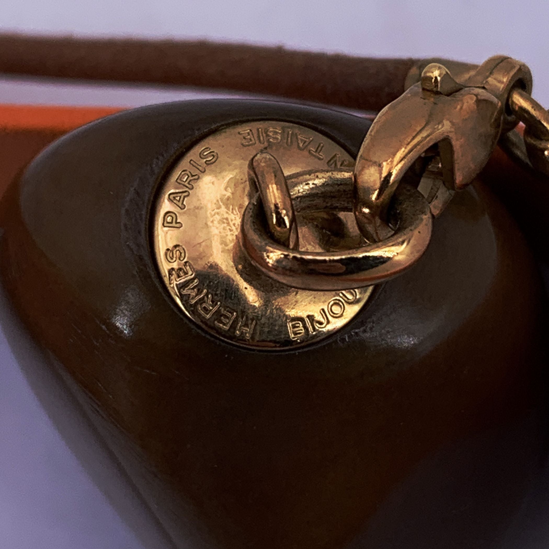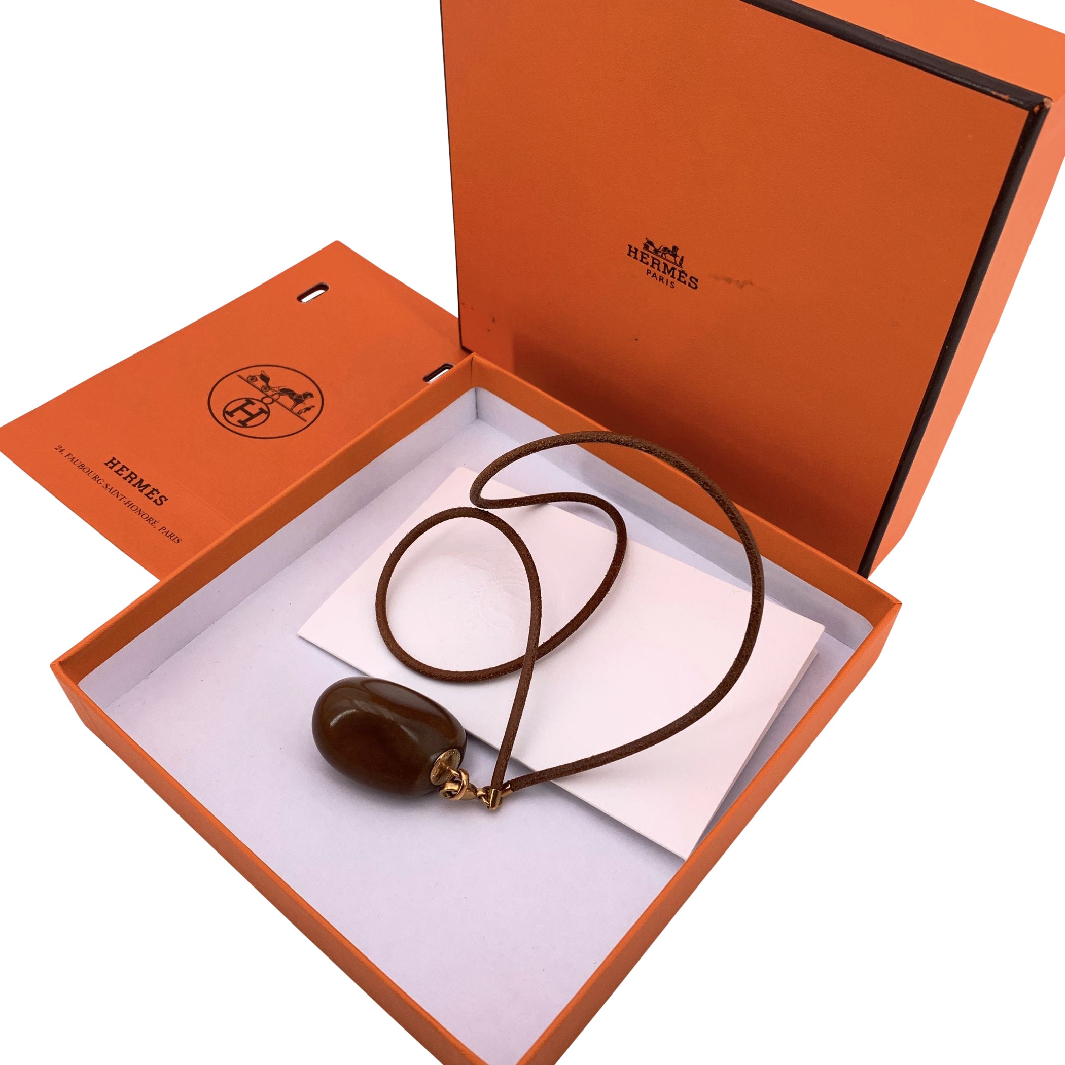 Elegant And Understated, This Hermès Paris Brown Corozo Tagua Pendant Necklace Captures The House's Refined Approach To Natural Materials And Minimalist Design. The Pendant, Crafted From Corozo (Also Known As Tagua Nut), Displays a Smooth, Organic Texture In Warm Brown Tones, Subtly Engraved With The "Hermès Paris" Signature. It Hangs From a Supple Leather Cord. A Perfect Blend Of Craftsmanship And Simplicity, This Necklace Adds a Touch Of Effortless Sophistication To Both Casual And Refined Looks. Necklace's Drop Is 11 Inches - 28 Cm