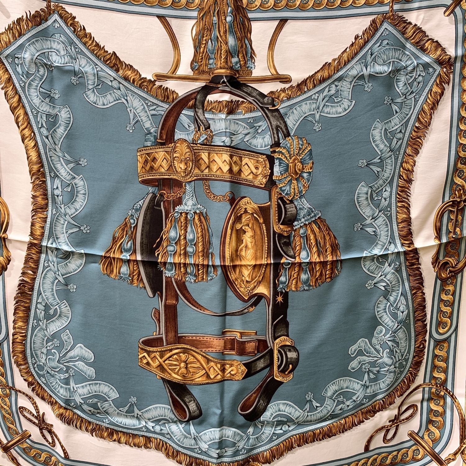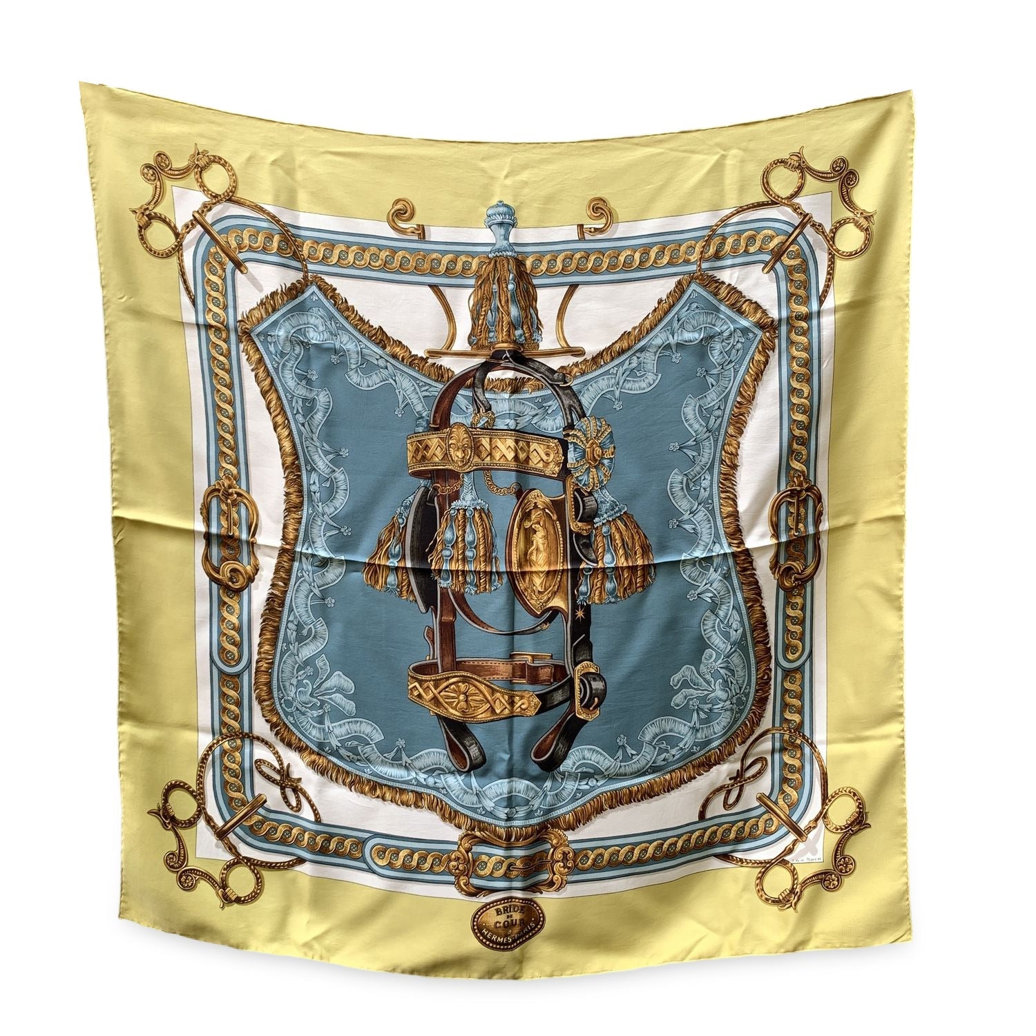 A Timeless Emblem Of Equestrian Elegance, This Hermès Silk Scarf Is The Iconic 'Bride De Cour', Originally Designed By Françoise De La Perrière In 1969. Rich In Regal Detail And Inspired By Ornate Horse Bridles, This Design Has Become One Of The Maison's Most Beloved Classics - So Cherished, In Fact, That It Has Been Reissued Countless Times In Various Colorways, Fabrics, And Formats. This Particular Piece Features The Luxurious Craftsmanship Hermès Is Known For: 100% Silk With Hand-rolled Edges, And Generous Measurements Of Approx. 35 x 35 Inches. The Unmistakable 'Hermès - Paris' Inscription Is Printed At The Lower Center, Grounding The Artwork In Heritage And Authenticity. Whether Worn, Framed, Or Collected, 'Bride De Cour' Is More Than a Scarf - It's a Piece Of Hermès History, Woven With The Artistry Of French Tradition.