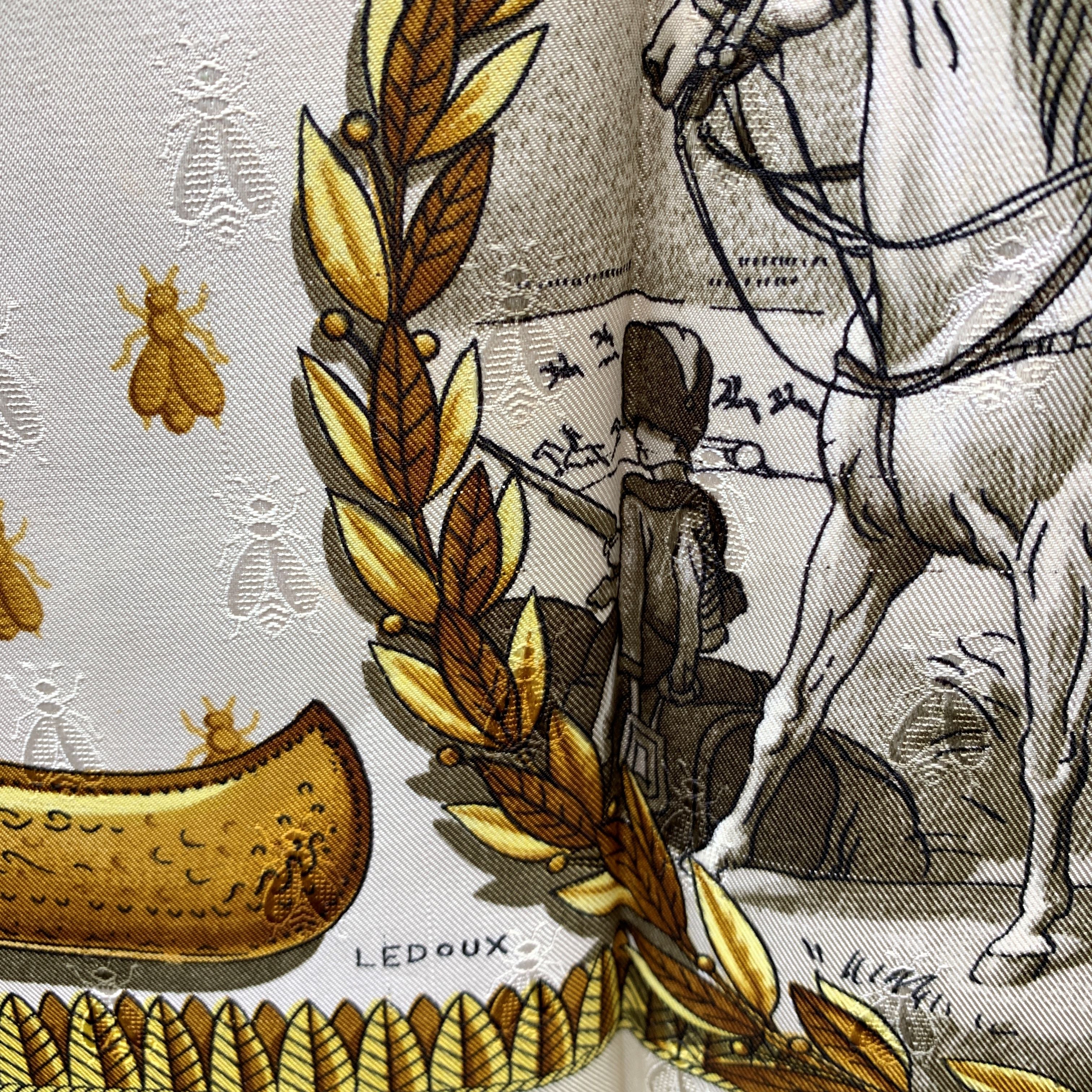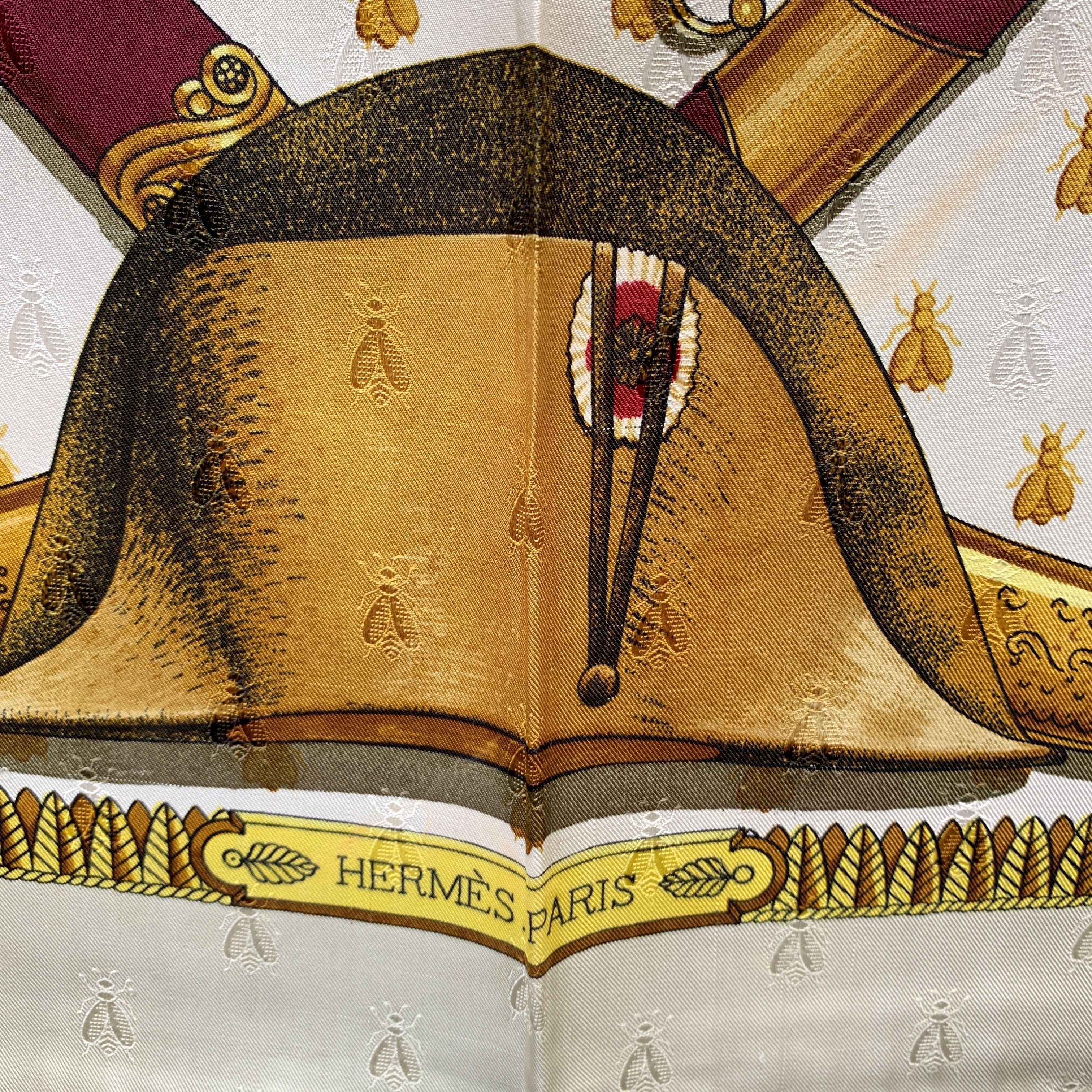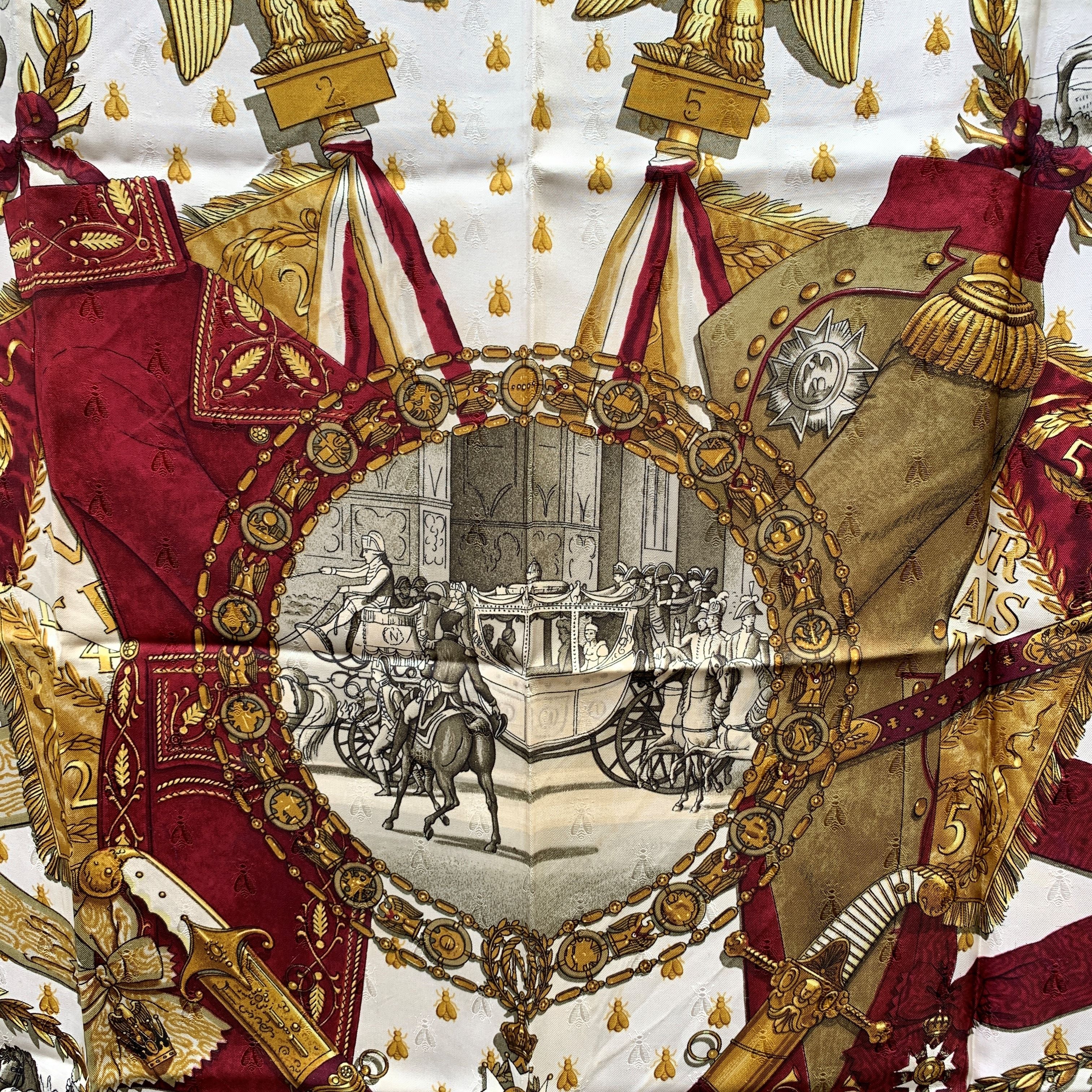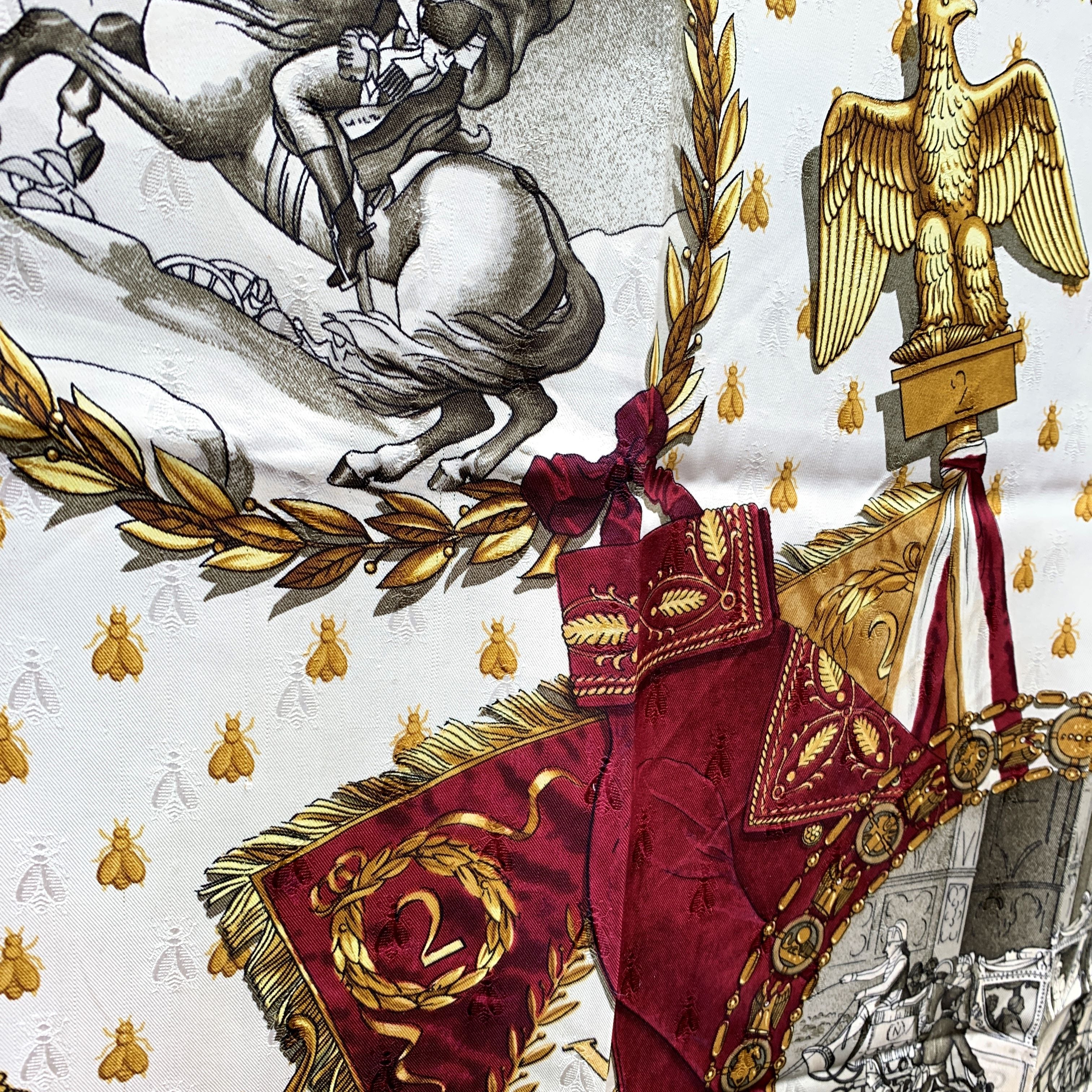 A True Collector's Treasure, This Stunning Hermès Napoleon Silk Scarf Pays Homage To One Of History's Most Iconic Figures. Designed By The Legendary Philippe Ledoux And First Issued In 1963, The Scarf Centers On a Masterfully Detailed Scene: The Arrival At Napoleon's Coronation Ceremony At Notre-dame On December 2, 1804-drawn From An Original Engraving In The Livre Du Sacre. The Drama, Grandeur, And Ceremonial Precision Of The Moment Are Captured With Unmatched Artistry. Woven From Luxurious 100% Jacquard Silk, This Piece Belongs To a Rare Era Of Hermès Craftsmanship. The Production Of Scarves In This Intricate Fabric Was Discontinued In The 1990s Due To High Costs, Making This Version Particularly Sought After. Finished With Hand-rolled Edges, The Scarf Features Hermès - Paris At The Bottom Center, With a Composition Tag Still Attached, And The Hermès Name Accompanied By a Copyright Symbol In The Lower Left Quadrant. Elegant, Historical, And Richly Woven With Narrative, This Scarf Is More Than An Accessory-it Is a Wearable Artifact Of Regal Splendor.