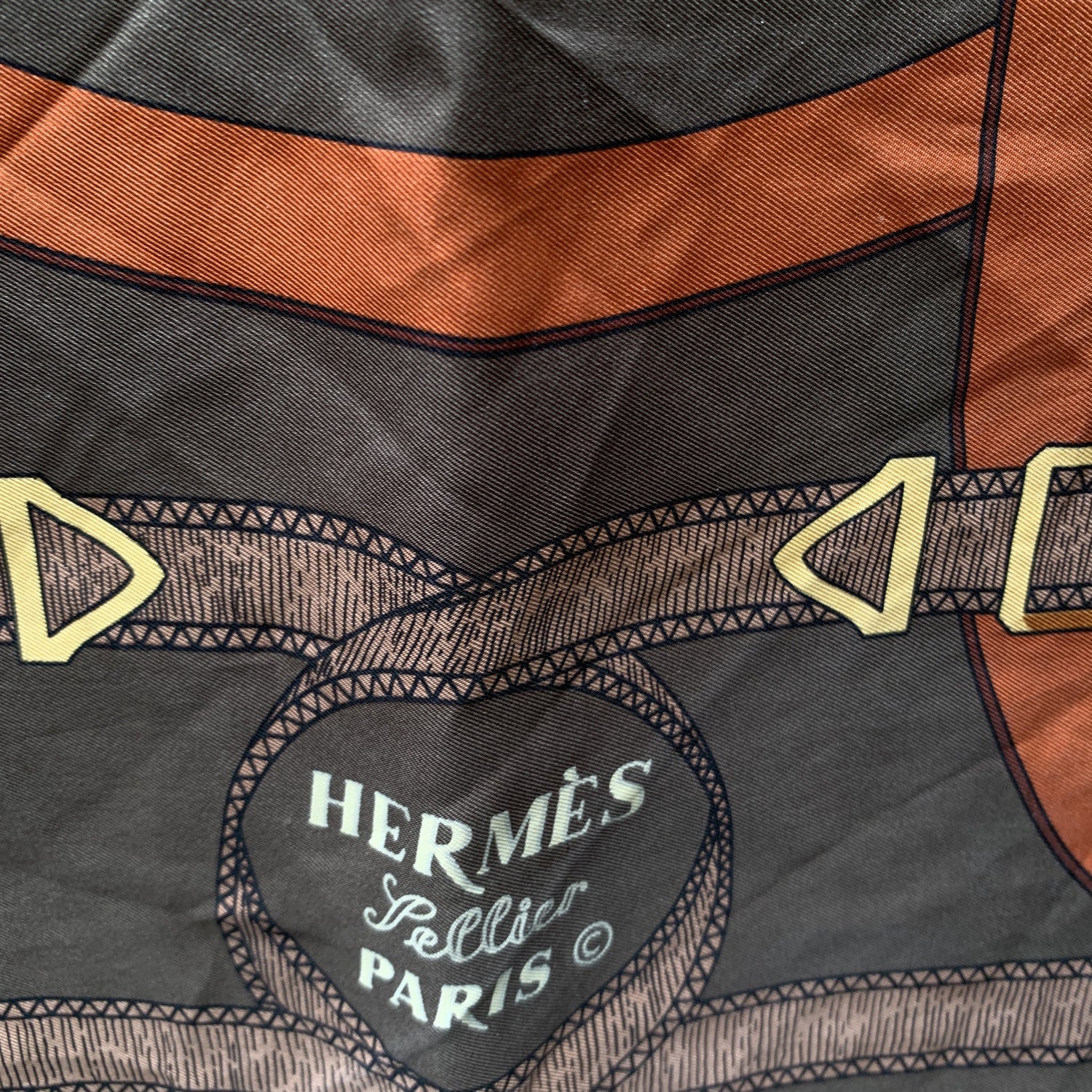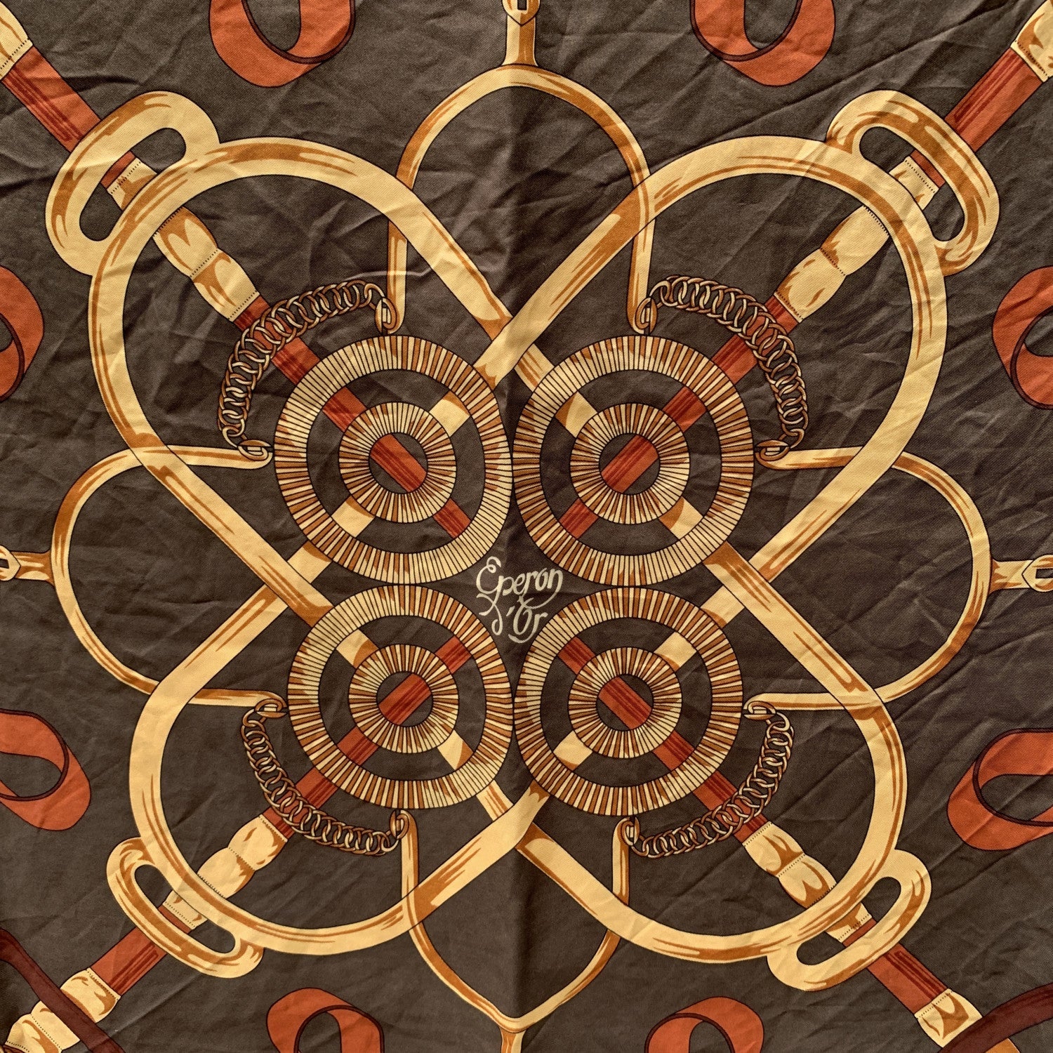 Hermes Silk Scarf Named 'Eperon D'or', Designed By Henry D'origny And Issued The First Time In 1974. This Drawing Of Henri D'origny Inspired From The Equestrian World, Illustrates In An Interlacing Of Flanges, Rings, Hunting Crop And Stirrups, The Harness Of The Horses.It Has Re-issued Many Times, In Different Colours, Formats And Variations Of. 'Hermes Sellier Paris' And Copyright Symbol Printed On The Scarf. Black Border. 100% Silk. Hand Rolled Hem. An Enduring Icon In The World Of Hermès, Éperon D'or Is a Silk Masterpiece First Released In 1974, Brought To Life By The Refined Hand Of Designer Henri D'origny. A Celebration Of Equestrian Elegance, The Design Intricately Weaves Together Bridles, Stirrups, Rings, And Hunting Crops-elements Of Fine Horse Harnesses-into a Symmetrical Ballet Of Leather And Metal, Evoking Both Tradition And Movement. Reissued Many Times Over The Decades In Various Formats, Colors, And Interpretations, This Version Features a Striking Black Border That Frames The Golden Tones And Complex Design With Timeless Sophistication. Crafted From 100% Silk With a Hand-rolled Hem, The Scarf Bears The Distinct Hermès Sellier Paris Marking Along With a Copyright Symbol, Affirming Its Authenticity And Storied Lineage. A True Classic In The Hermès Canon, Éperon D'or Is Not Just a Scarf-it's a Tribute To Craftsmanship, Heritage, And The Enduring Beauty Of The Equestrian Spirit.