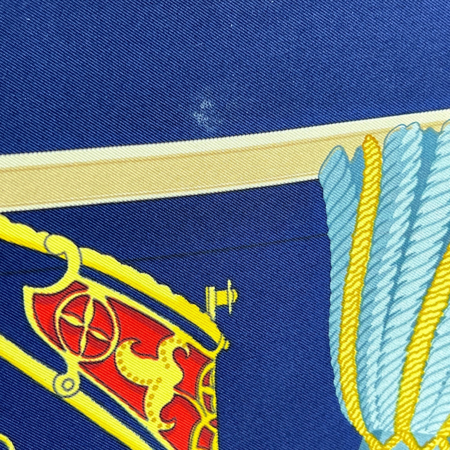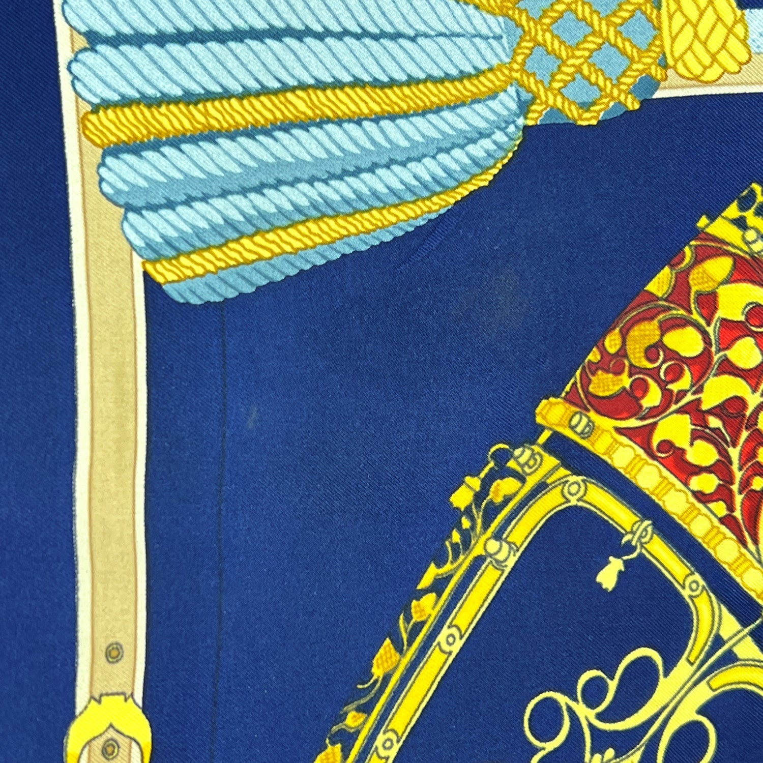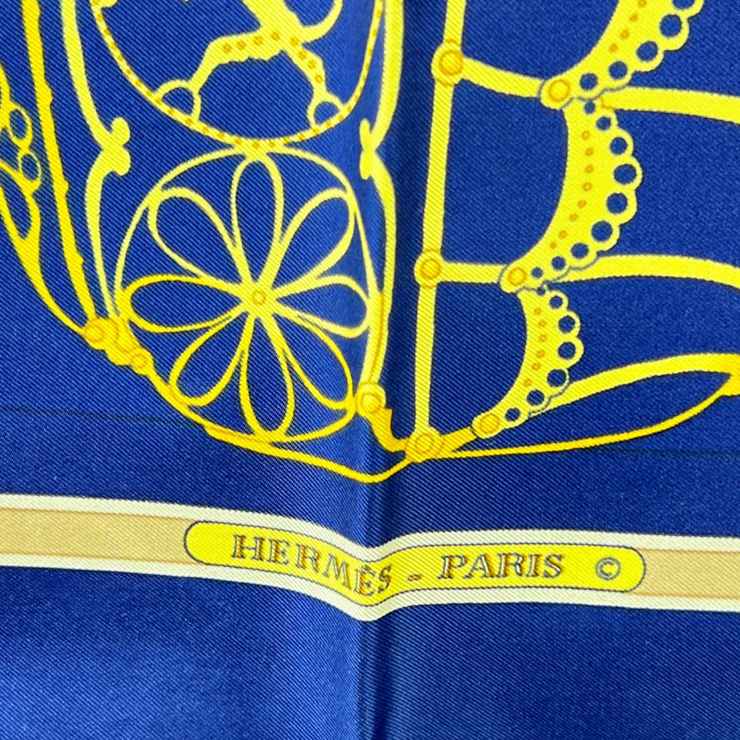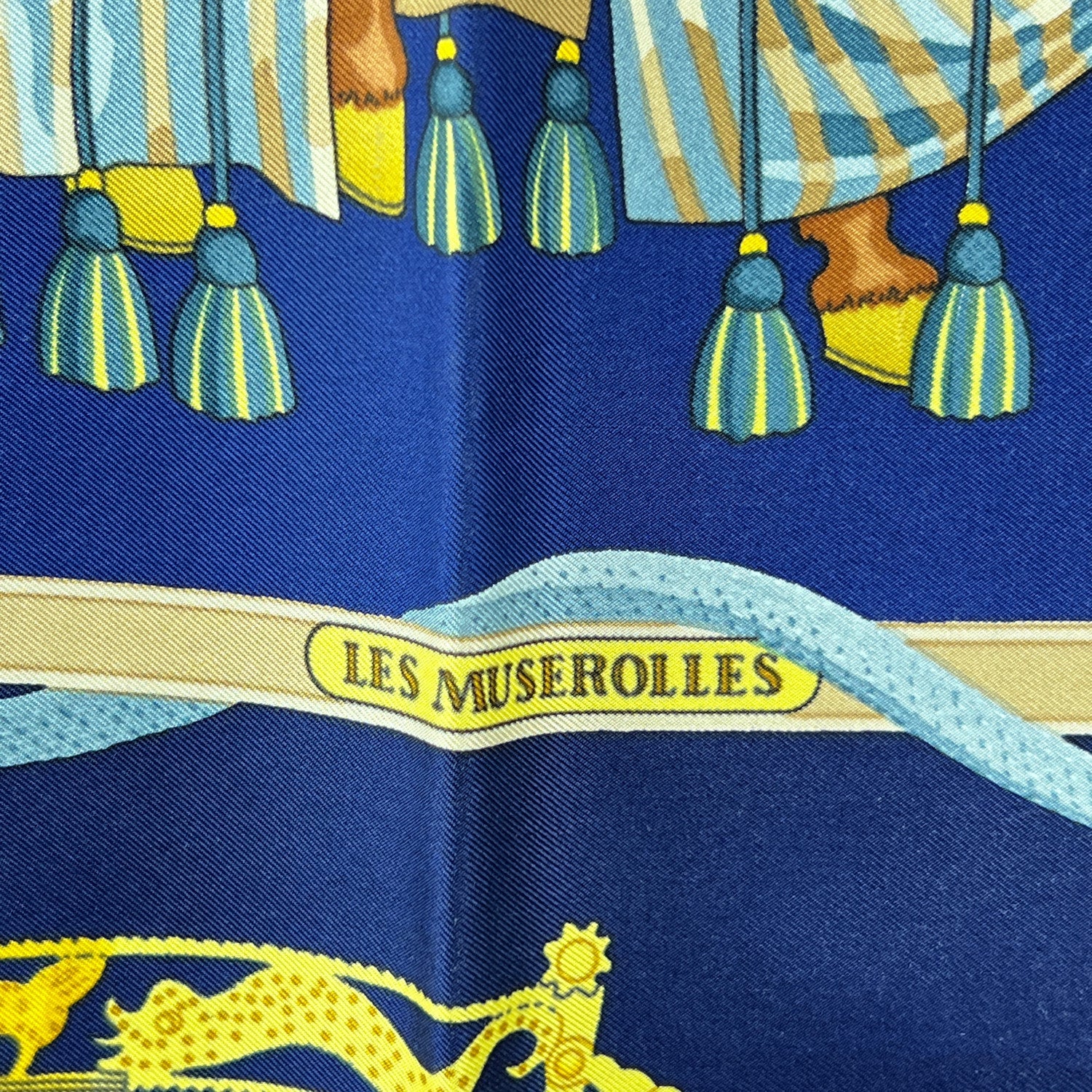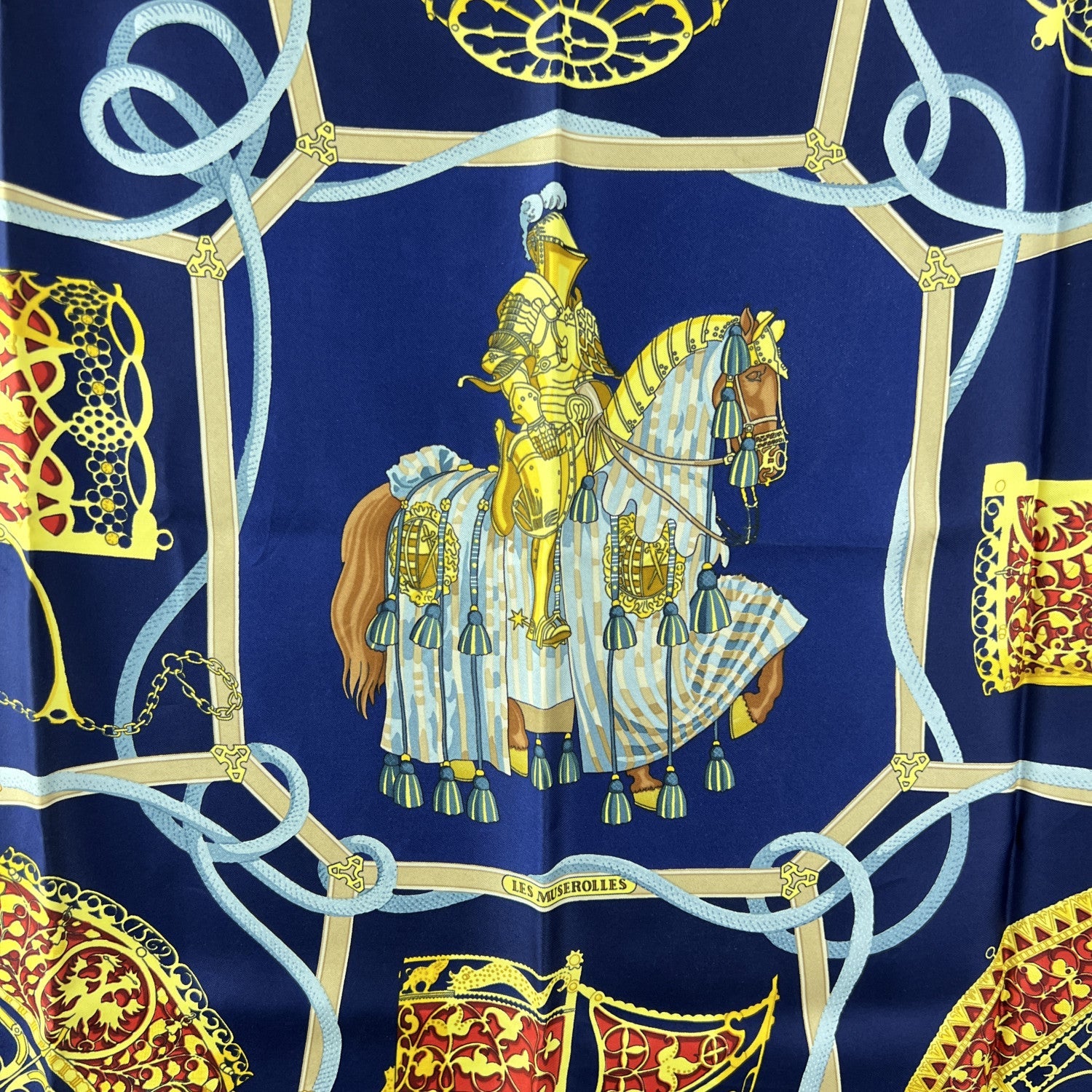 Step Into The Storied World Of Chivalry With This Stunning Hermès Silk Scarf Titled 'Les Muserolles', Designed By Christiane Vauzelles And First Issued In 1986. A Tribute To Equestrian History And Medieval Pageantry, The Scarf Features a Knight In Full Armor Astride His Steed, Surrounded By An Intricate Array Of Ornamental Horse Nosebands - Known As Muserolles. Set Against a Deep Blue Background, The Design Is Both Bold And Refined, Capturing The Timeless Craftsmanship And Storytelling Hermès Is Renowned For. At The Center Bottom Sits The Classic 'Hermès Paris' With Copywrite Symbol Inscription, An Authentic Seal Of French Luxury. A Collector's Favorite And a Visual Ode To The Noble Bond Between Horse And Rider, 'Les Muserolles' Is More Than An Accessory - It's Wearable Art From The Golden Age Of Hermès Design.