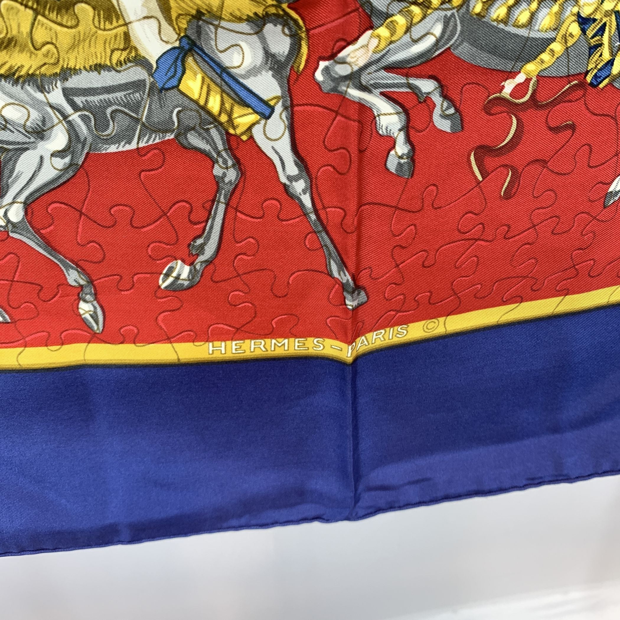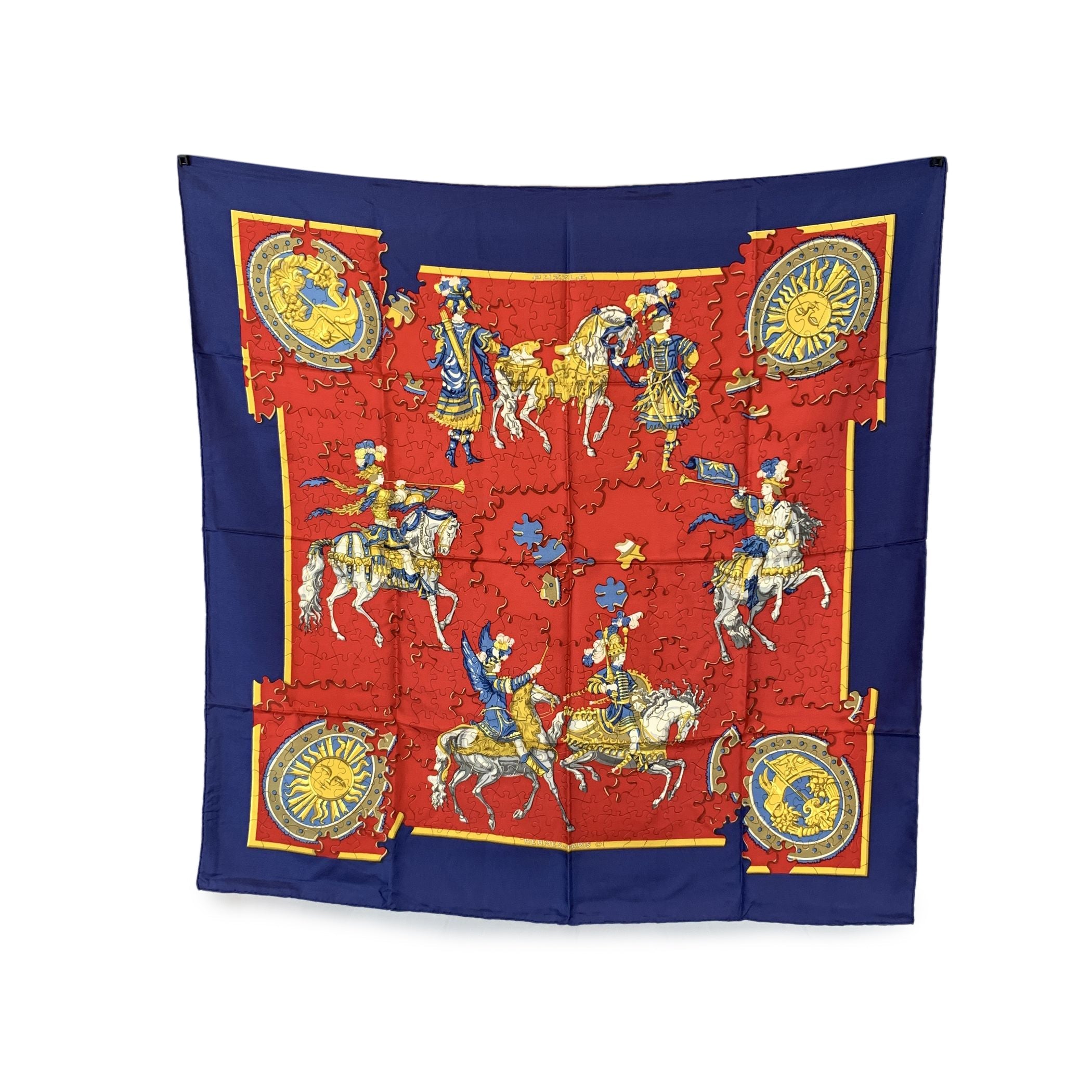 Vintage Hermès Scarf By Joachim Metz - Issued 1990 Step Into a World Of Playful Elegance With The Hermès Vintage "Puzzle" Silk Scarf, a Vibrant And Imaginative Creation By Celebrated Designer Joachim Metz, Released In The Spring Of 1990. Bursting With Charm And Intricate Detail, This Carre 90 Showcases Hermès' Flair For Turning Everyday Themes Into Timeless Silk Artistry. Set Against a Bold Red Background, The "Puzzle" Design Unravels Like a Visual Riddle-interlocking Shapes, Whimsical Motifs, And Dynamic Symmetry That Invite The Eye To Explore. It's a Conversation Piece, a Collector's Gem, And a Joyful Expression Of Creativity All In One. Crafted In France From 100% Silk Twill, The Scarf Features The Rich Texture And Luster Hermès Is Known For. Its 90 Cm x 90 Cm Frame Allows For Versatile Styling-draped, Tied, Or Framed-and The A - Excellent