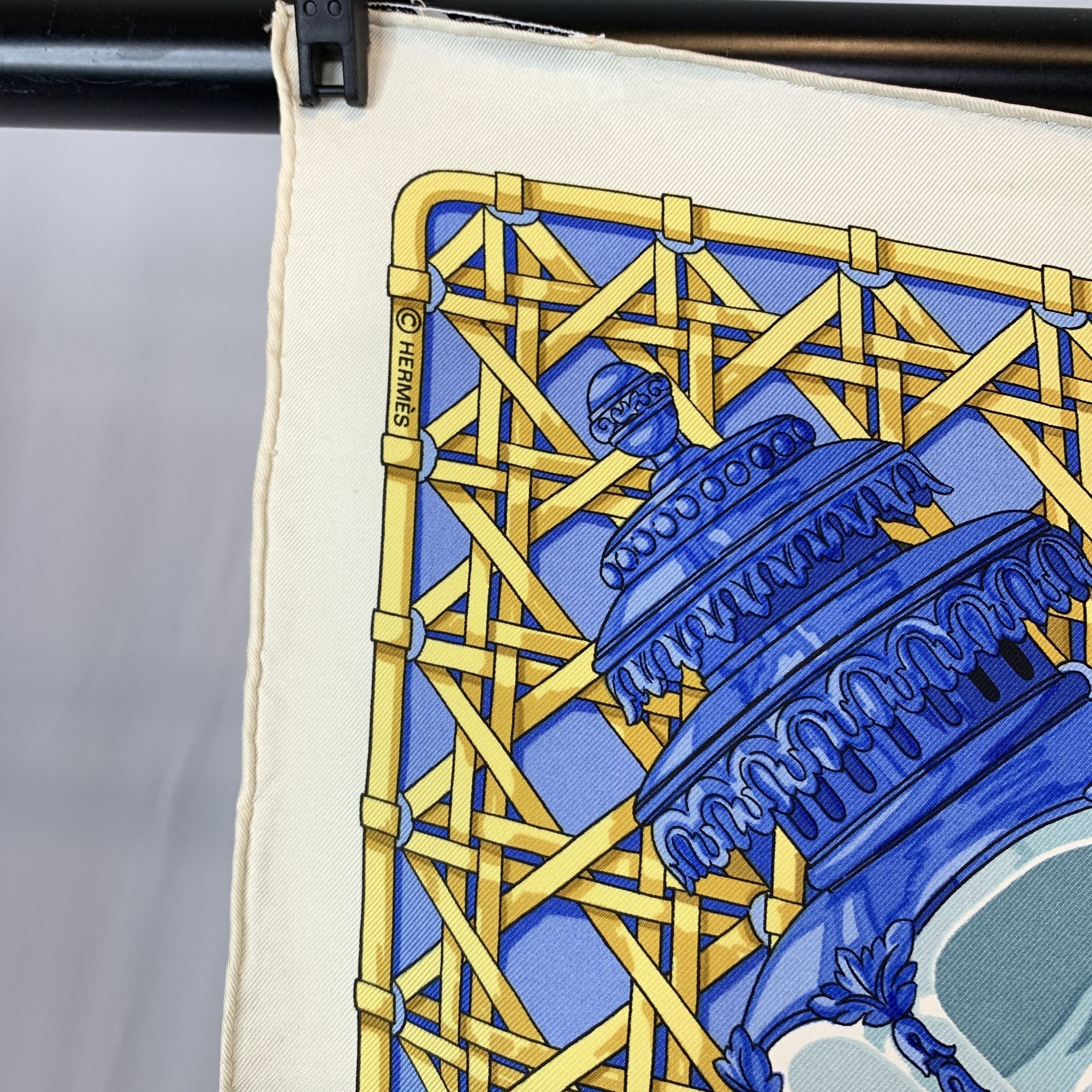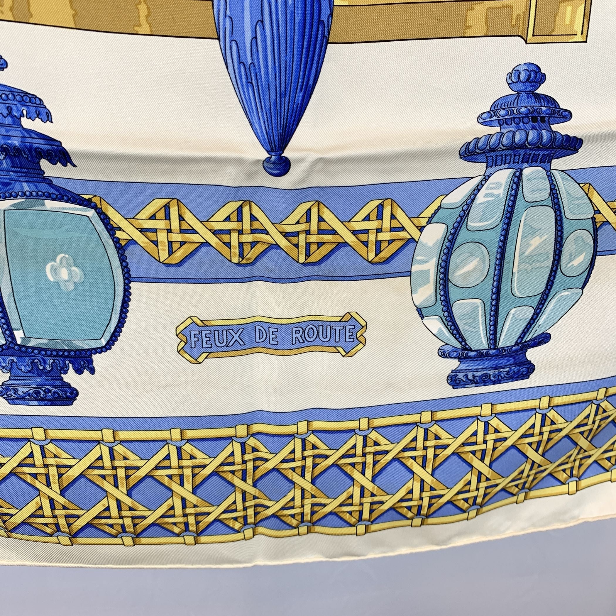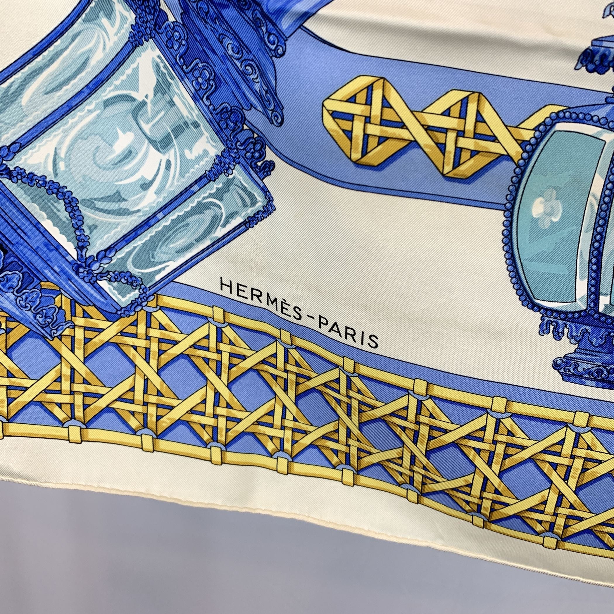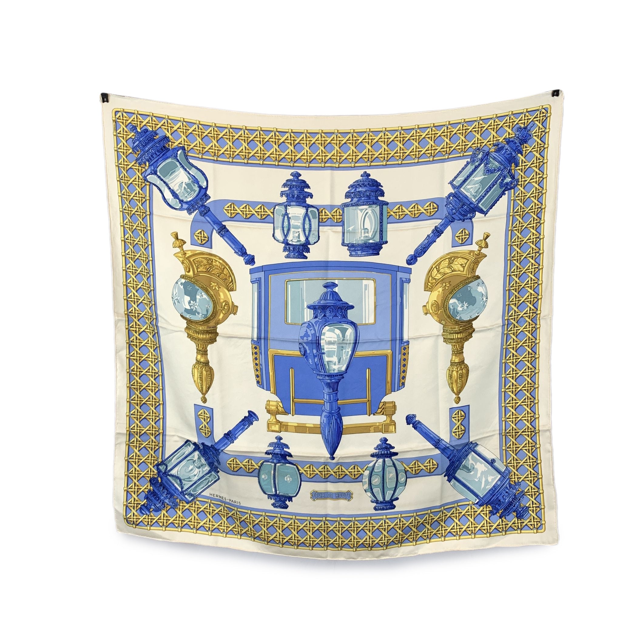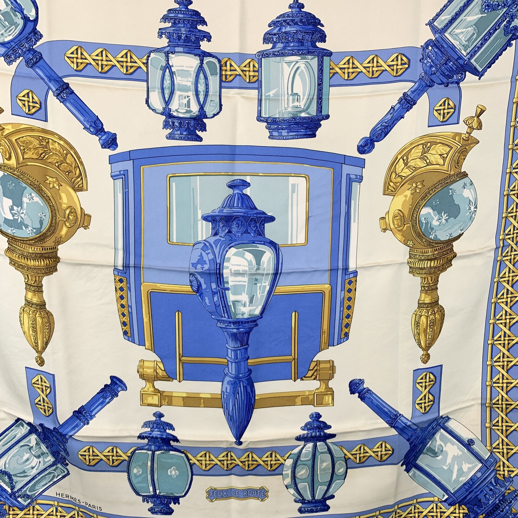 "Feux De Route" - Hermès Silk Scarf By Caty Latham (First Issued 1971) A Timeless Design That Captures The Grandeur Of Travel In The Golden Age Of Carriages, Feux De Route-or "Road Lights"-Was First Imagined By Caty Latham For Hermès In 1971. This Beloved Model Has Seen Many Reissues Over The Years, In An Array Of Colors And Formats, Yet This Version In Striking Yellow Gold, Light Blue And Off-white Remains Among The Most Dramatic And Elegant. At Its Heart Is a Noble Horse-drawn Coach, Framed By a Bold Arrangement Of Oversized Antique Carriage Lamps, Each Rendered In Exquisite Detail. The Composition Is Both Ornate And Balanced, a True Tribute To Craftsmanship And Motion. Measuring Approximately 90 x 90 Cm, This 100% Silk Carré Is Finished With The Signature Hermès Hand-rolled Edges-an Enduring Hallmark Of The Maison's Quality. The Color Palette Of Deep Black And Glowing Gold Lends It a Rich, Sophisticated Tone, Ideal For Collectors Or Anyone Drawn To The Romance Of Historic Travel. Feux De Route Is More Than a Scarf-it's a Gleaming Echo Of Elegance On The Move.