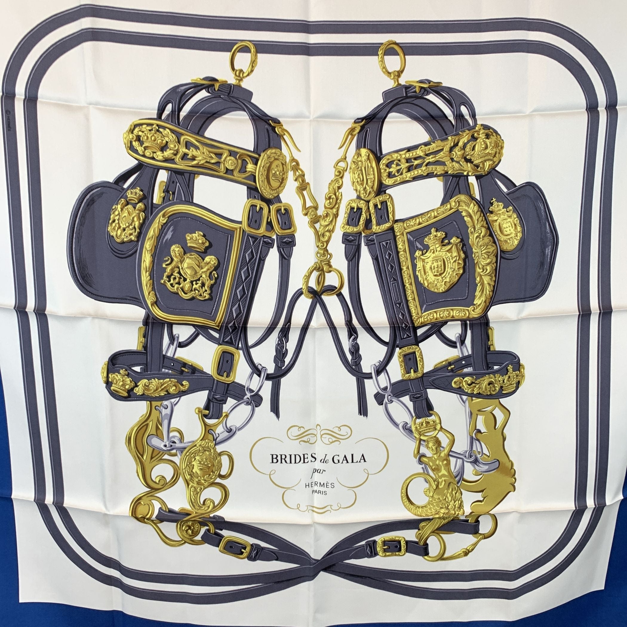 "Brides De Gala" - Hermès Silk Scarf By Hugo Grygkar (First Issued 1957) A Pillar Of Hermès Heritage, Brides De Gala Is One Of The Maison's Most Iconic And Enduring Scarf Designs. First Created By Hugo Grygkar In 1957, This Timeless Classic Continues To Be Reissued Decade After Decade-an Unmistakable Symbol Of Equestrian Elegance And Parisian Refinement. The Design Showcases Two Elaborately Adorned Bridles, Inspired By Those Used To Harness Ceremonial Horse-drawn Carriages. With Their Intricate Fastenings And Ornate Metalwork, They Evoke The Noble Pageantry Of Old-world Travel. The Composition Is Framed By Deep Blue Borders That Offer a Bold Contrast To The Golden Detailing Within. Crafted In France From 100% Silk And Finished With Hand-rolled Hems, This Carré Measures 35 x 35 Inches (88.8 x 88.8 Cm). The Inscription Hermès Paris Is Delicately Printed At The Center, Affirming Its Legacy. Brides De Gala Isn't Just a Scarf-it's a Piece Of Hermès History, Revered By Collectors And Fashion Lovers Alike For Nearly Seven Decades.
