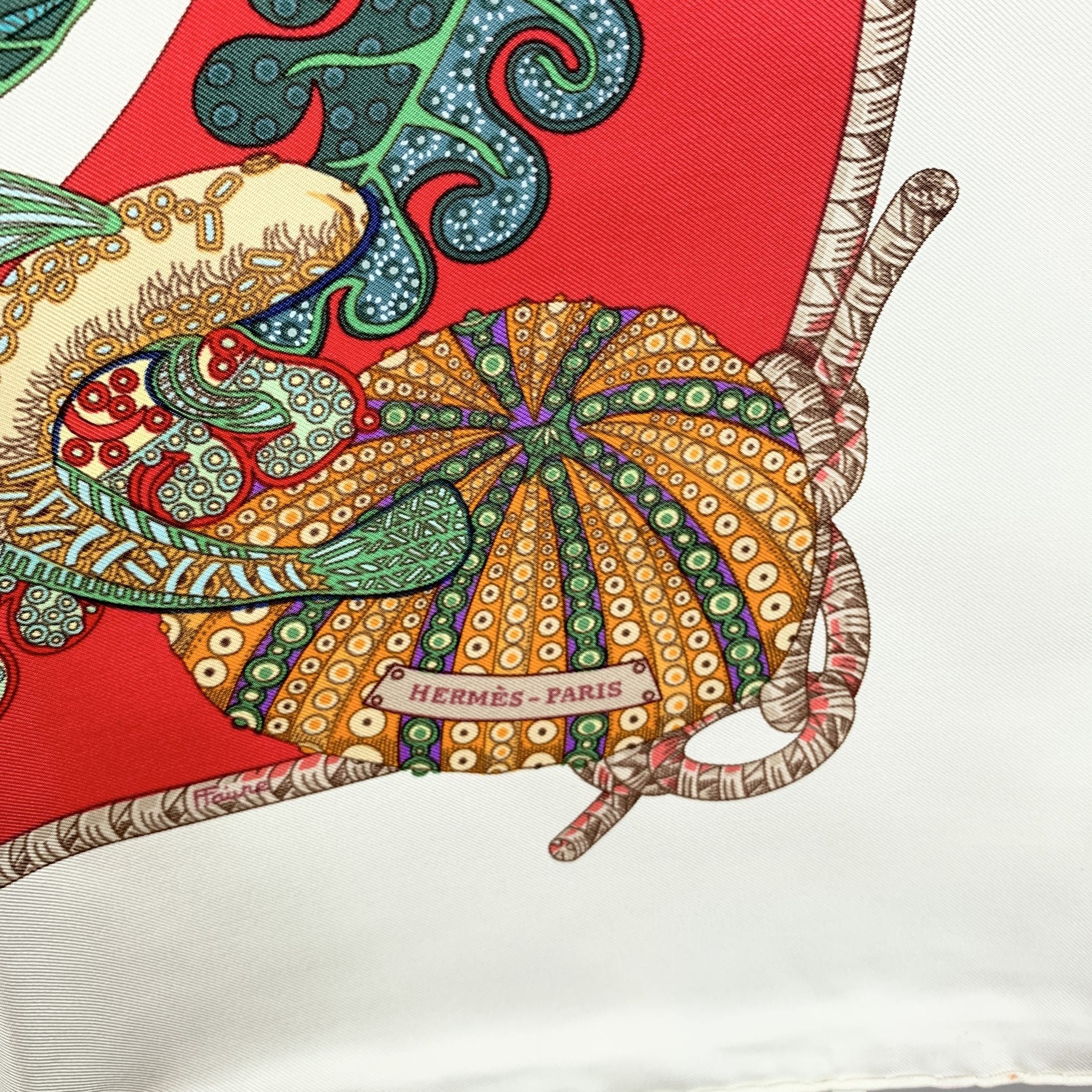 This Beautiful Hermes Silk Scarf, 'Grands Fonds' (Great Deeps), Designed By Annie Faivre, Is a Stunning Tribute To The Vibrant And Mysterious World Beneath The Sea. First Issued In 1992, This Design Was So Beloved That It Was Reissued Multiple Times, Appearing In The Spring/summer Collections Of 1993, 1998, 2000, And 2001. The Design Beautifully Represents The Fauna Of The Seabed, With Intricate Depictions Of Fish, Seaweed, And Corals In a Breathtaking Array Of Colors. The Scarf Features a White Background That Makes The Multicolored Drawings Of Red, Yellow, Blue And Green Pop, Capturing The Lively And Colorful Nature Of The Ocean's Depths. Hermes Paris Is Printed On The Scarf, Marking It As An Authentic Piece Of Luxury Craftsmanship. Made From 100% Silk, This Scarf Is a Luxurious Accessory, With Hand-rolled Edges That Reflect Hermes' Commitment To Detail And Quality. With Approximate Measurements Of 35 x 35 Inches (88.8 x 88.8 Cm), It Offers Versatility In Styling-whether Worn Around The Neck, As a Headscarf, Or Draped Over The Shoulders. Grands Fonds Is Not Just a Scarf But a Wearable Work Of Art, Bringing The Beauty Of The Ocean's Mysteries To Life In The Form Of Vibrant Colors And Intricate Design. It's a Perfect Addition To Any Hermes Collection Or For Those Who Appreciate The Elegance Of Nature Translated Into High Fashion. Hermes Tag Still Attached.