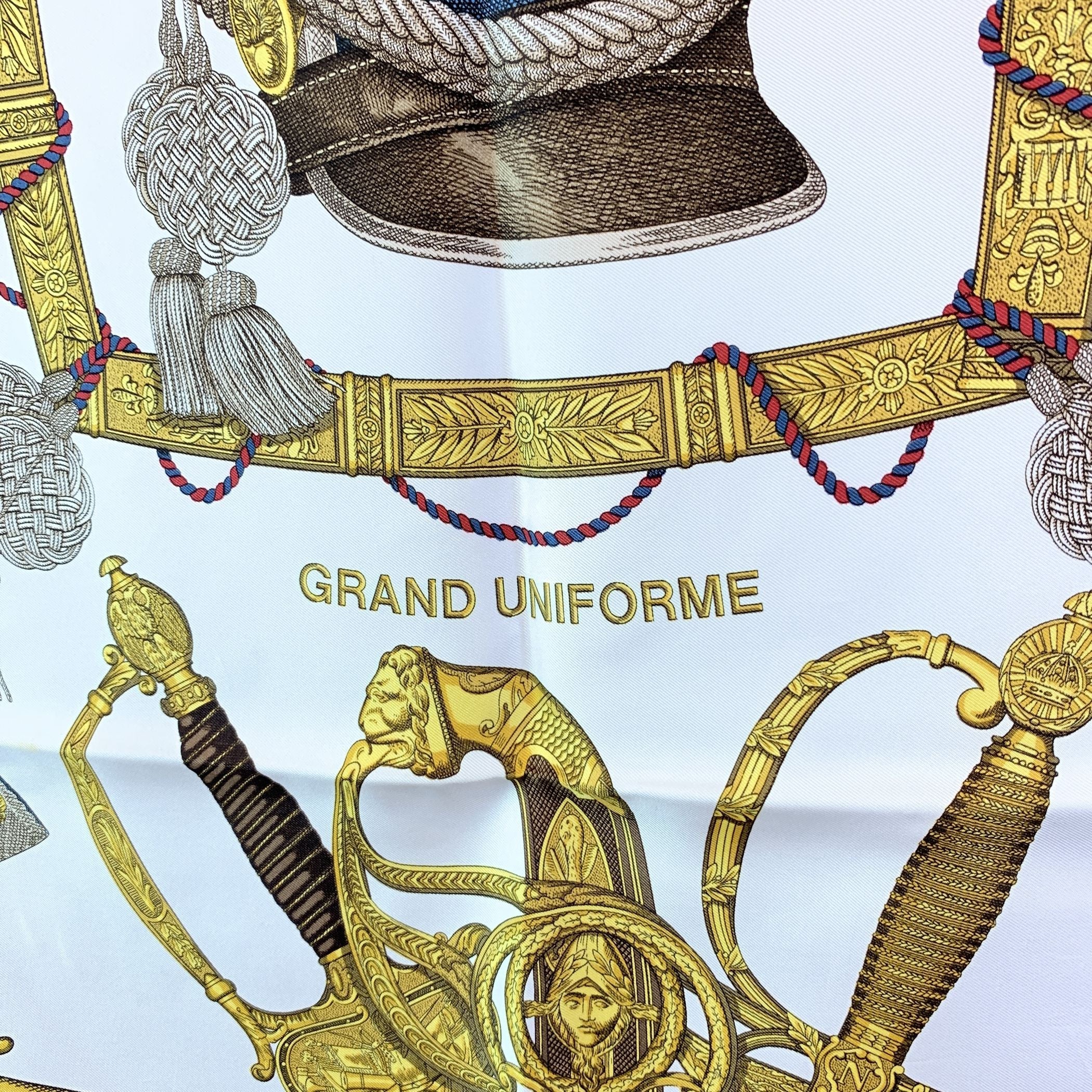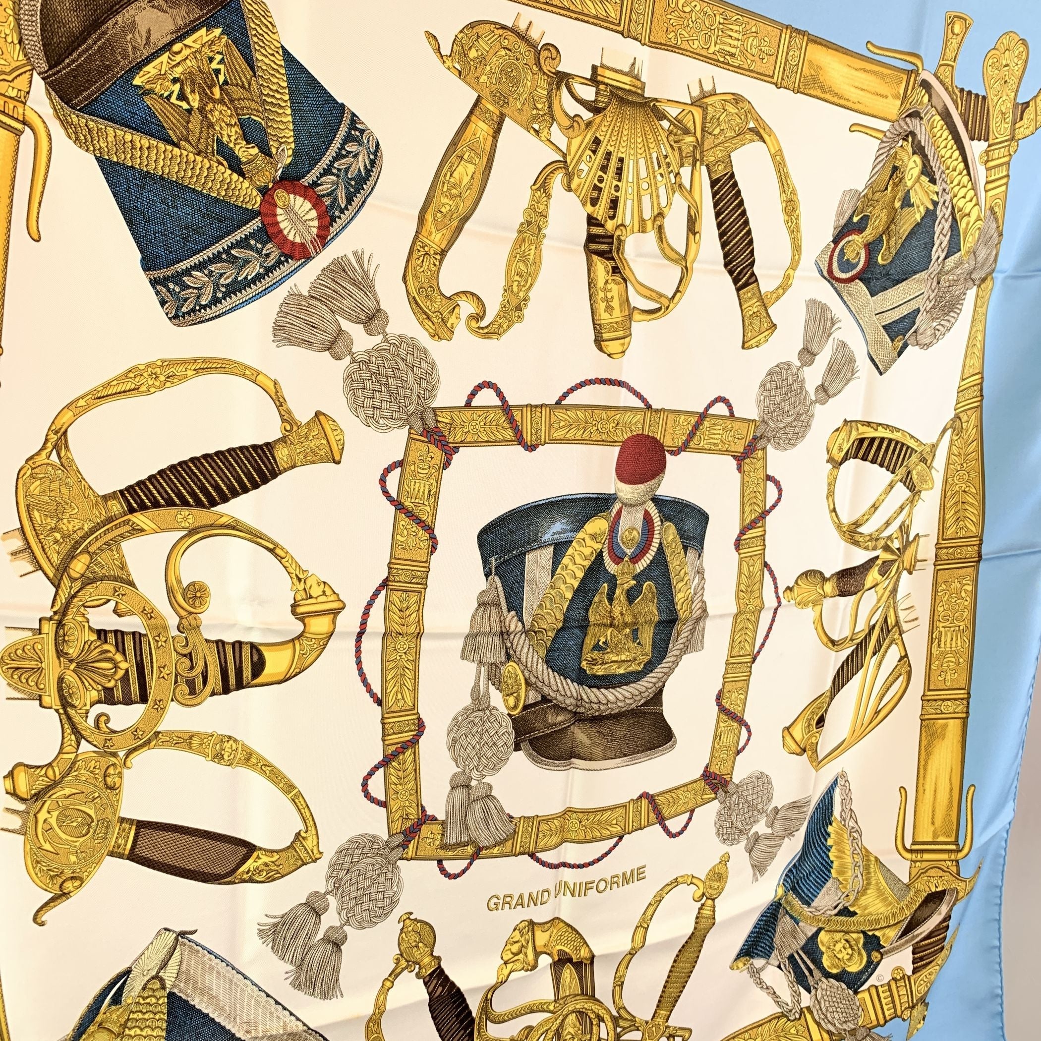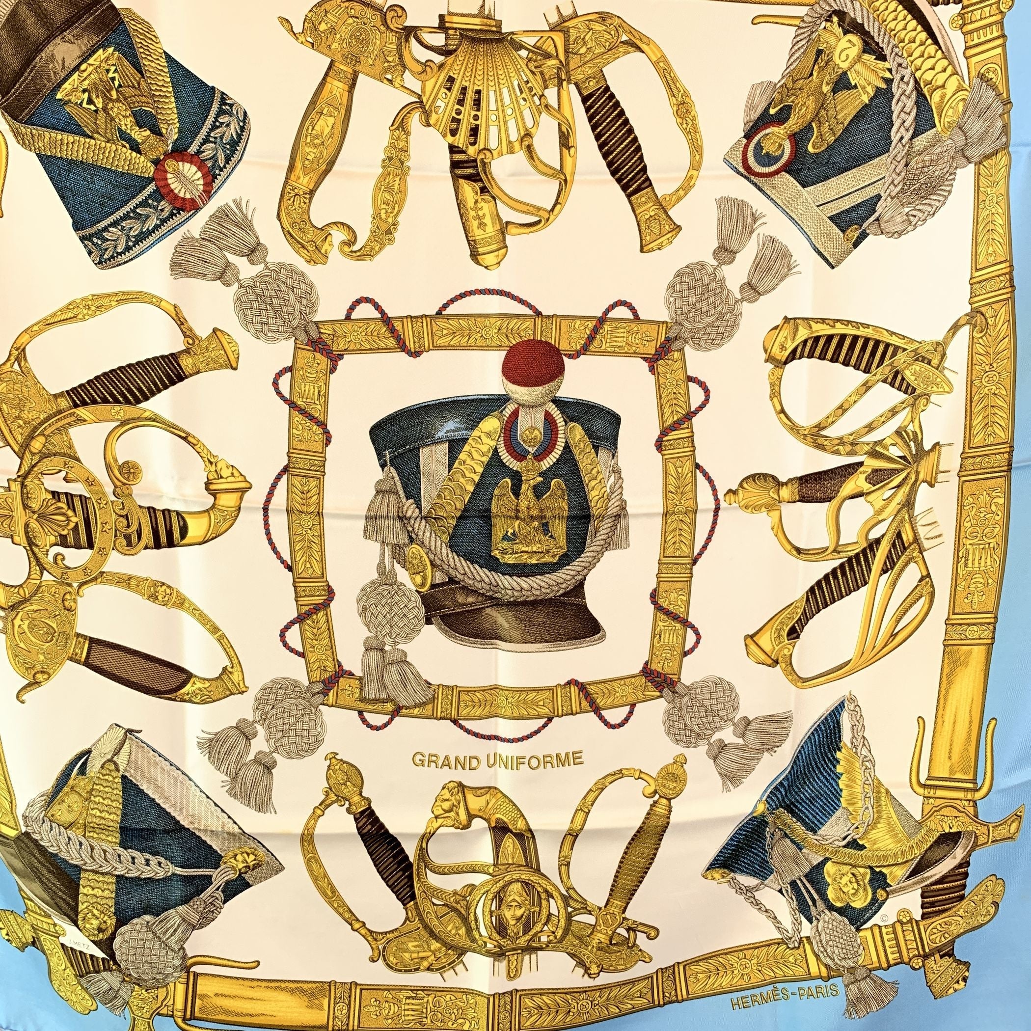 Hermès Vintage Silk Scarf - "Grand Uniforme" By Joachim Metz (Circa 1985) An Elegant And Collectible Hermès Silk Carré, Titled "Grand Uniforme", Designed By Joachim Metz And First Issued Around 1985. This Exquisite Design Celebrates The Regalia And Grandeur Of Military Ceremonial Attire, Showcasing Ornate Helmets, Plumed Hats, And Decorative Insignia In Rich Detail. The Scarf Features a White Background Framed By a Light Blue Border, With The Intricate Motif Set Against a White Center-a Refined And Balanced Color Combination That Enhances The Historical Theme. Signed "Hermès - Paris", It Exemplifies The Maison's Mastery In Both Artistry And Craftsmanship. Title: Grand Uniforme Artist: Joachim Metz Year: Circa 1985 Material: 100% Silk Finish: Hand-rolled Edges Signature: "Hermès - Paris" A Striking Vintage Carré That Perfectly Blends Heritage, Elegance, And Artistry, Making It a Highly Desirable Piece For Any Hermès Collector Or Lover Of Timeless Silk Scarves.