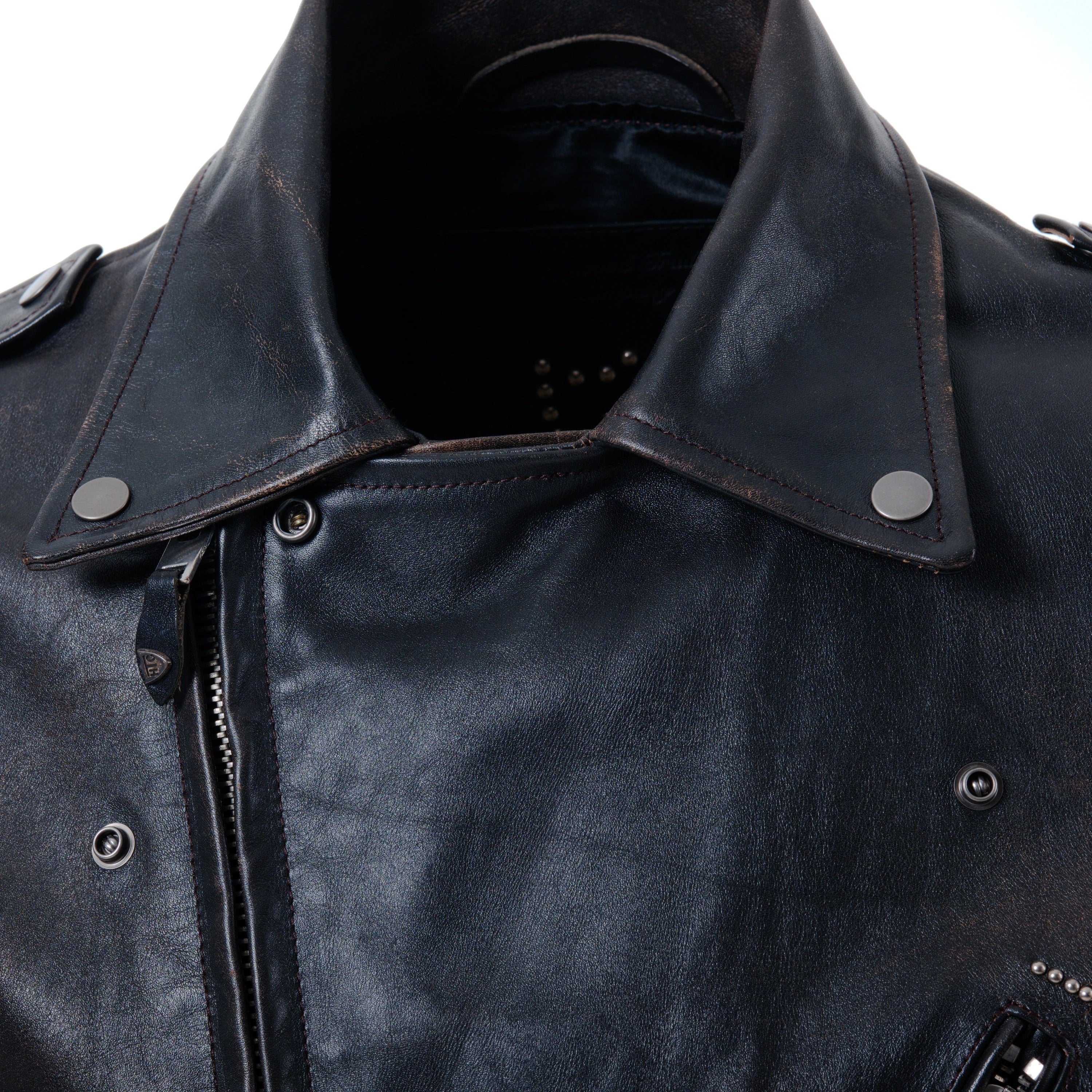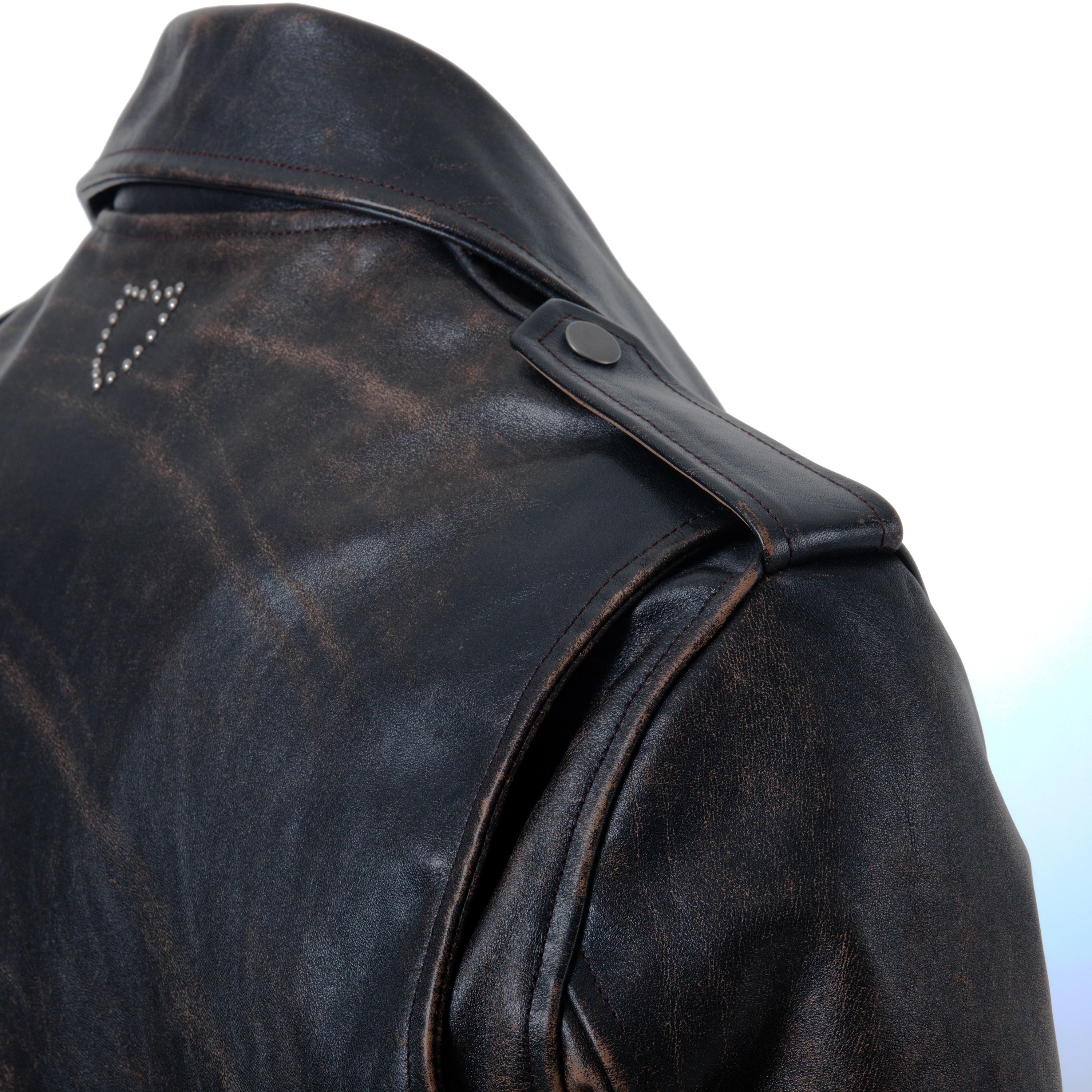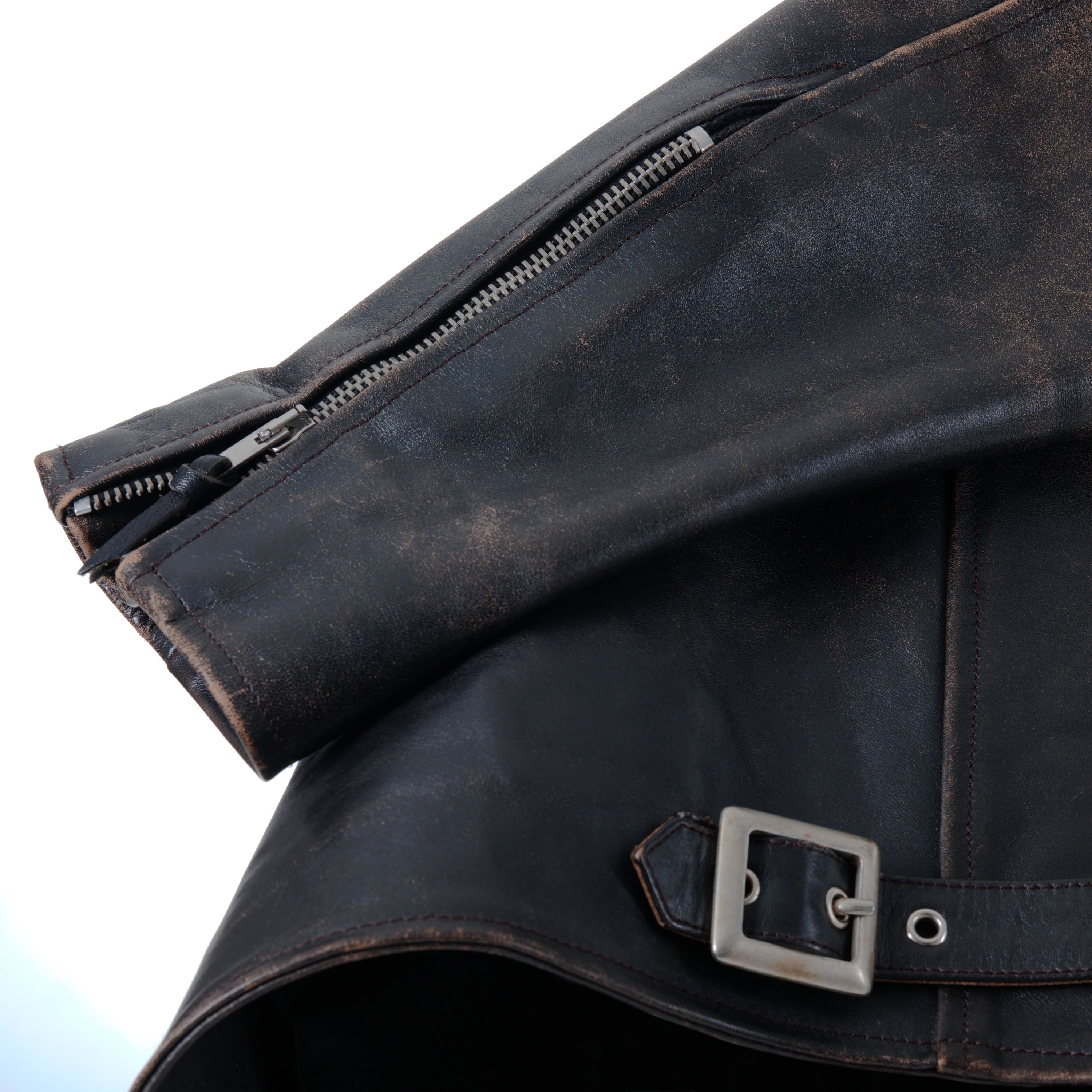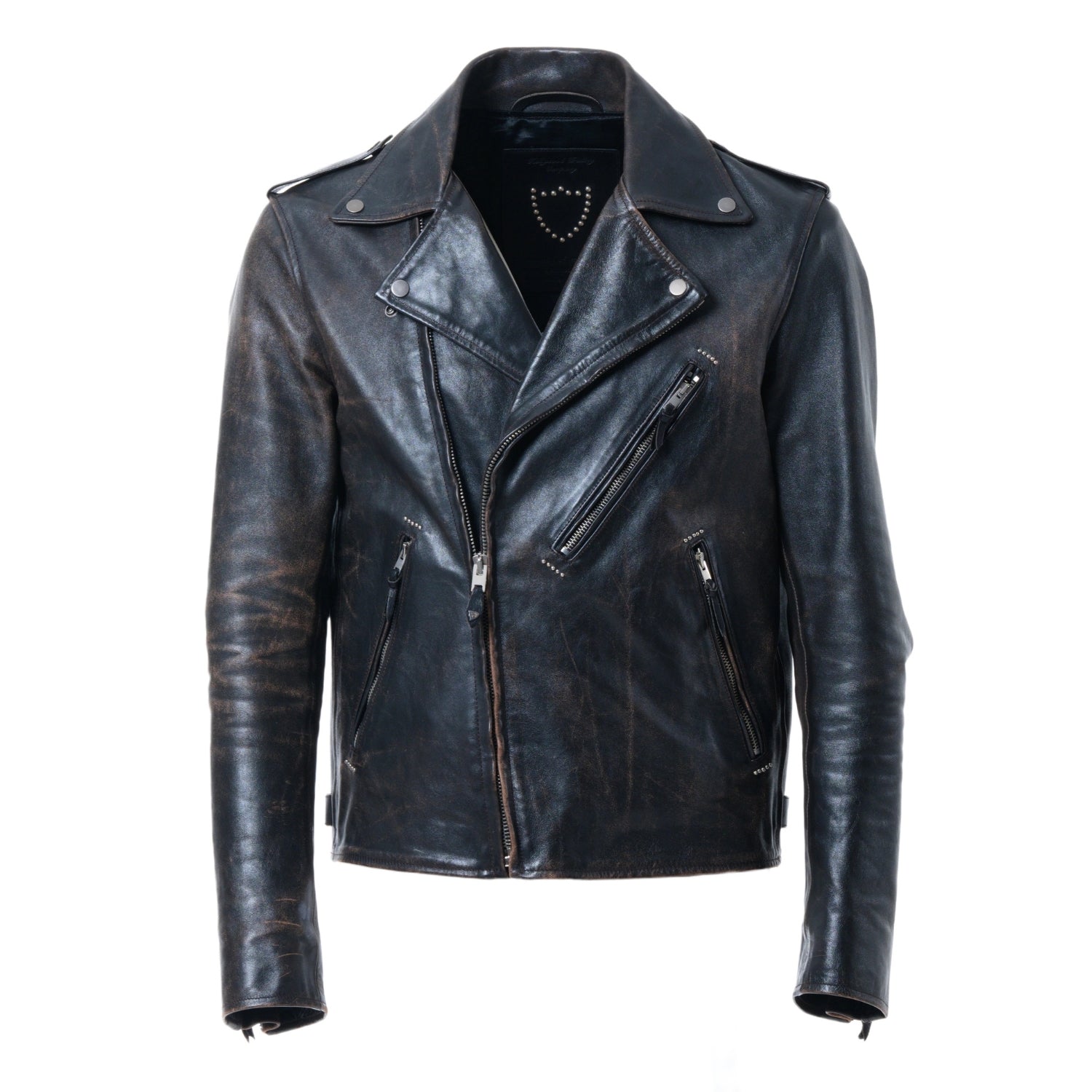 An authentic vintage-inspired biker jacket by Hollywood Trading Company, crafted in Italy from 100% premium leather. Distressed by design, it features metal zips, side buckles and signature HTC stud details. A rare collector’s piece with a beautifully aged patina.