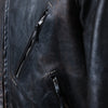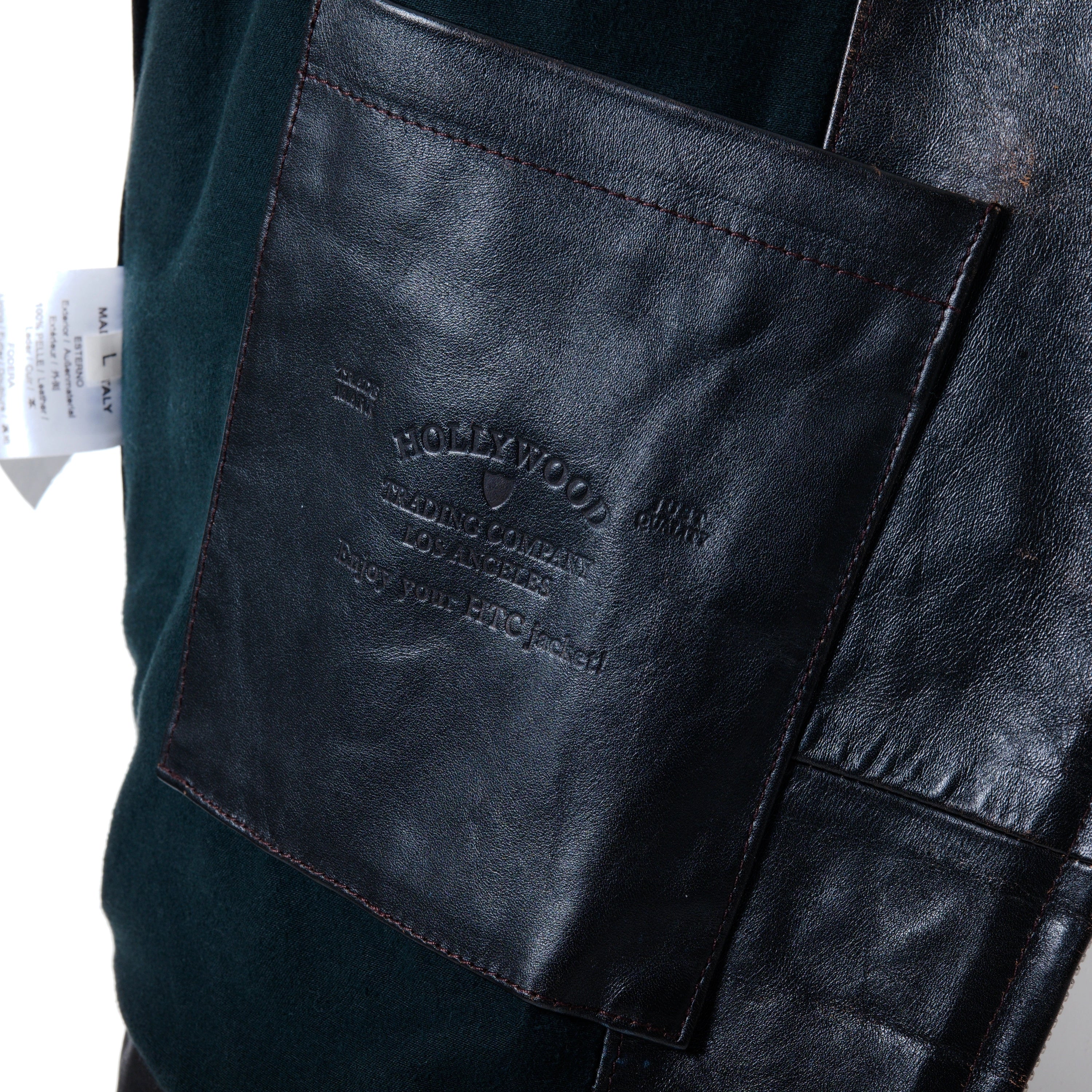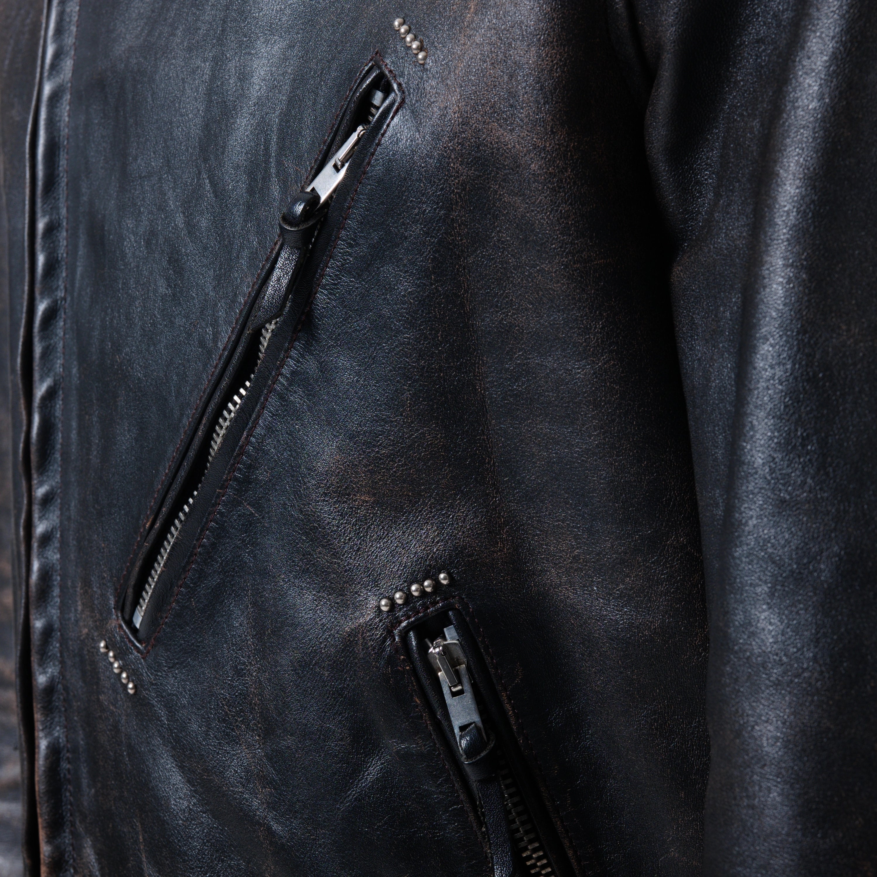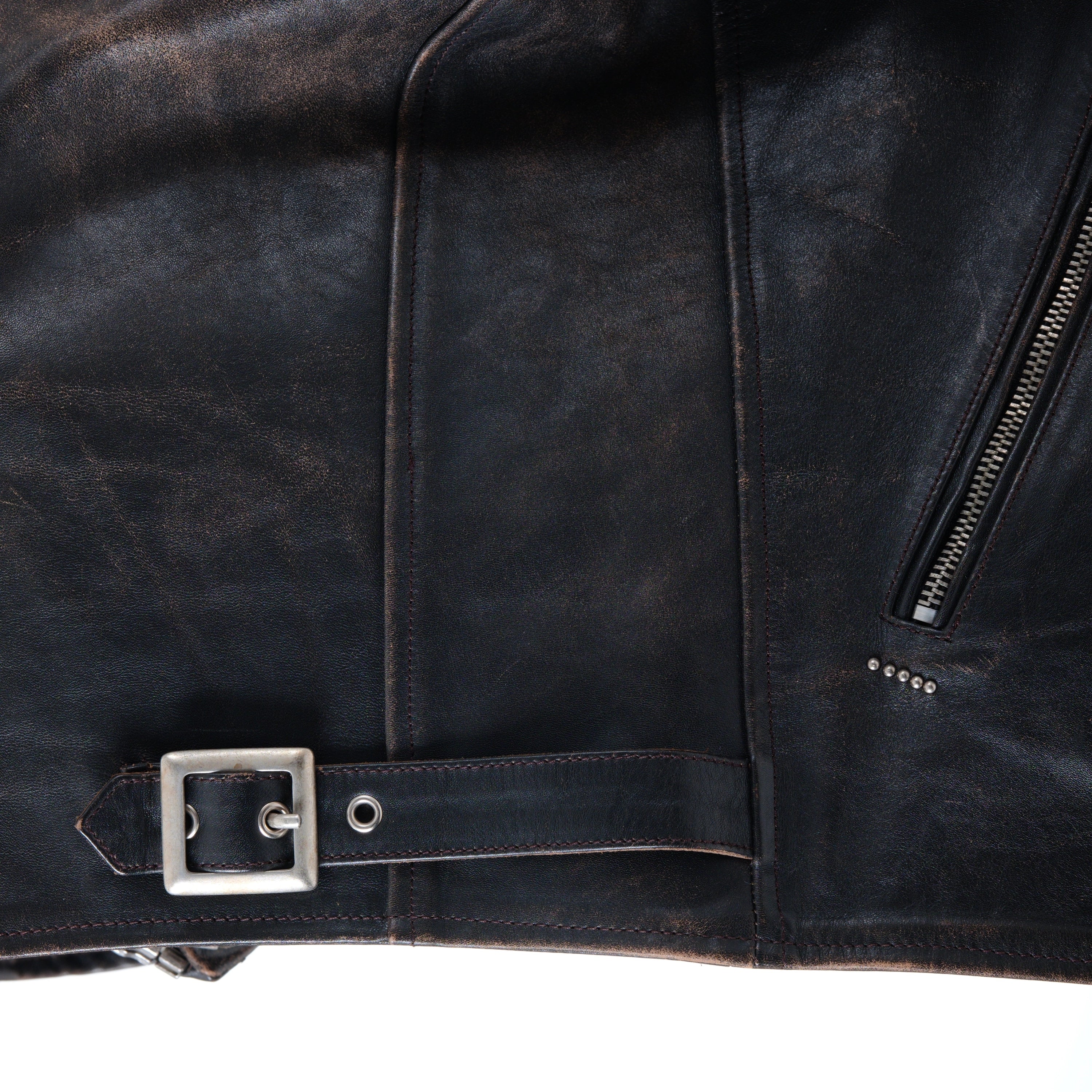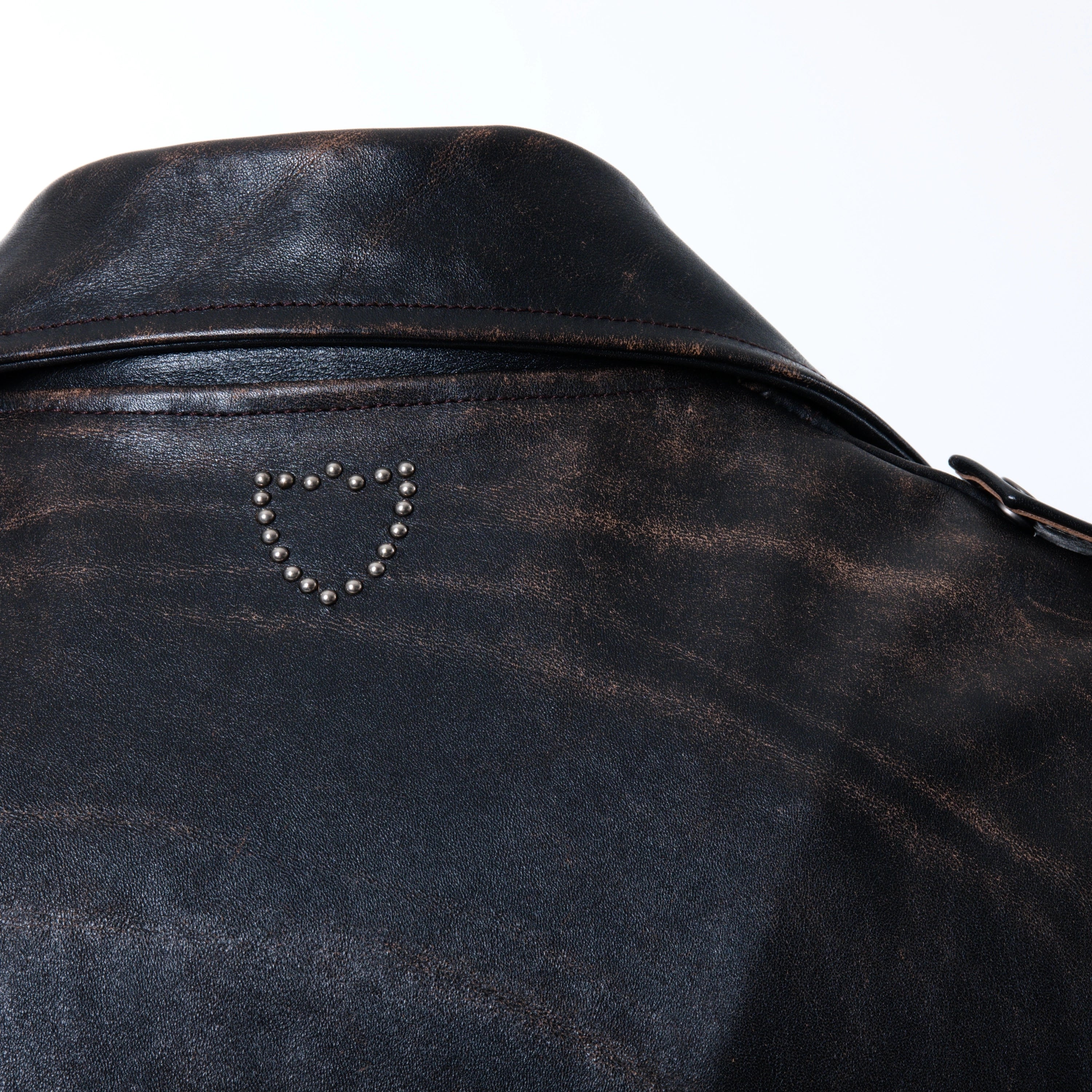 An authentic vintage-inspired biker jacket by Hollywood Trading Company, crafted in Italy from 100% premium leather. Distressed by design, it features metal zips, side buckles and signature HTC stud details. A rare collector’s piece with a beautifully aged patina.