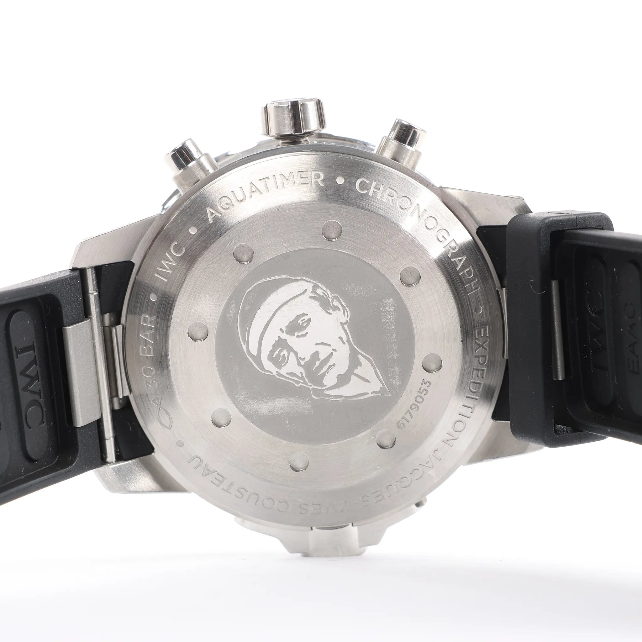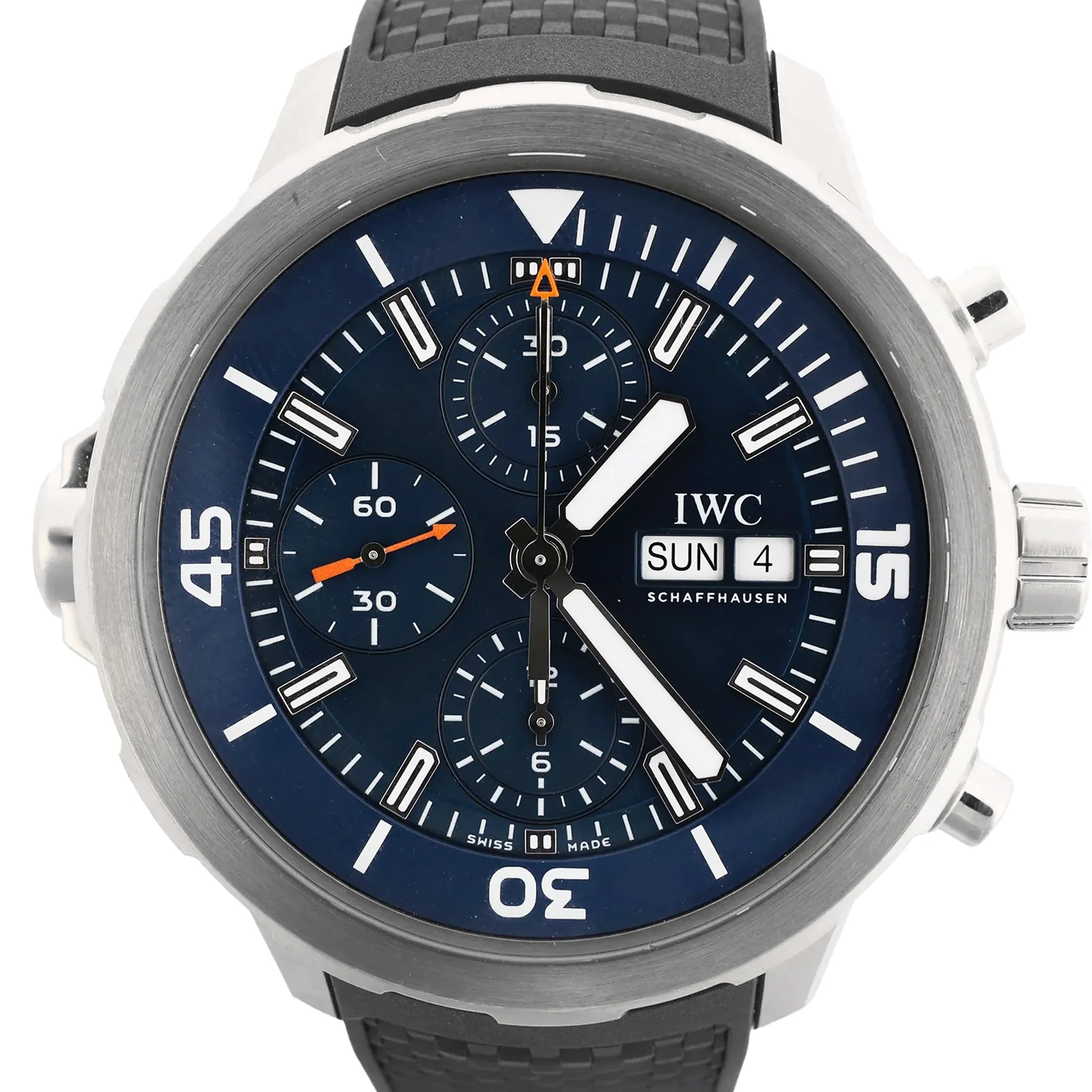 Brand: IWCModel: AquatimerReference: IW376805Serial No.: 6179053Condition: ExcellentCondition Details: Excellent overall condition with almost no visible signs of use. Barely noticeable hairline marks may be present, but they are not visible to the naked eye. Please see photos for details. Dial Colour: Navy BlueCase Material: Stainless steelStrap Colour: BlackStrap material: RubberMovement: AutomaticFace Diameter: 46 mmApprox. max circumference: 19.5 cmComes With: Box, certificate, brand booklet, Service card