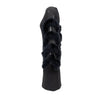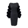Black midi dress by Jean Paul Gaultier pairs a stretchy cotton body with dramatic bell sleeves layered in soft feathers and flowing fringe.