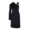 This unique coat style dress is crafted from a premium wool blend in black. The one-shoulder design is highlighted by a silk sheer gathered panel. The dress features a velcro closure and two flap pockets. The soft, comfortable fabric is perfect for all occasions.