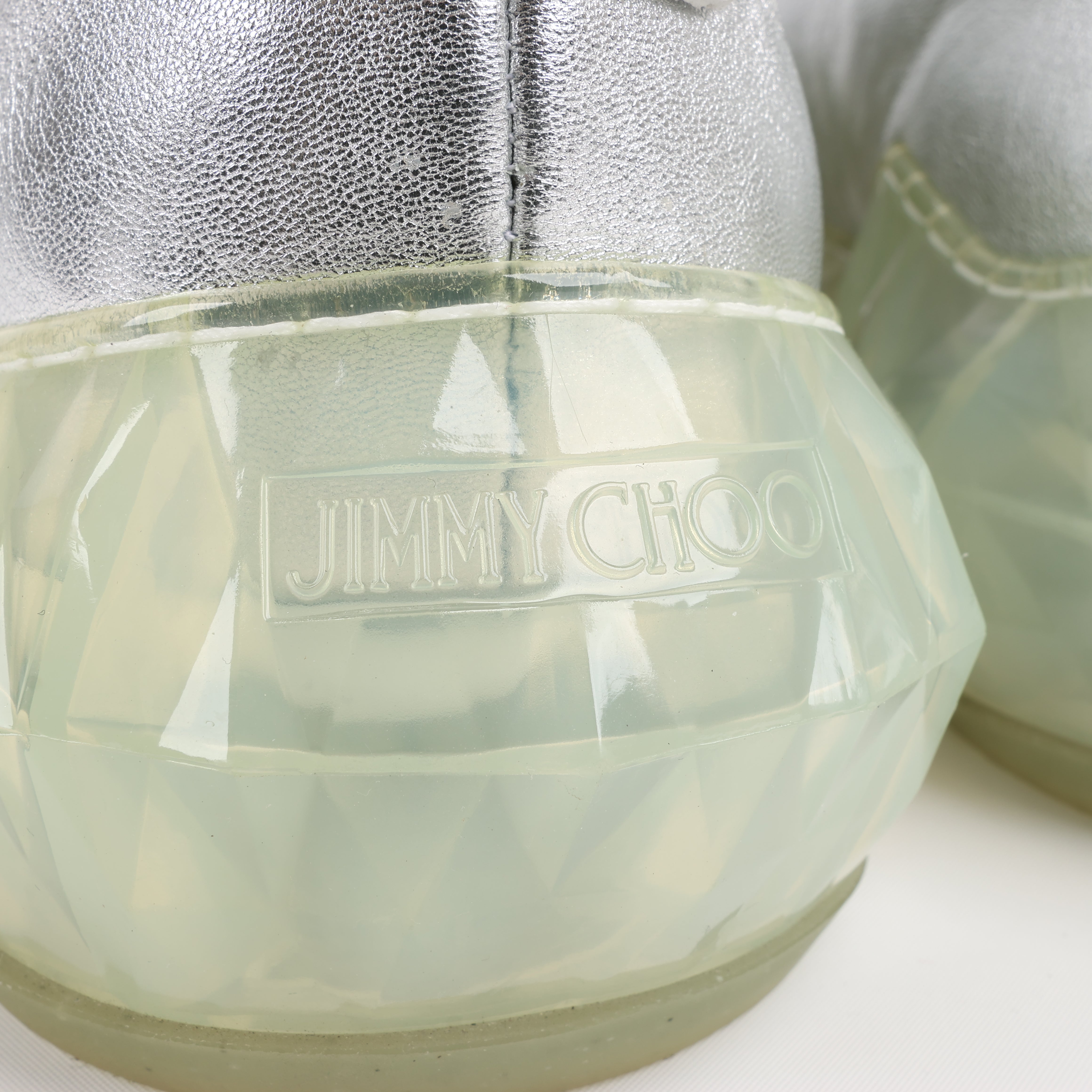 Brand: Jimmy ChooSize: EU 38Platform: 5.5 cmCondition: ExcellentCondition Details: Has light signs of wear on rubber outsole.Main Colour: WhiteColours: Silver, Transparent GreenishMain material: LeatherMaterials: RubberProduct Code: -Manufactured In: -Comes With: -
