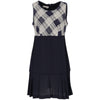 Karl Lagerfeld blue and white blazer and dress suit. Wool and polyester with decorative zig-zag fabric edges. Tartan blazer with rounded collar, padded shoulders, blu fabric long sleeves with flared cuffs, frontal closure with blu and silver decorative buttons. Empire style sleeveless dress with tartan wool bodice and blue flounced fabric skirt, hidden zip back closure, silk lining. The blazer shows some slightly pulled threads, as shown in the pictures.