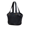 This tote bag features a canvas body with leather trim, flat leather handles, a top zip closure, an exterior slip pocket, and interior zip and slip pockets. Retail Price: 2200.00