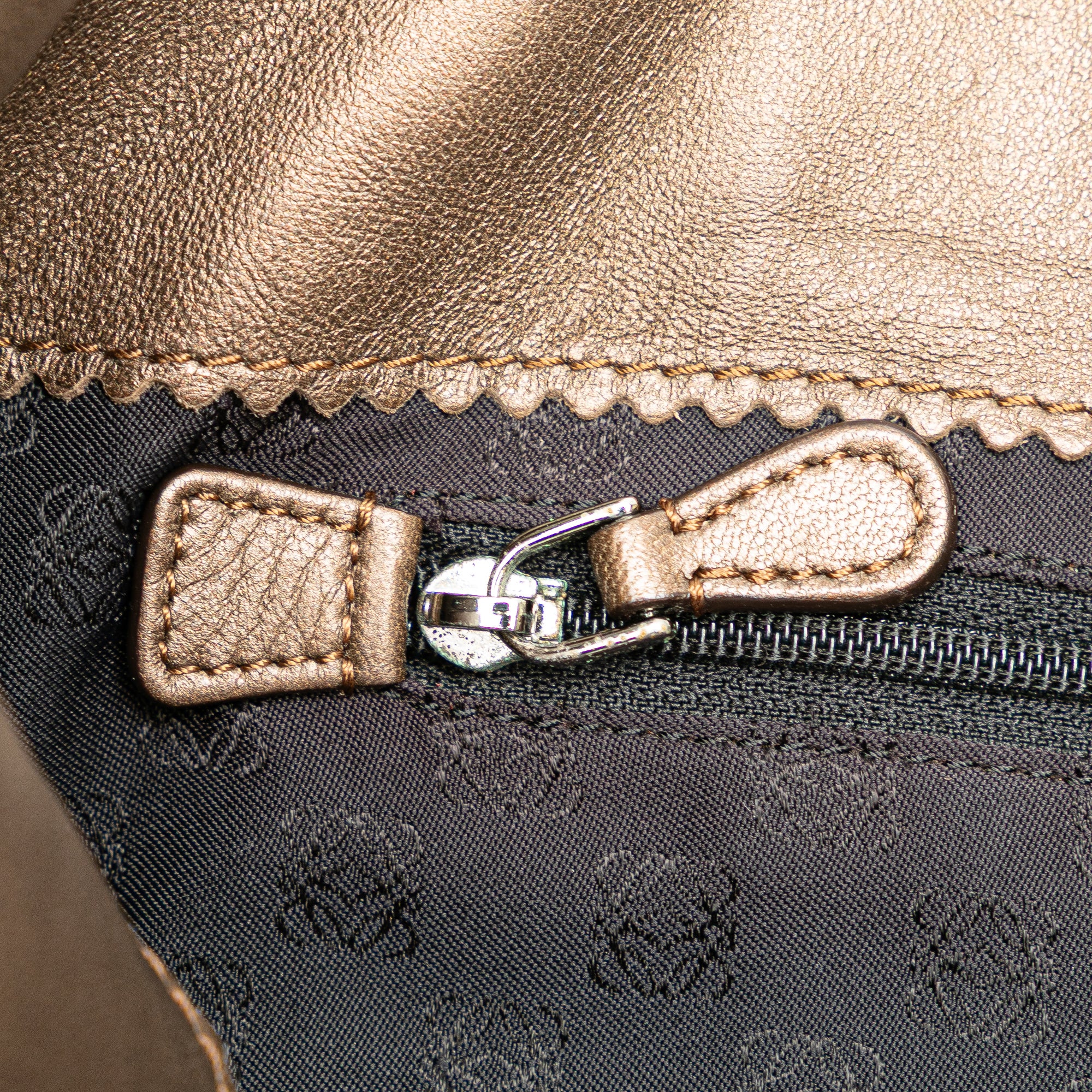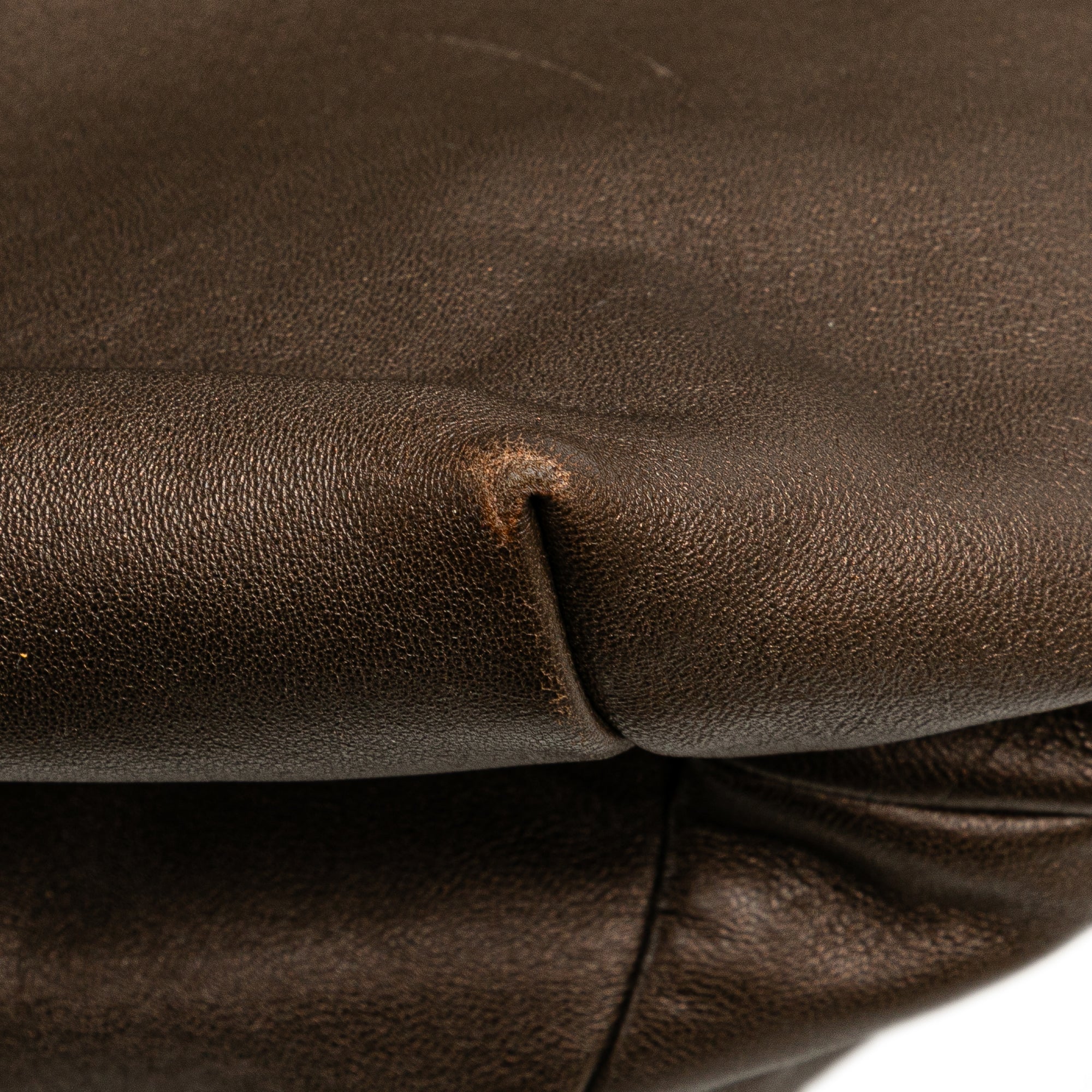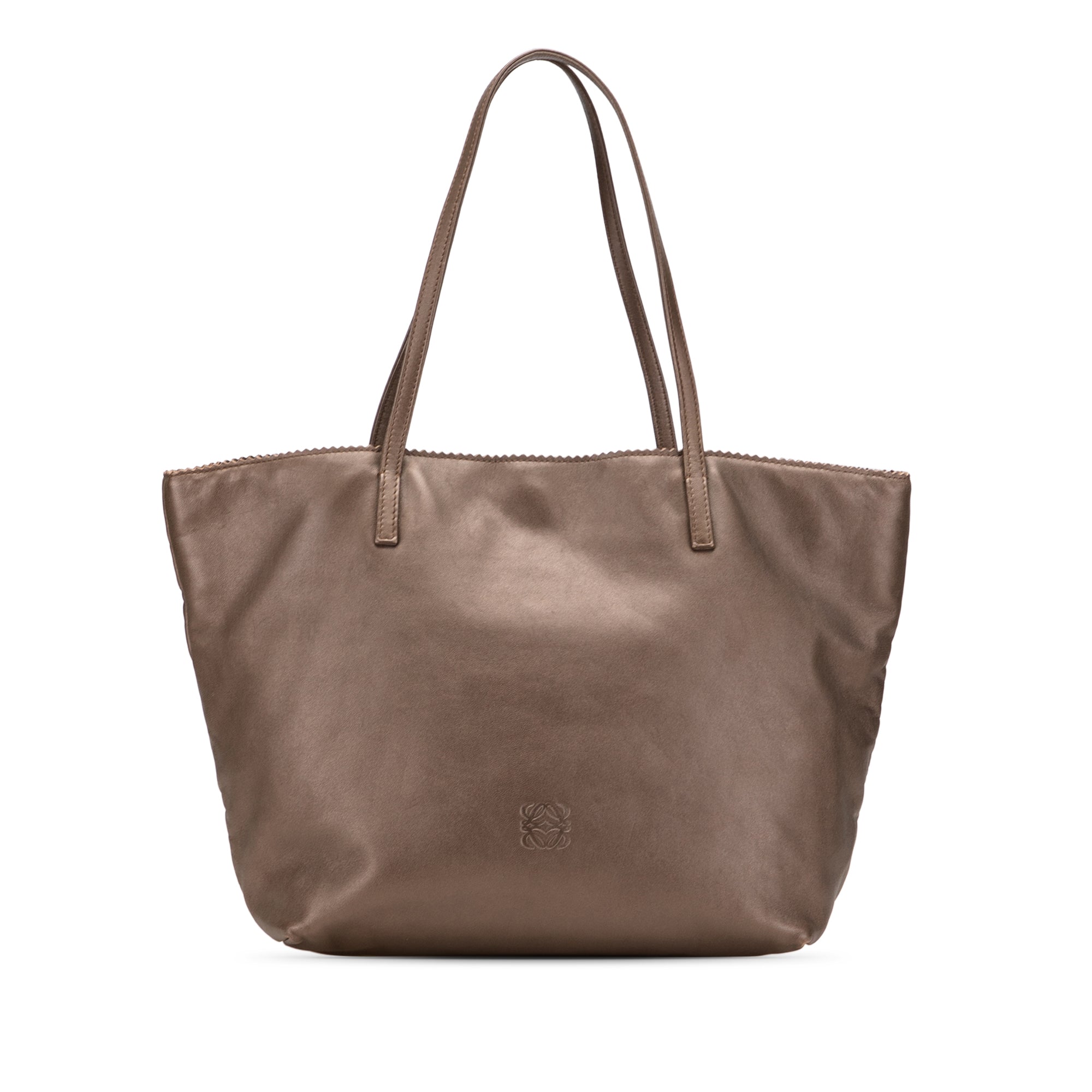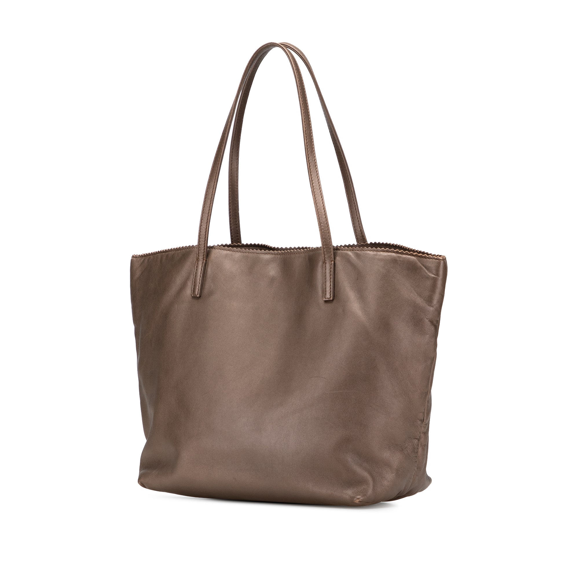 This tote bag features leather body, flat top handles, an open top with magnetic snap closure, and an interior zip pocket. Retail Price: 1200.00