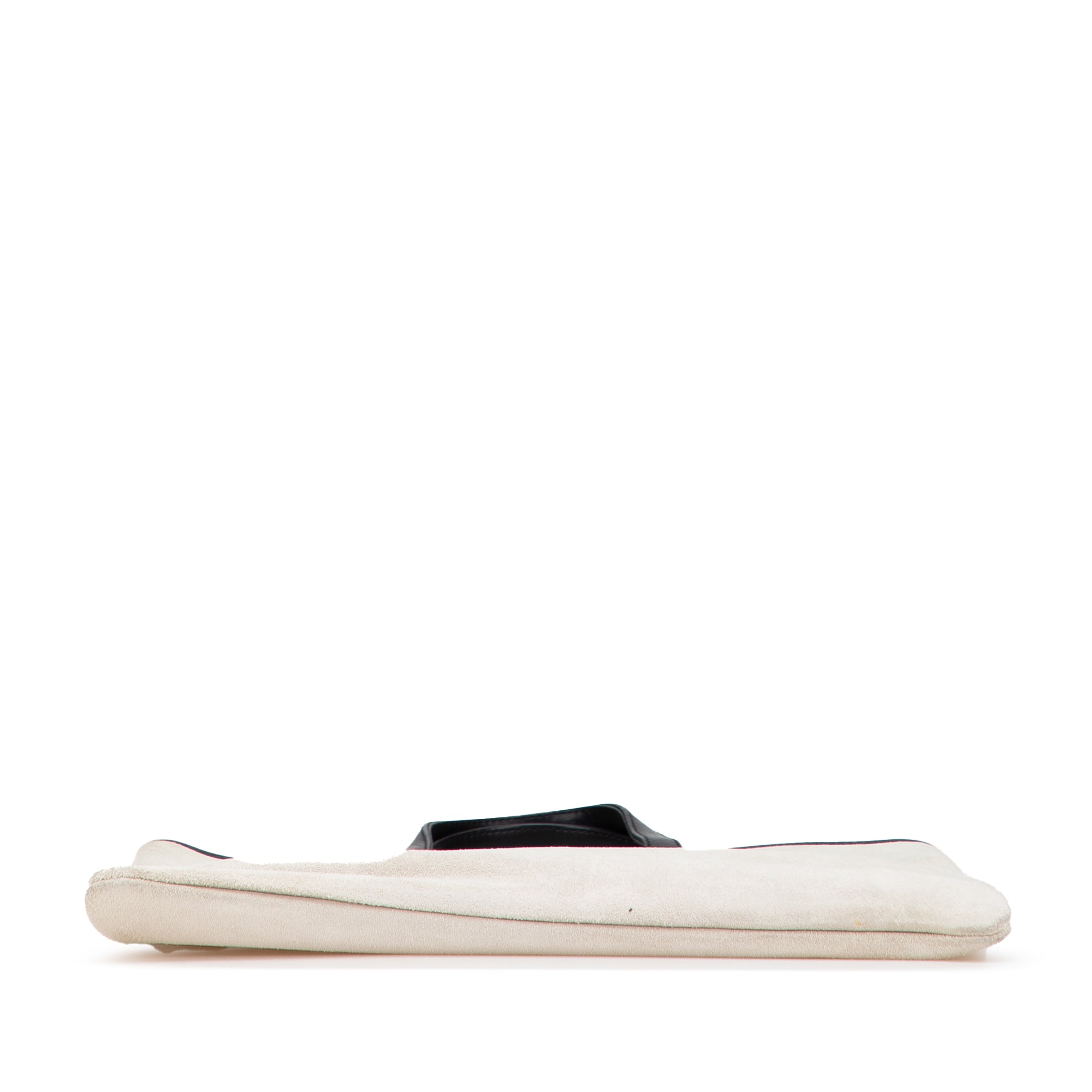 This tote bag features a suede leather body with leather trim, flat leather handles, and an open top with magnetic snap closure. Retail Price: 452.00