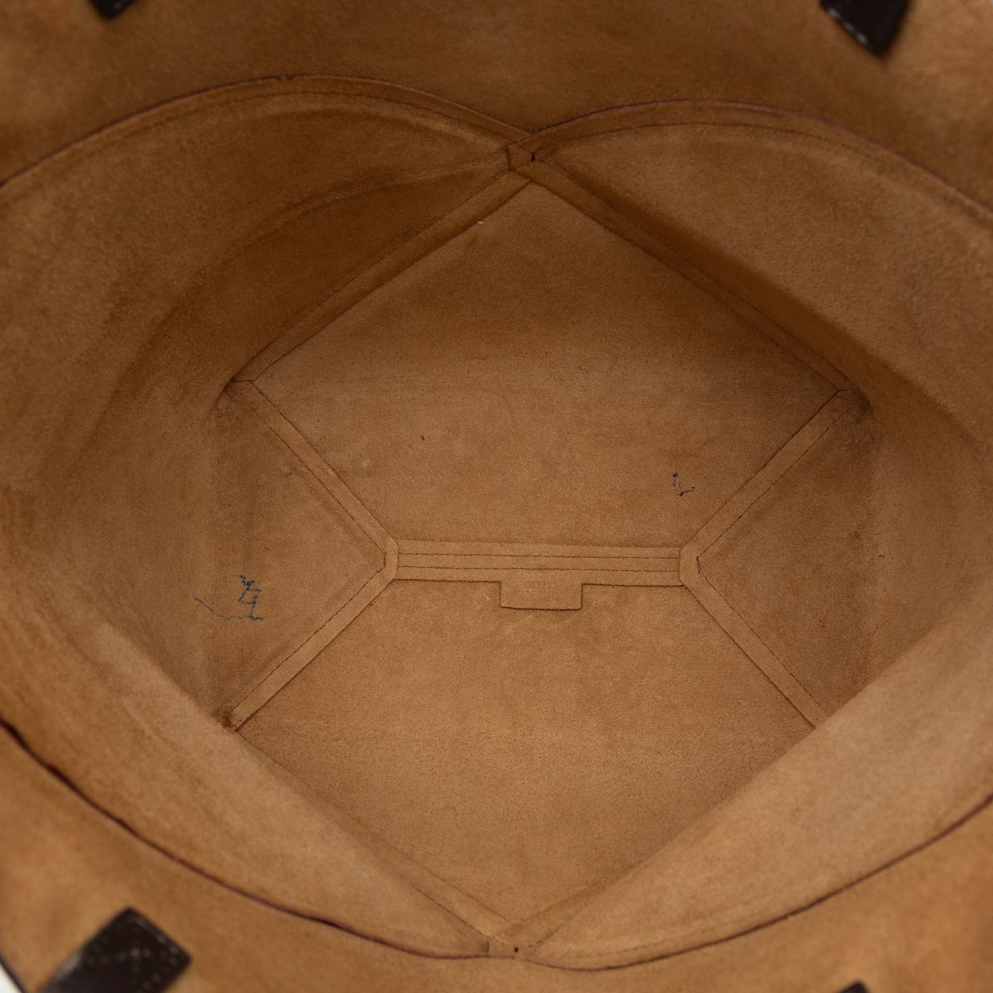This tote bag features a leather body, flat leather straps, and an open top. Retail Price: 1990.00