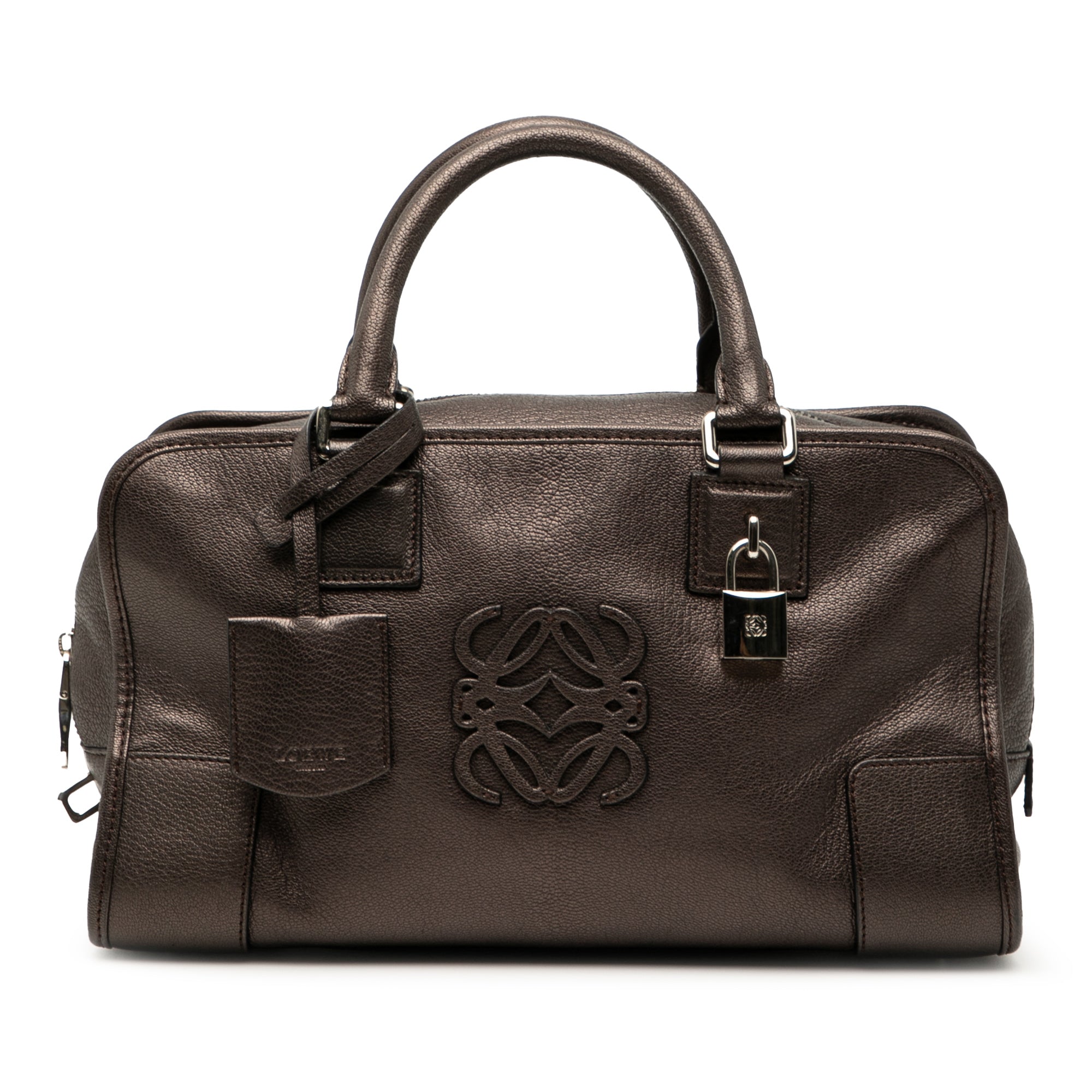 The Amazona 28 features a metallic leather body, rolled leather handles, a top zip closure, and interior zip and slip pockets. Retail Price: 2500.00