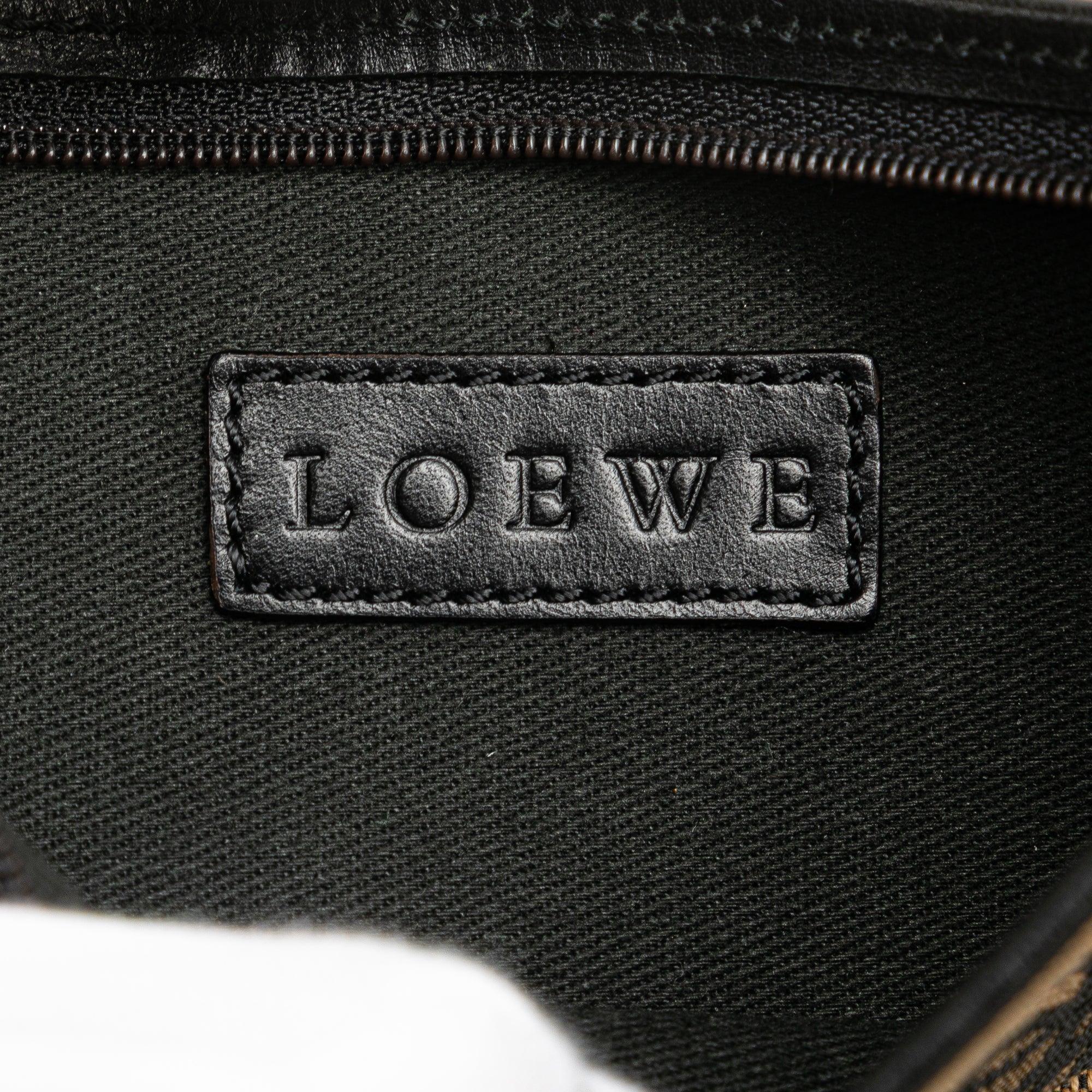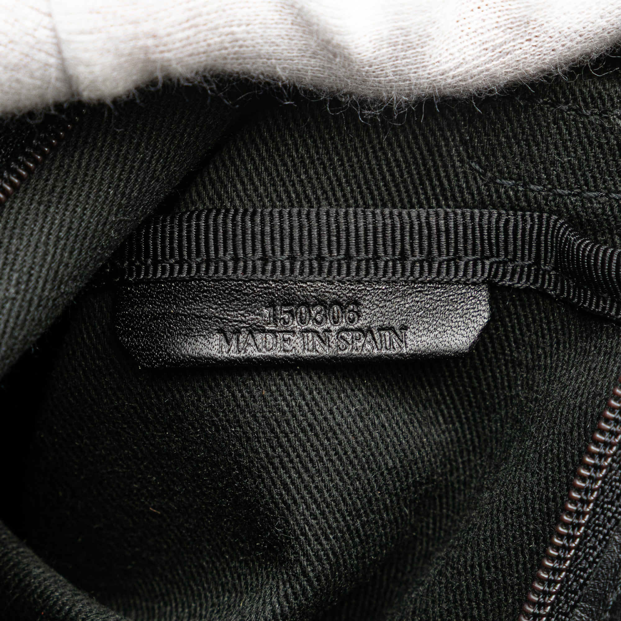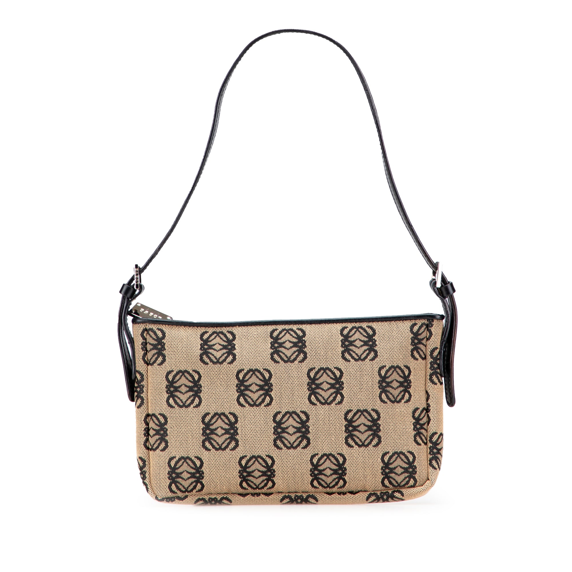 This shoulder bag features a canvas body with leather trim, a flat leather shoulder strap, and a top zip closure. Inclusion: Dust bag. Retail Price: 800.00