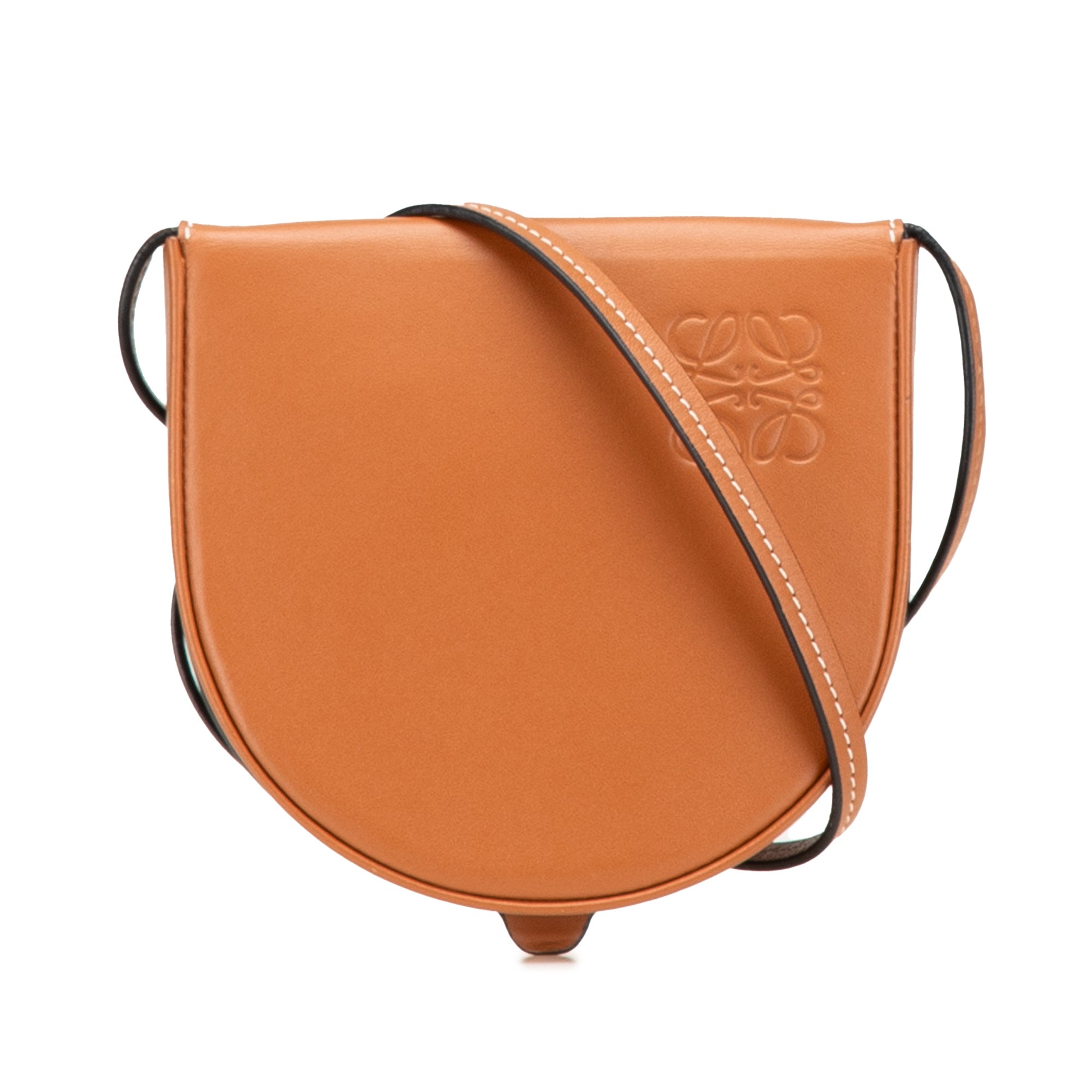 The Heel crossbody bag features a leather body, a flat shoulder strap, a flap closure, and interior card slots. Retail Price: 550.00