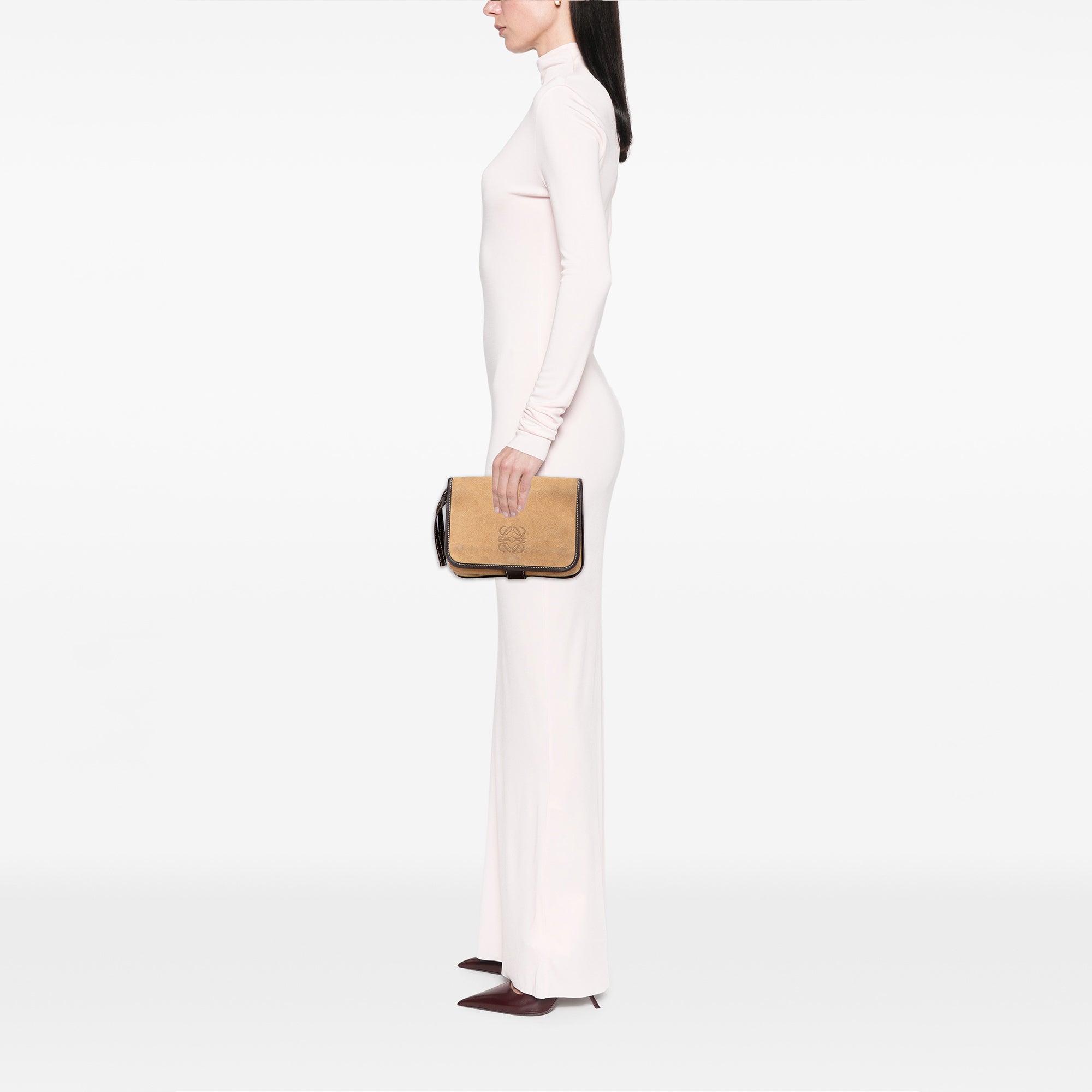 This clutch features a suede body, a flat leather wrist strap, a front flap with snap closure, double zip compartment and an interior slip pocket. Retail Price: 450.00