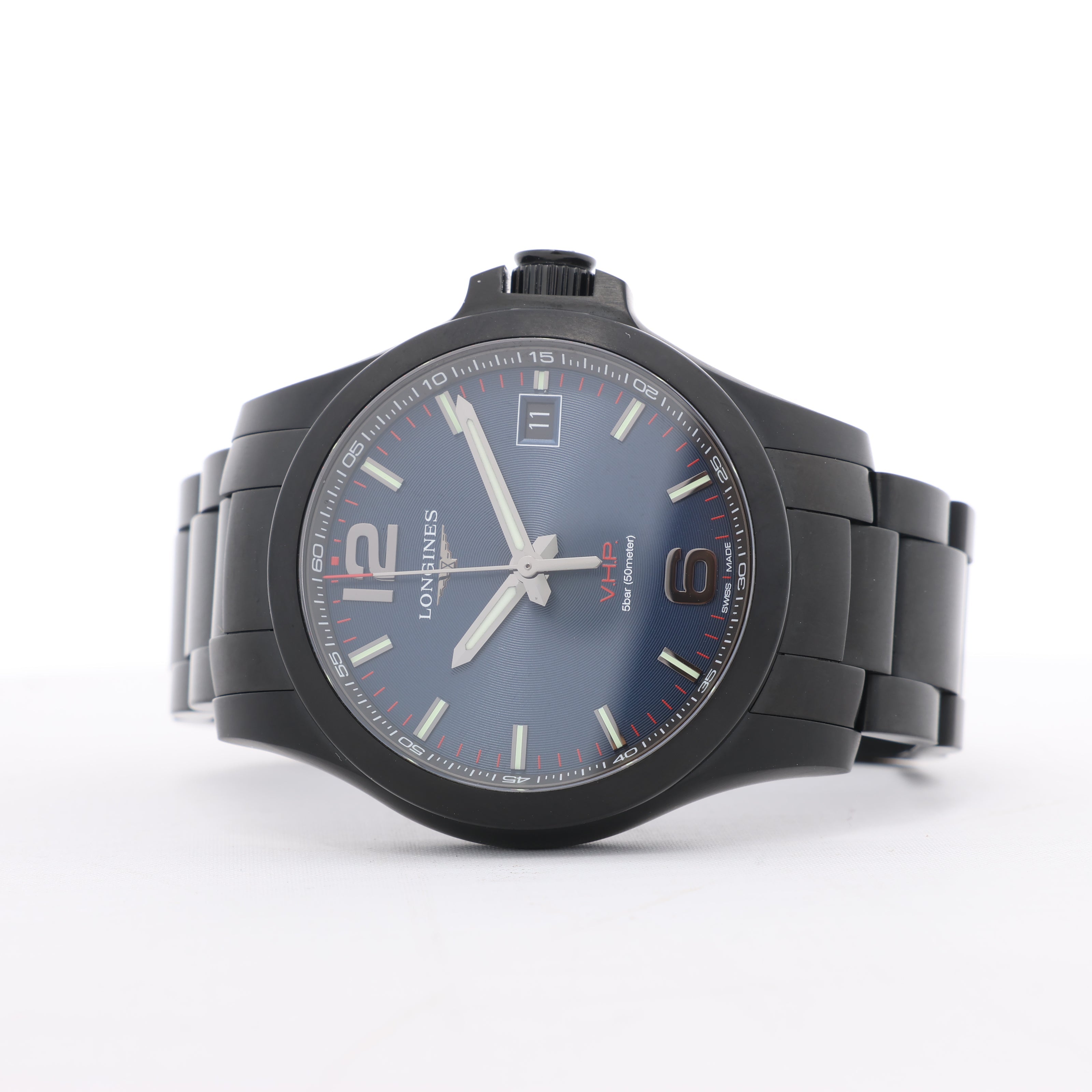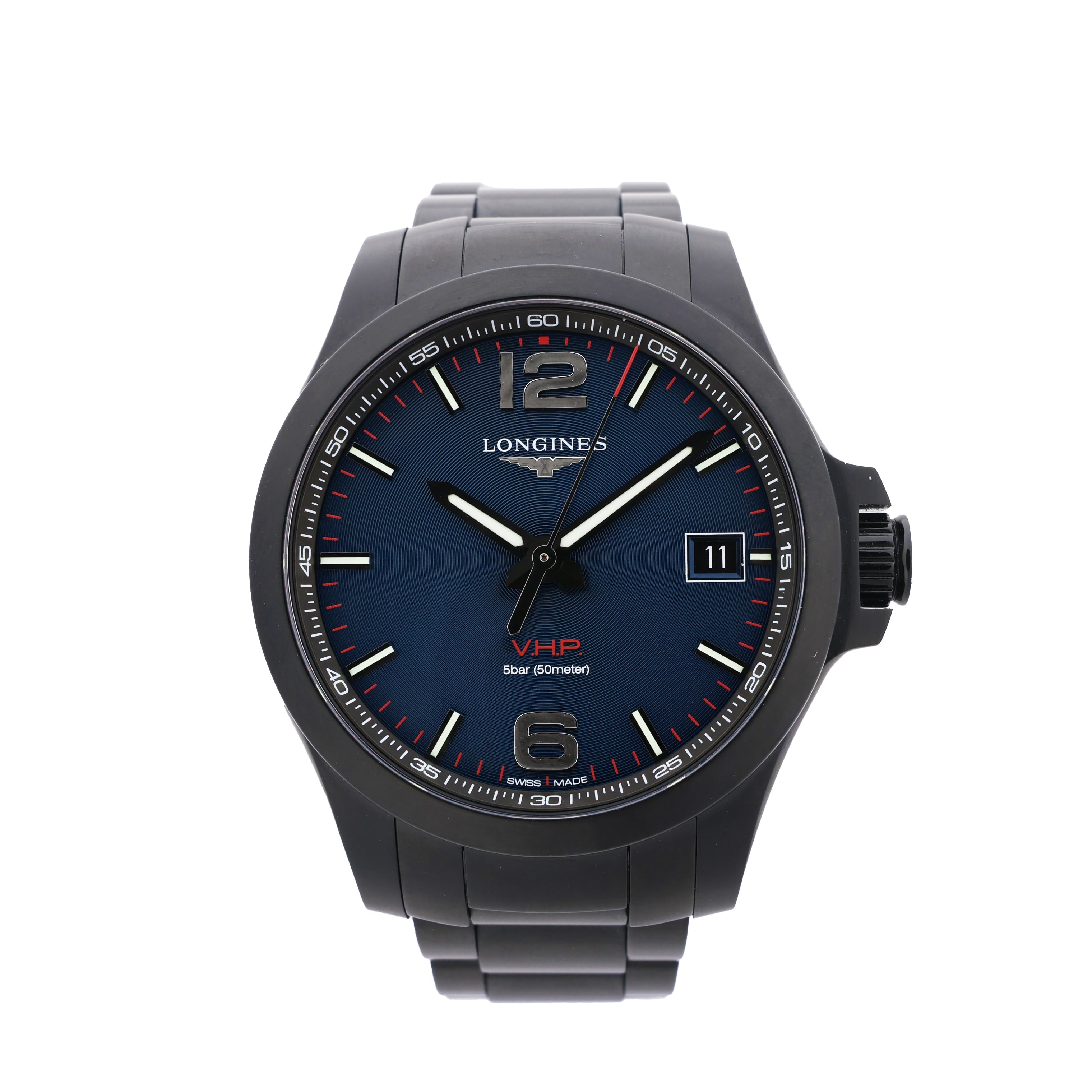 Longines Conquest L3.716.2.96.6 features a bold blue dial, black-coated stainless steel case and bracelet, and V.H.P. quartz precision. A sporty yet refined timepiece built for high-performance style.