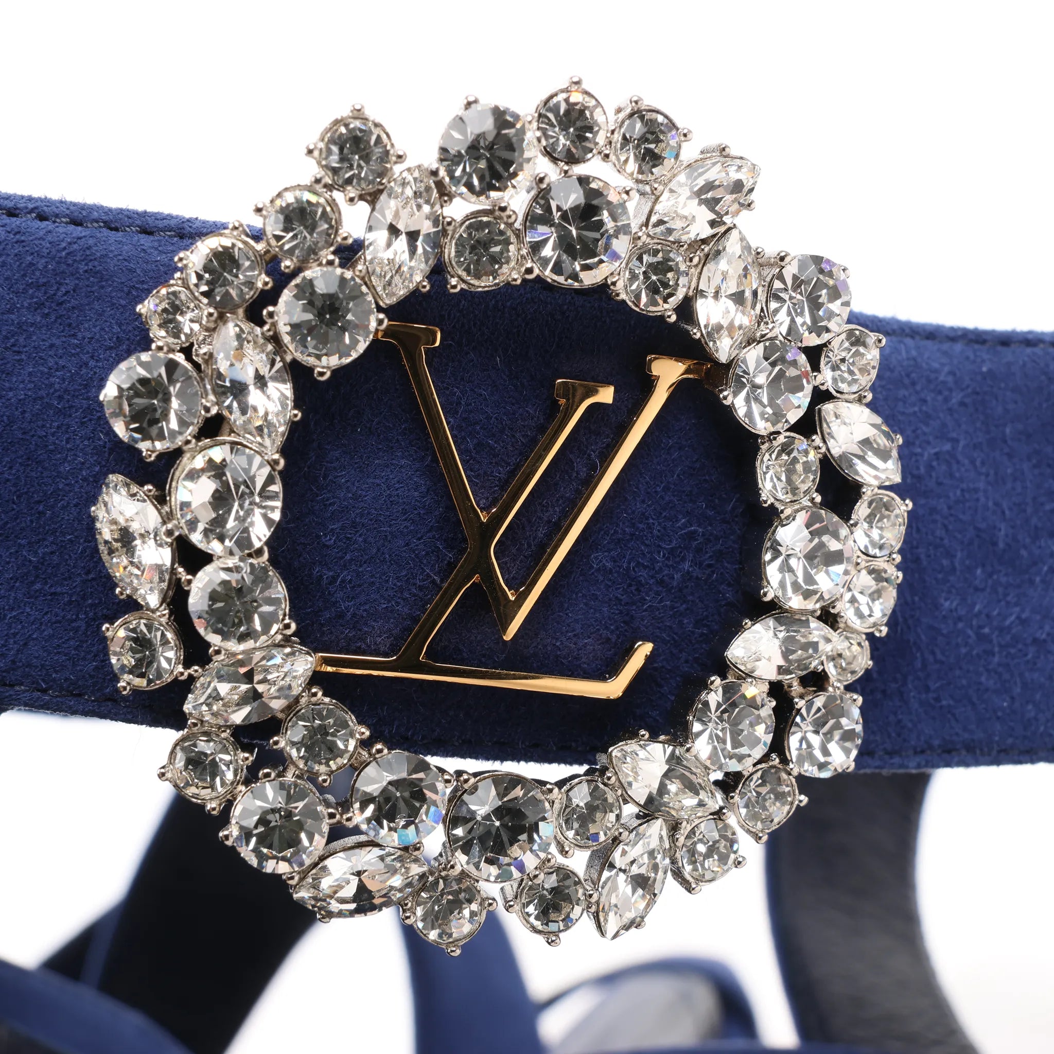 Turn heads with these Louis Vuitton 19-Year Heels in navy blue suede, featuring bold platform soles, strappy design, and a dazzling crystal LV logo buckle. Elegant yet striking, these size 38 EU heels are made for glamorous occasions.