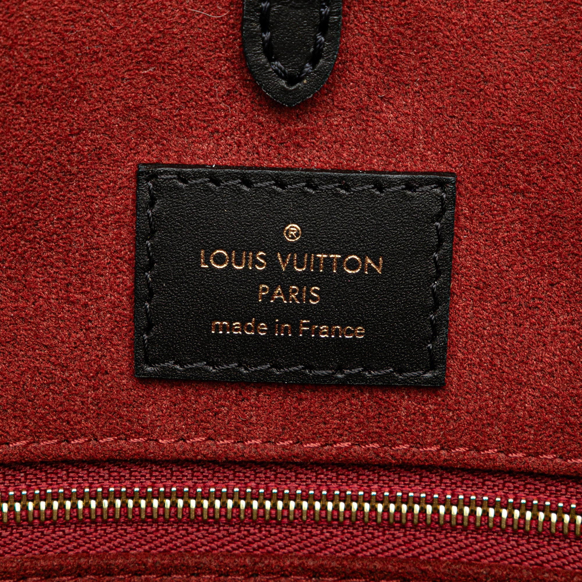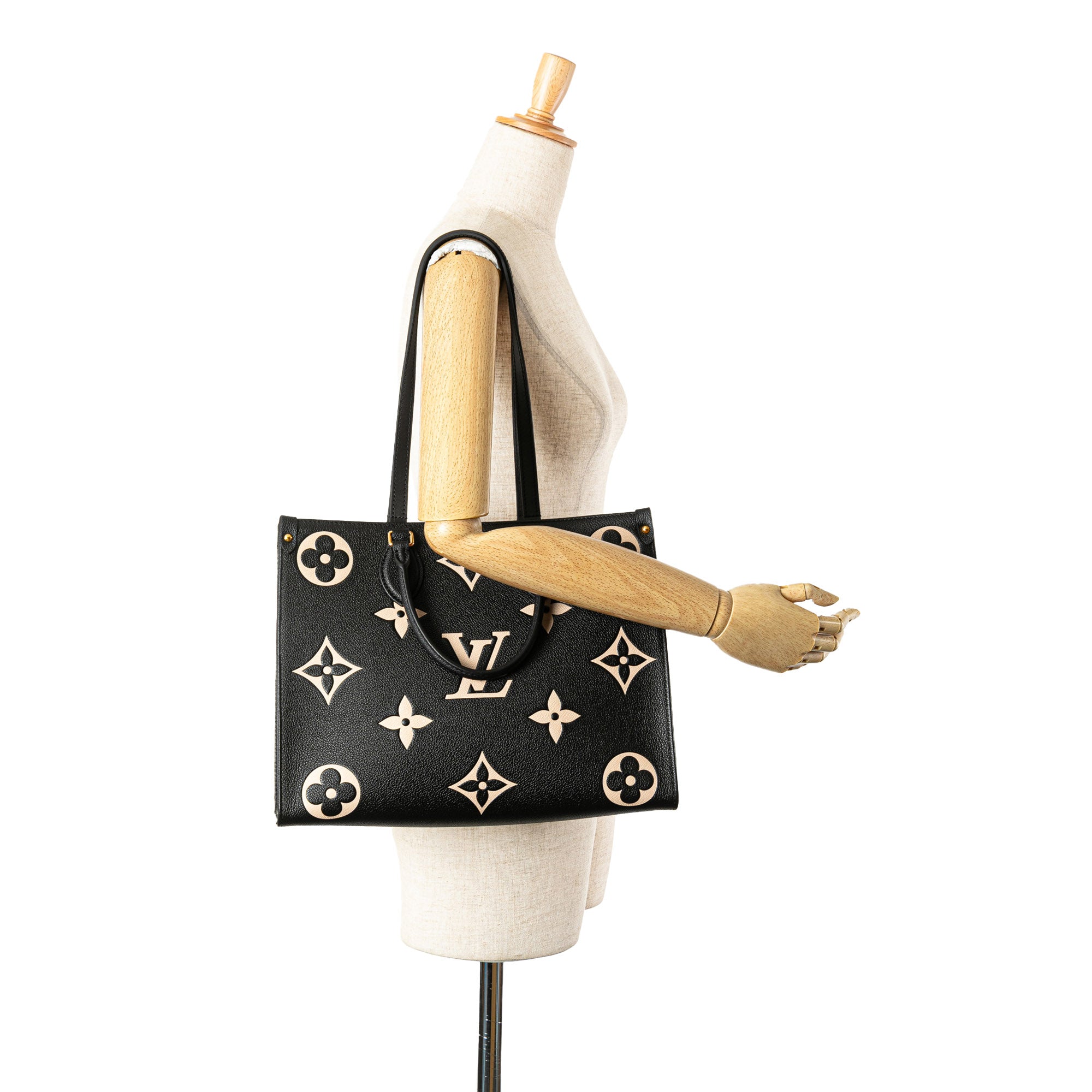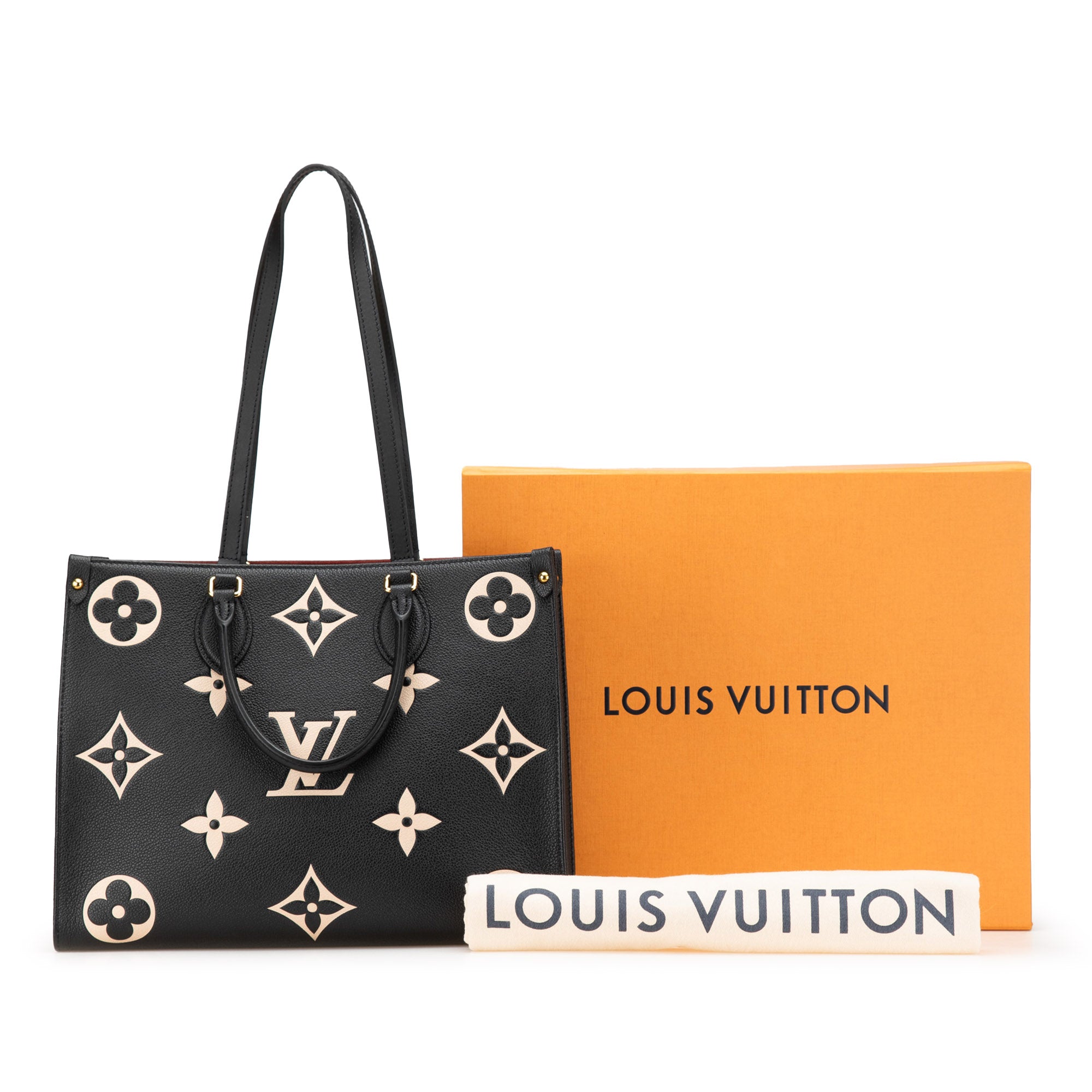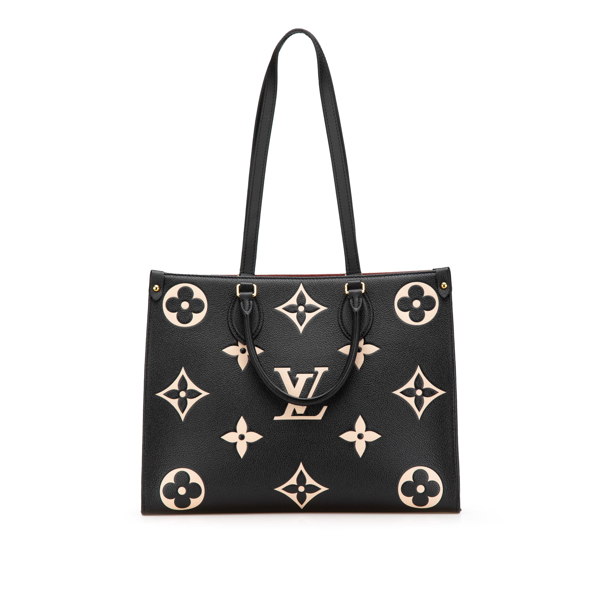 The Onthego MM features a monogram empreinte leather body, rolled leather handles, flat leather shoulder handles, an open top with lobster clasp closure, and interior zip and slip pockets. Inclusion: Dust bag, box. Retail Price: 3235.00